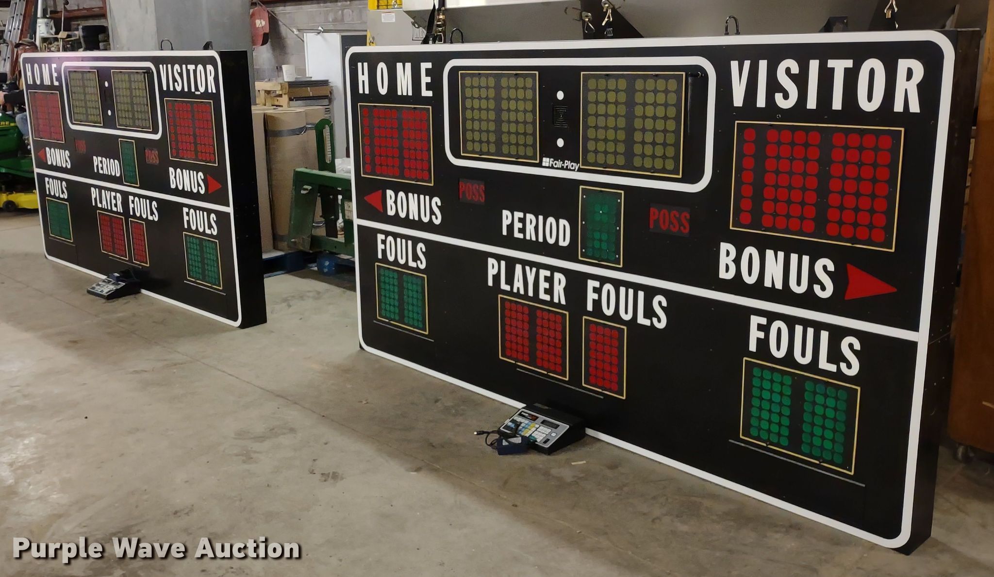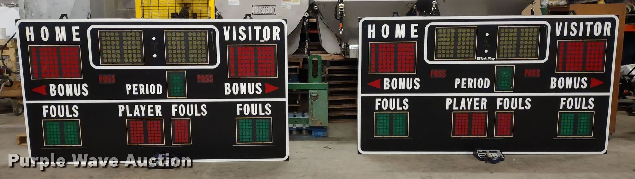 Purple Wave is selling a used Sporting Goods in Kansas. This item is a (2) Fair-Play BB-6620 scoreboards with the following: (2) control boxes, Volts: 120
