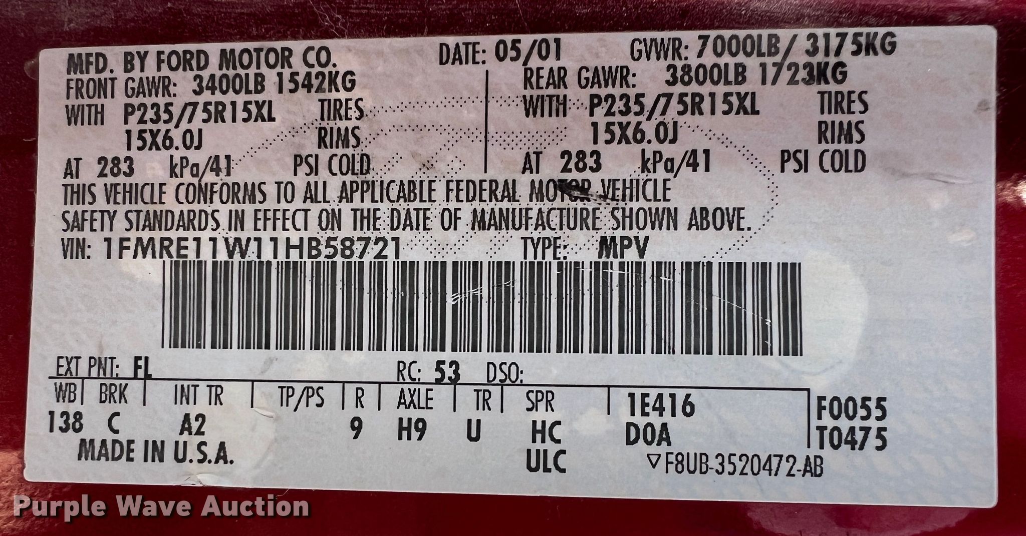 2001 Ford E150 XL van. Miles: 542,926 on odometer, VIN: 1FMRE11W11HB58721. Engine Displacement: 4.6L V8 SOHC, Cylinders: 8, Fuel type: Gas. Transmission Automatic. Interior AC, Heat, Cruise control. Tires Size: 235/75R15. Kansas title. Title distribution may be delayed up to 14 days from verification of funds. USD 101. 521 W State St. Erie, KS 66733