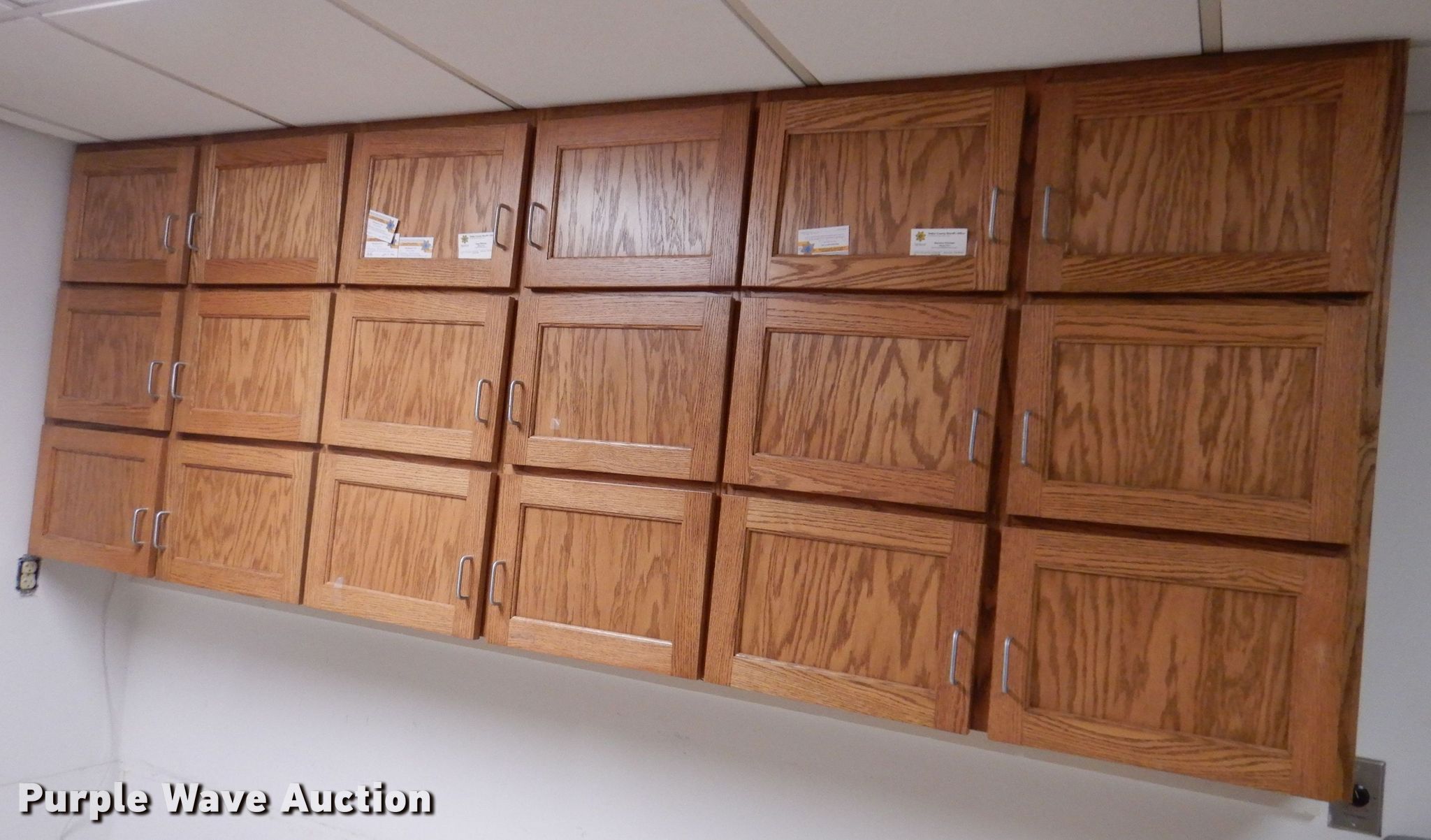 Purple Wave is selling a used Building Materials in Iowa. This item is a Cabinets with the following: Wall cabinets, 111" x 13" x 40", 183" x 12" x 40", Floor cabinets, 183" x 25" x 29", Countertops, Contents and items not included