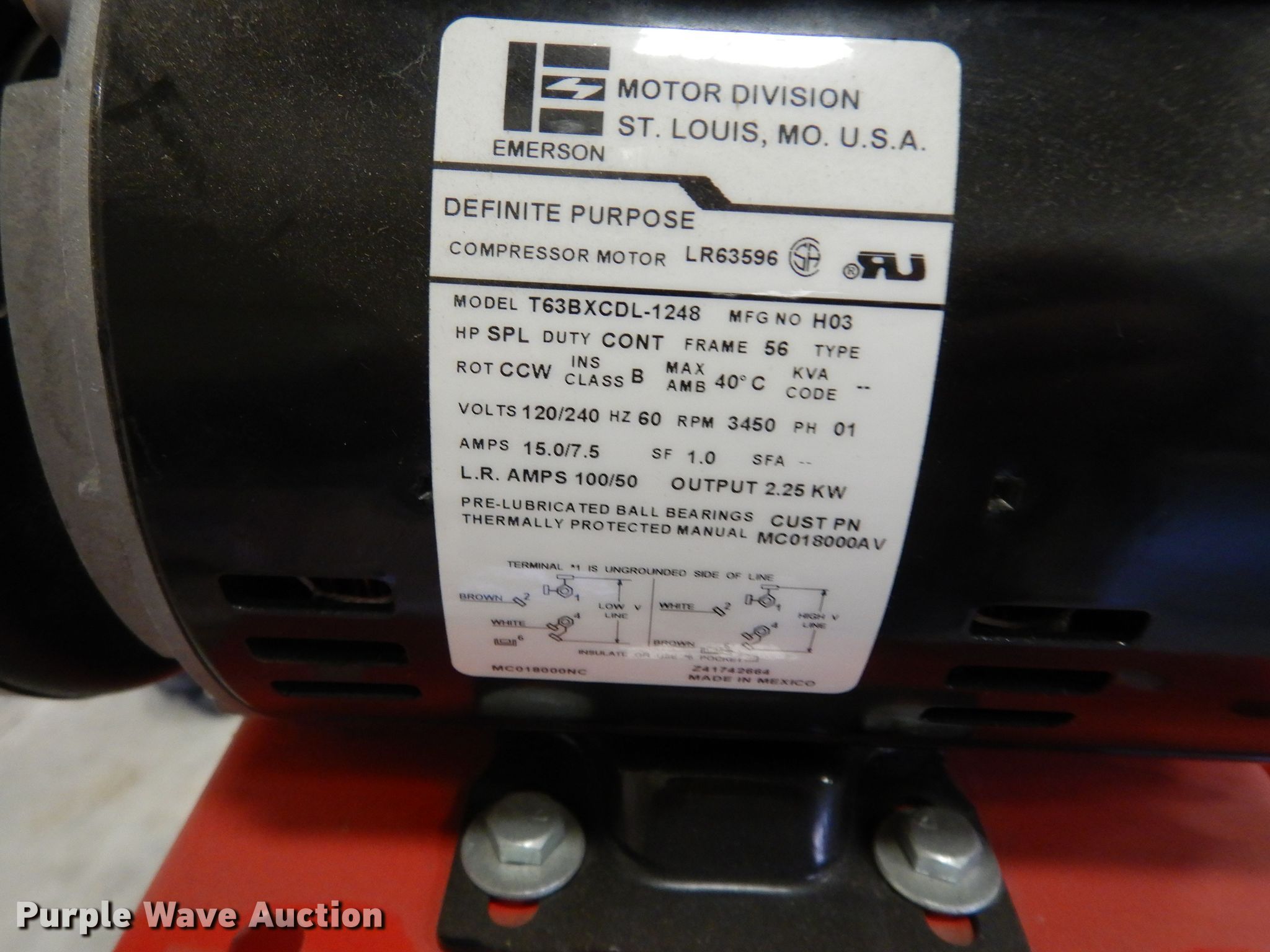 Husky VT631502AJ air compressor. Serial: L10160300366. Electric Motor Phase: Single. Features Air compressor Tank capacity: 26 gallons. Fort Leavenworth, KS 66027