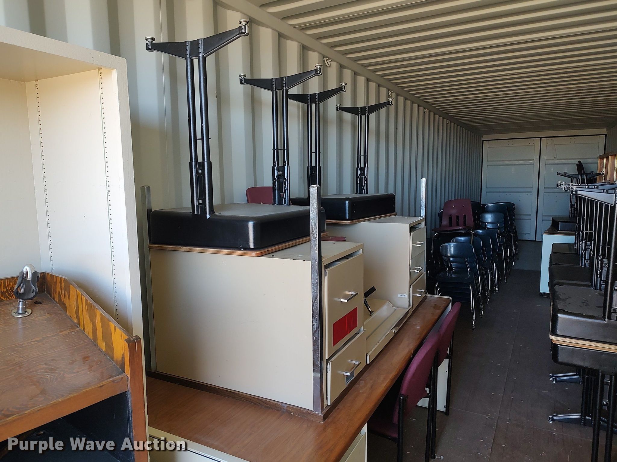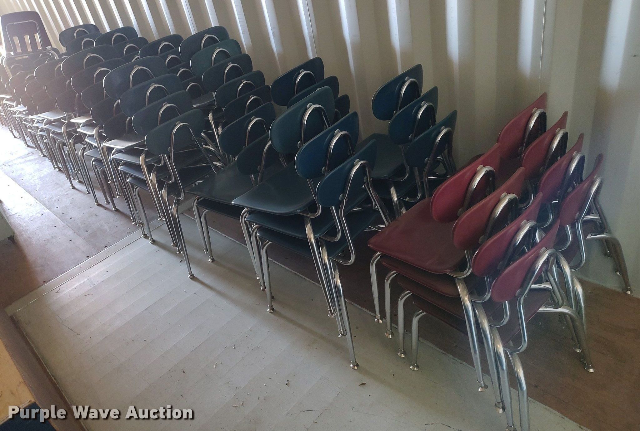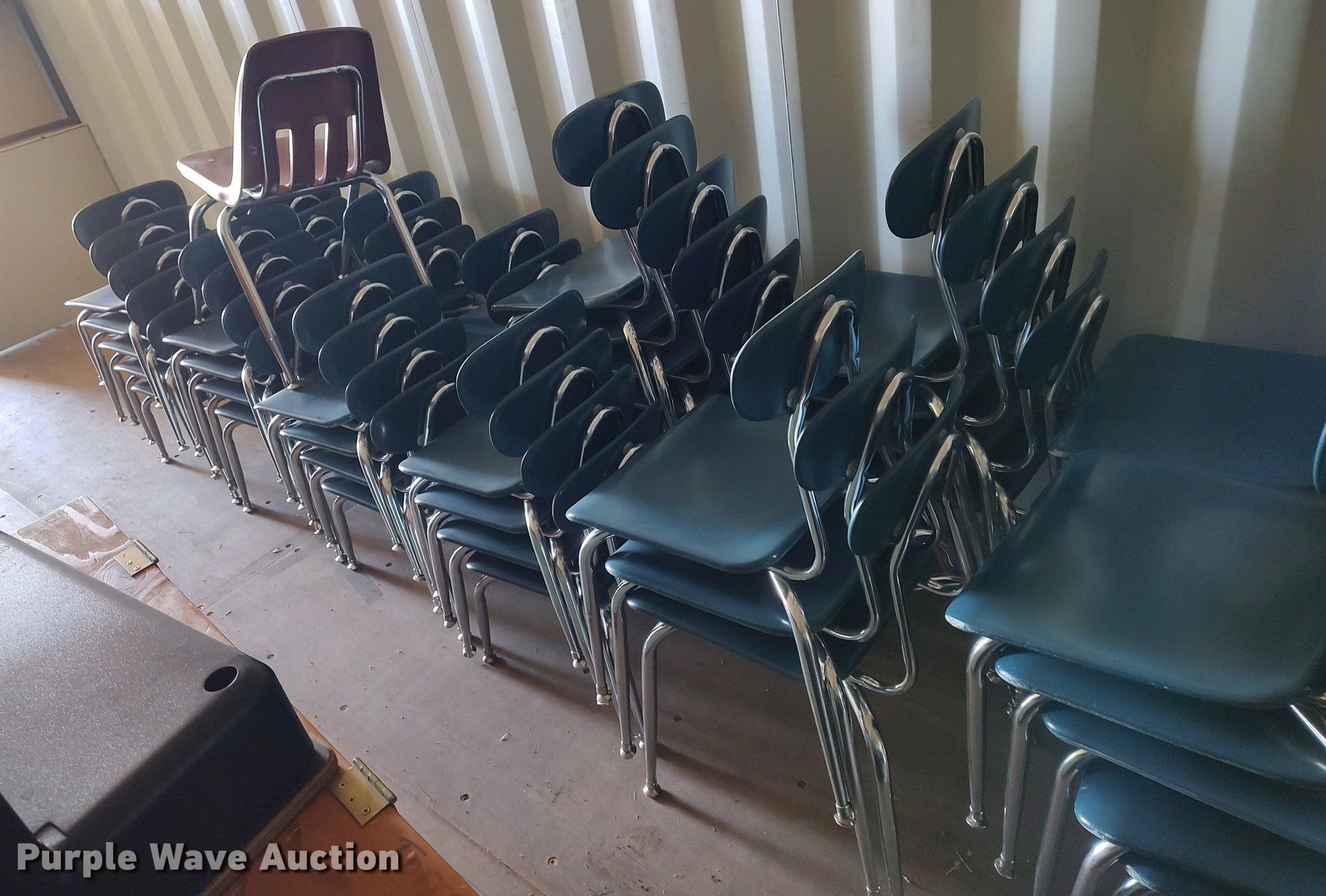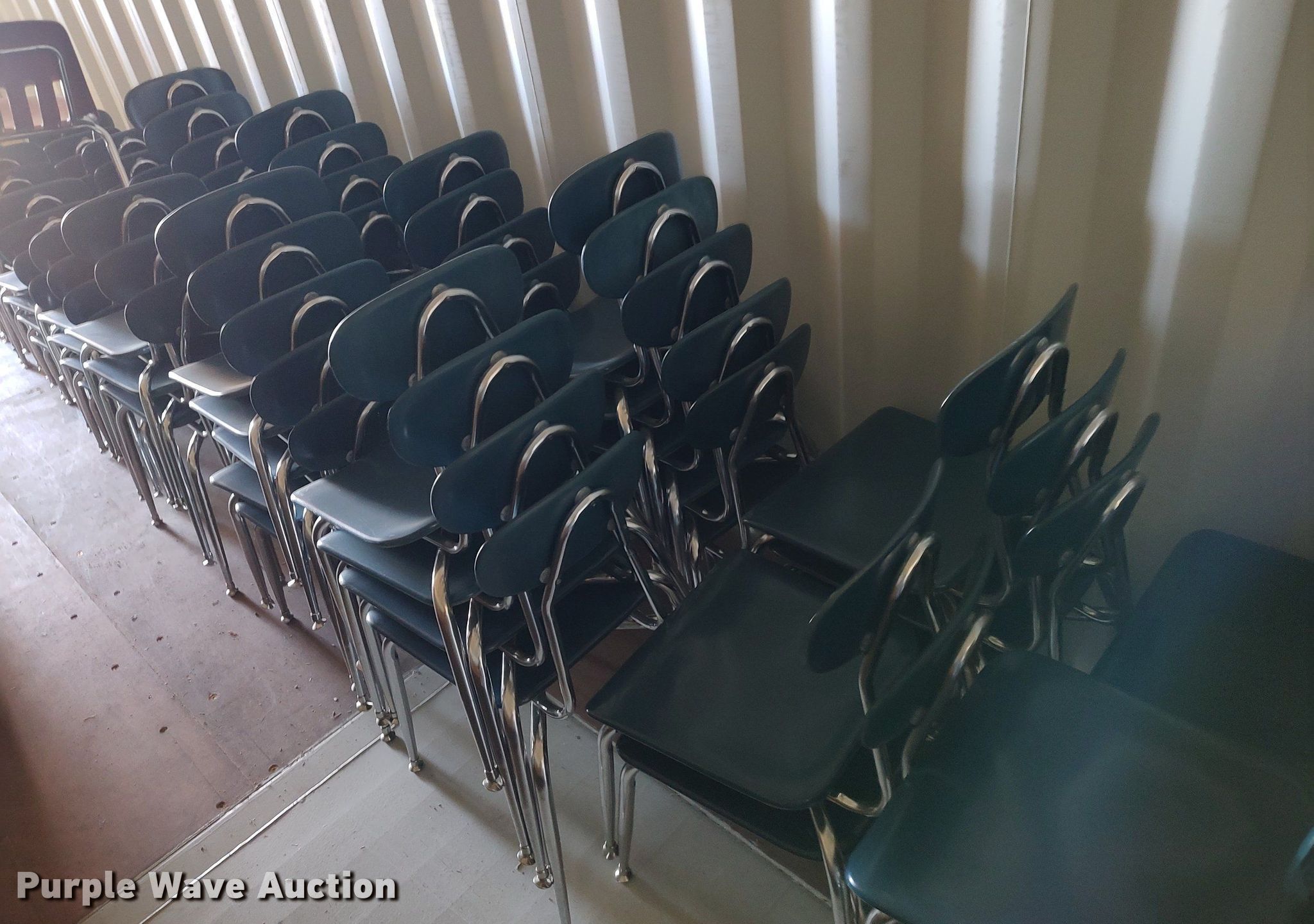 Purple Wave is selling a used Furniture in Kansas. This item is a Furniture with the following: Approx. 90 chairs, Approx. 4 tables, Approx. 14 desks, File cabinets and more
