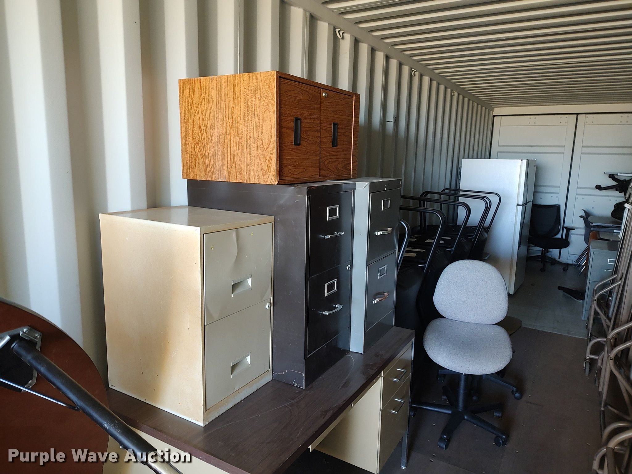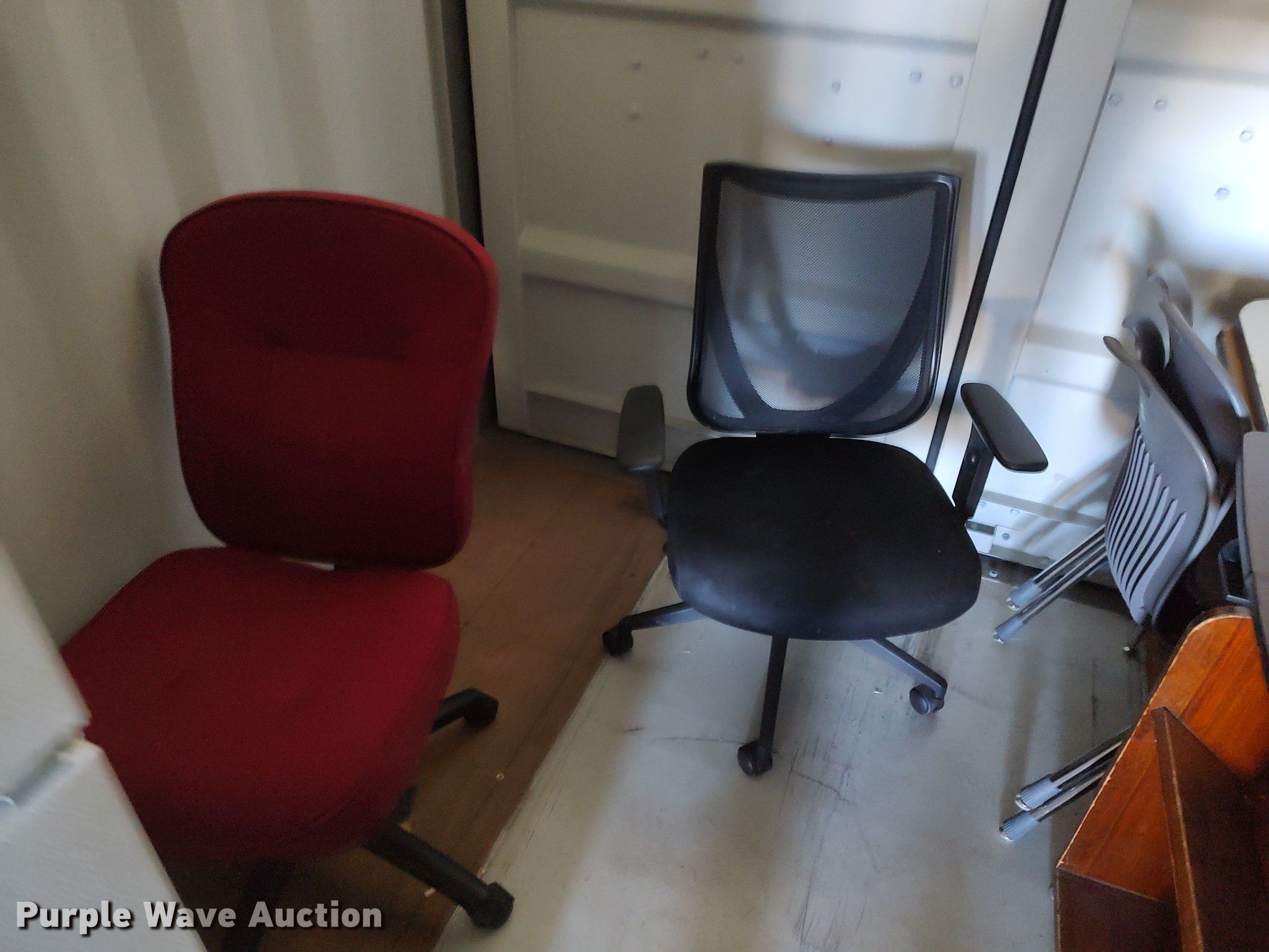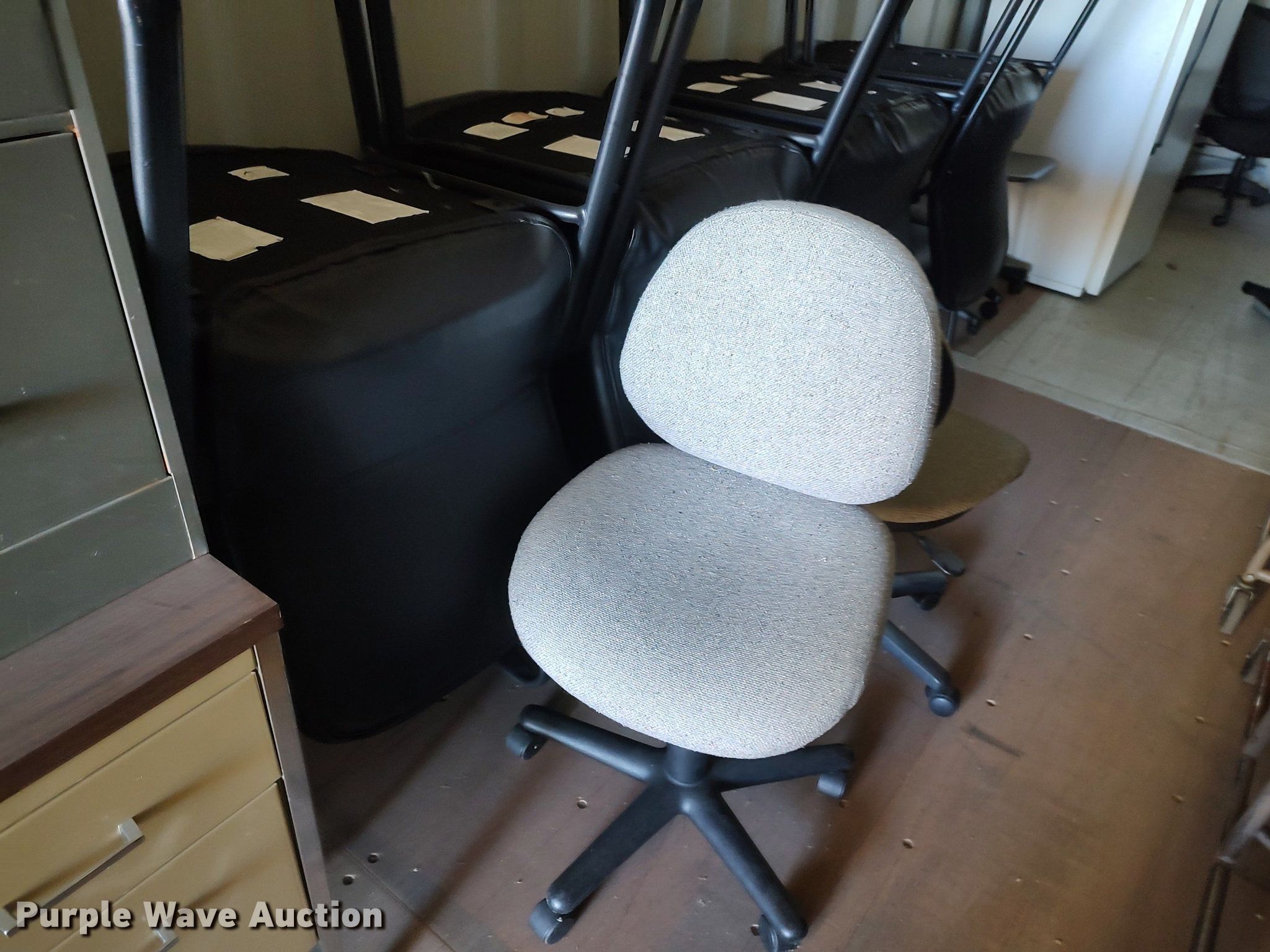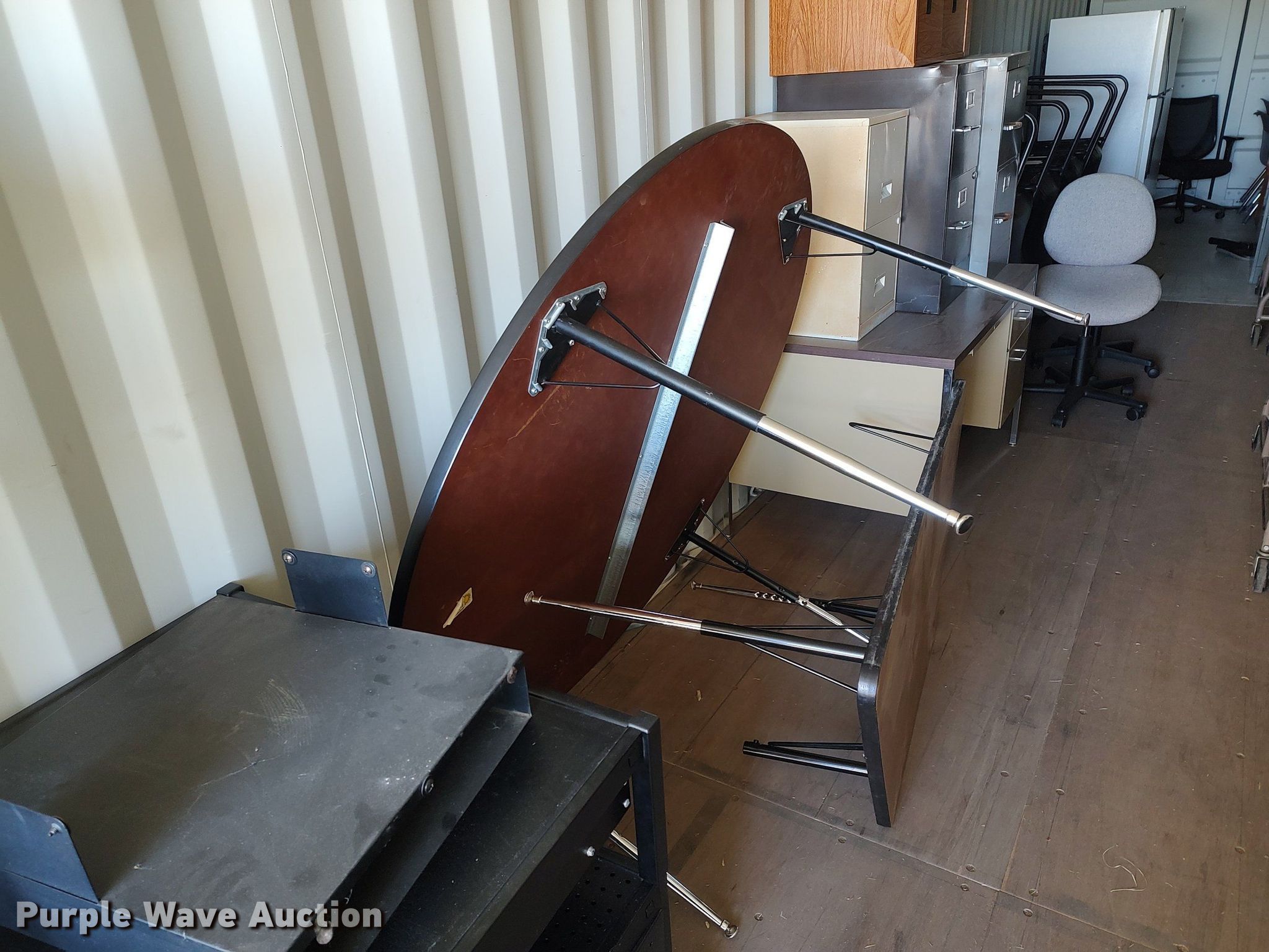 Purple Wave is selling a used Furniture in Kansas. This item is a Furniture with the following: (20) chairs, (4) tables, (4) desks, (3) folding tables, (5) entertainment carts, File cabinets, Refrigerator and more