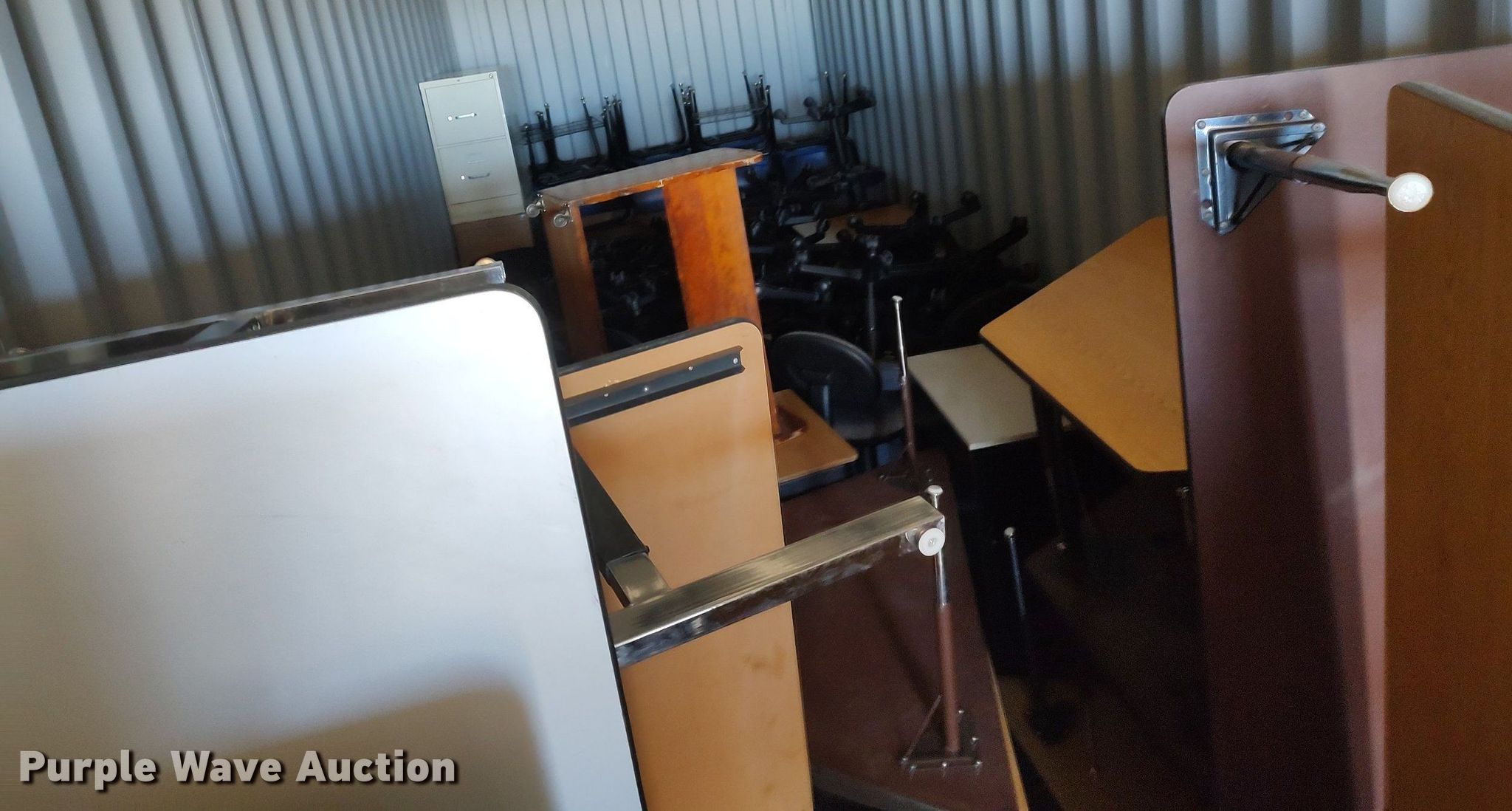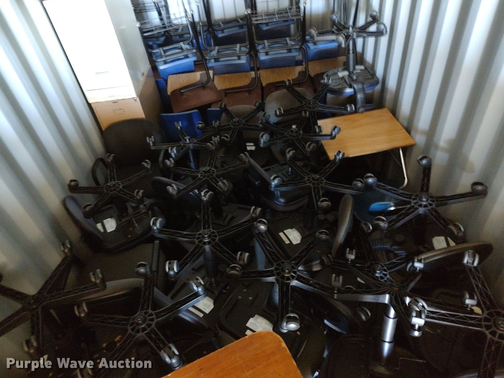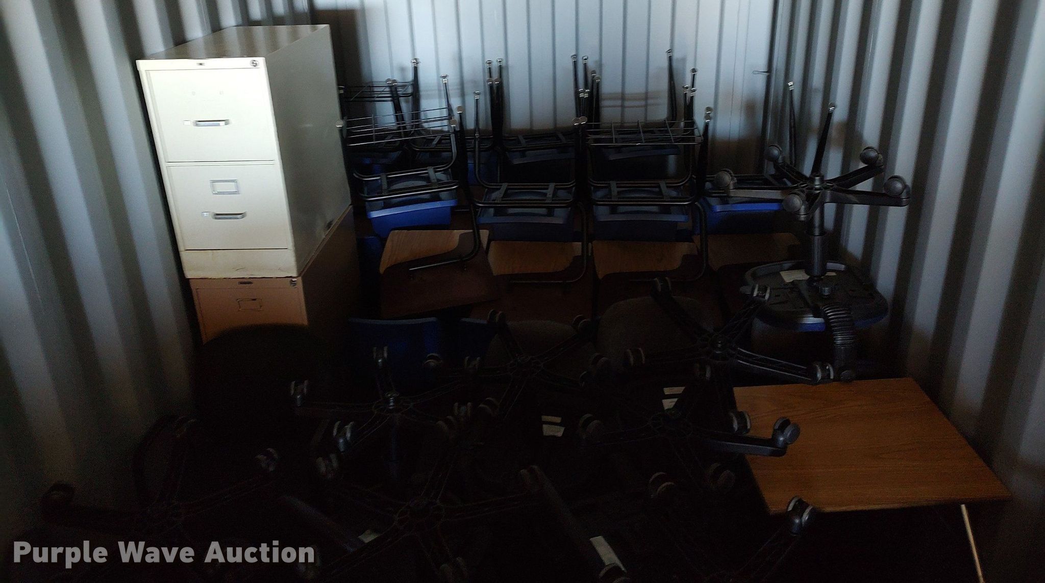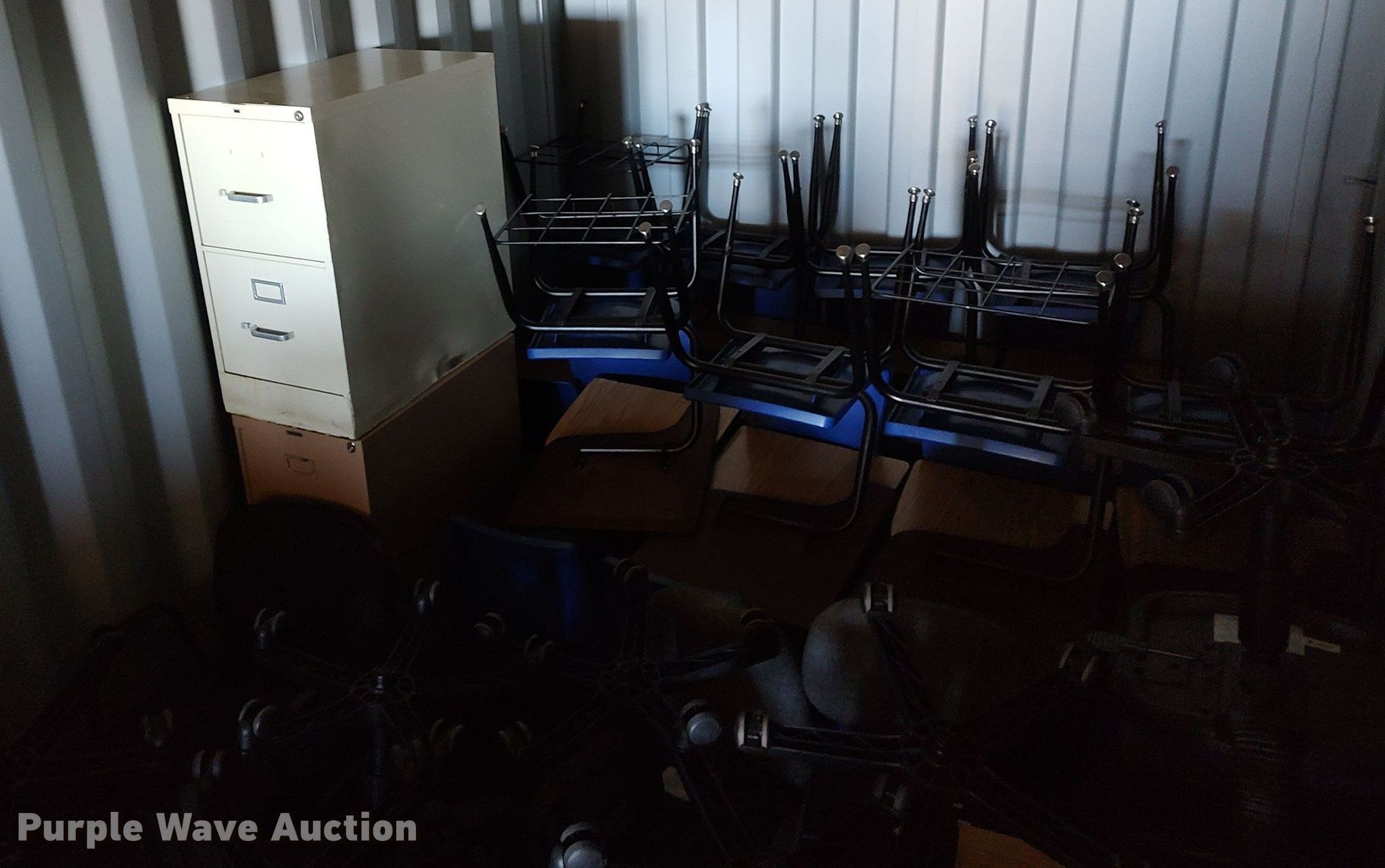Purple Wave is selling a used Furniture in Kansas. This item is a Furniture with the following: Approx. 34 chairs, Approx. 13 tables, Approx. 18 desks, (7) folding tables, File cabinets and more