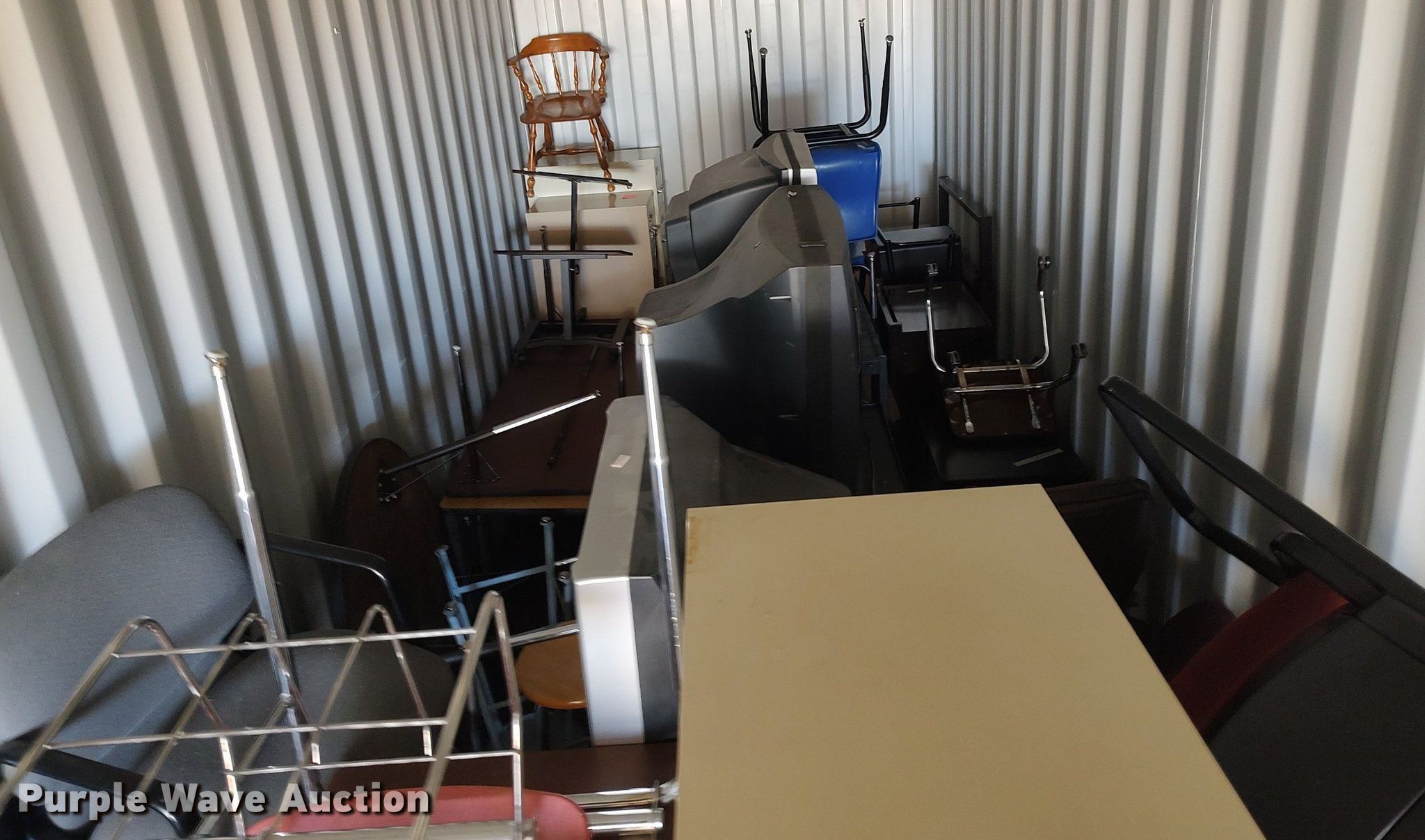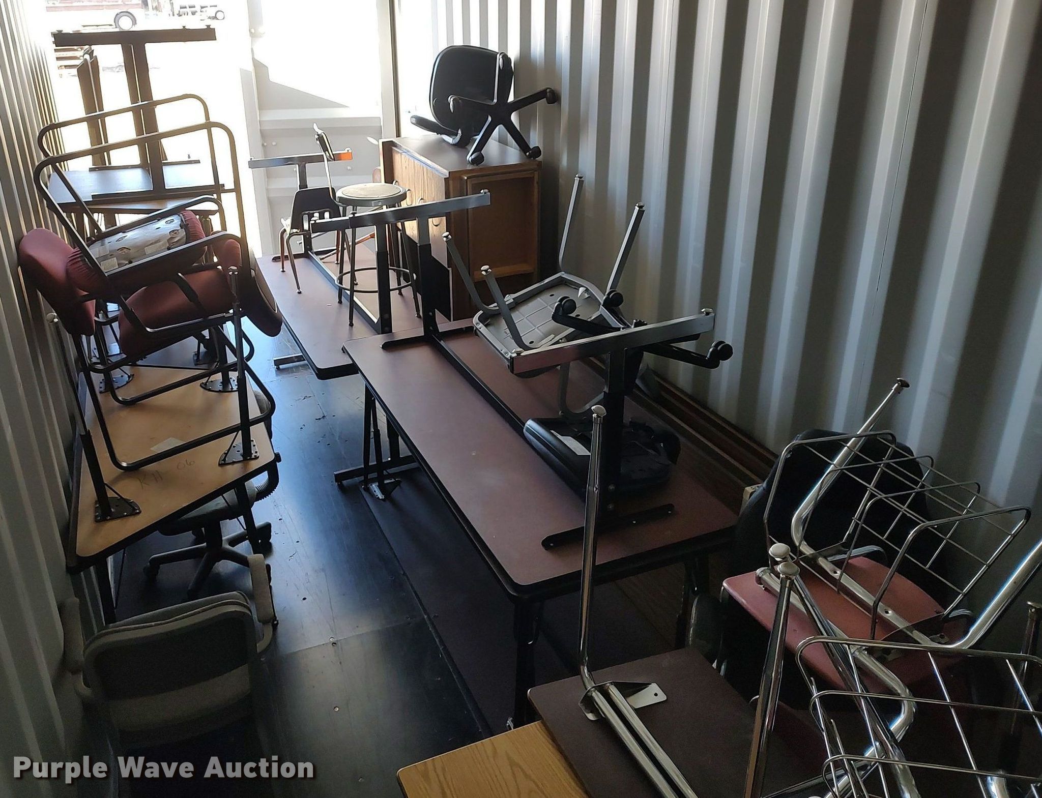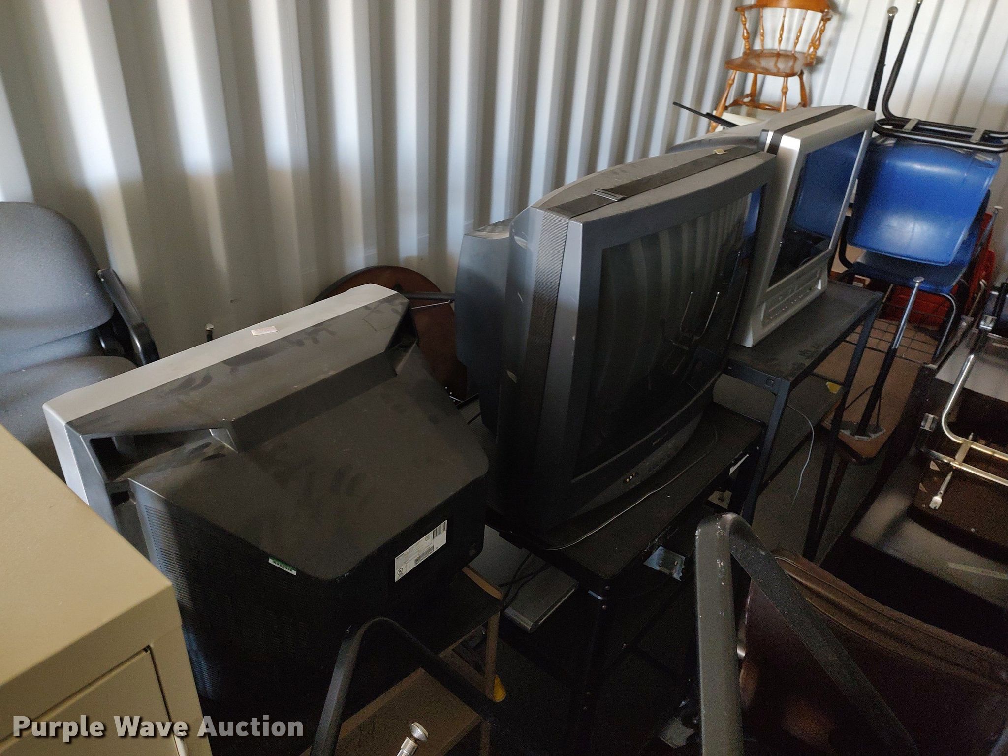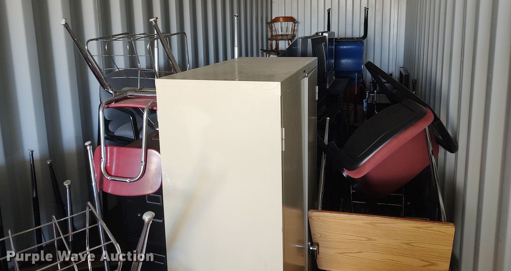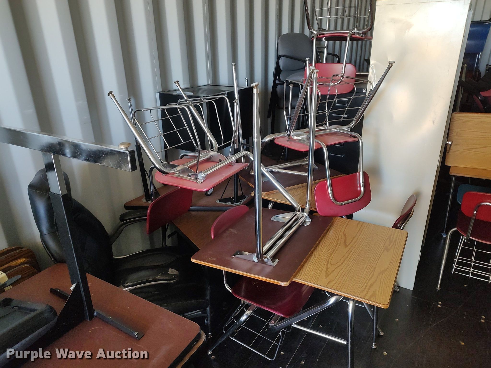 Purple Wave is selling a used Furniture in Kansas. This item is a Furniture with the following: Approx. 18 chairs, Approx. 18 tables, Approx. 10 desks, (3) entertainment carts, (3) televisions, File cabinets and more