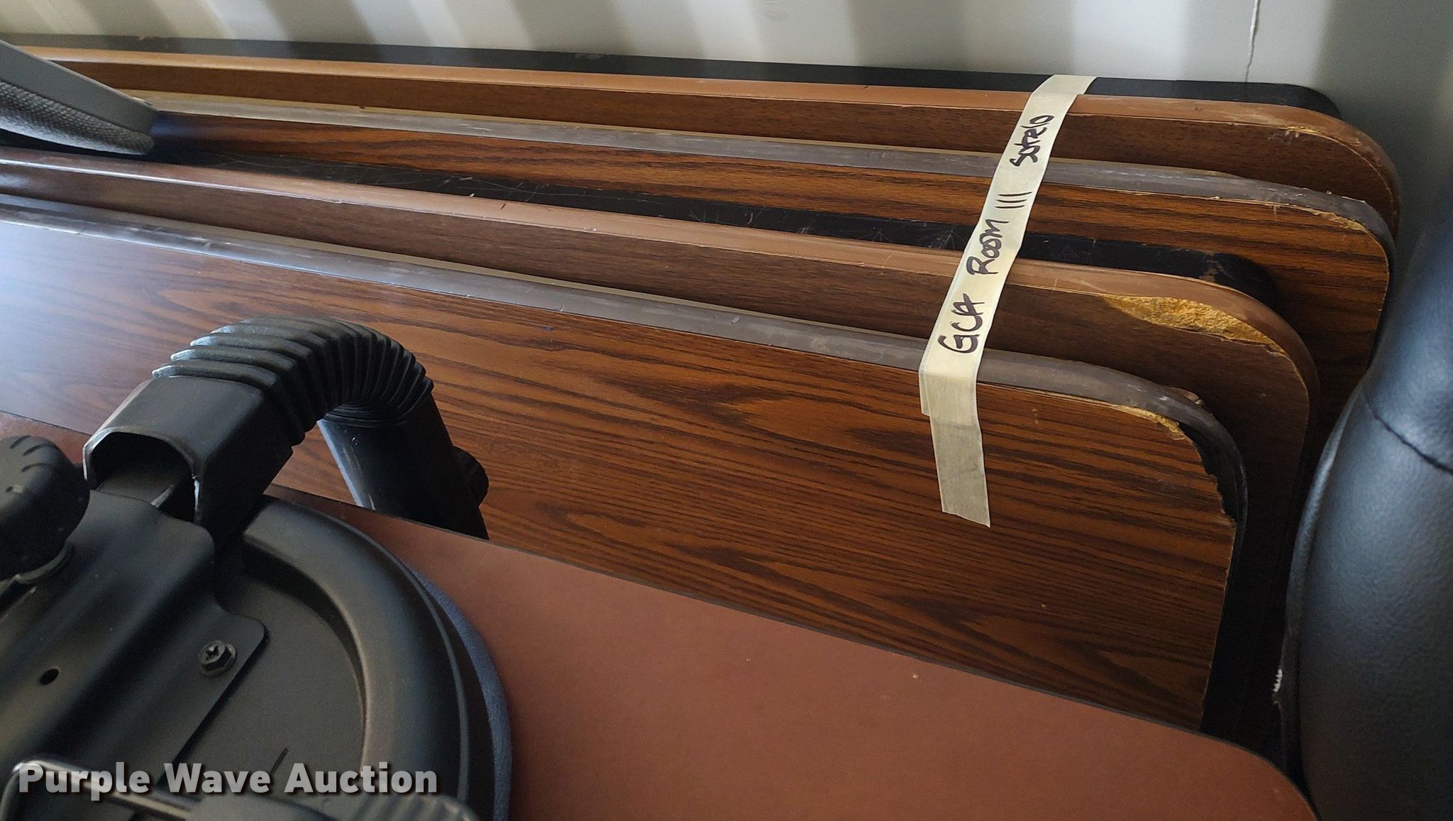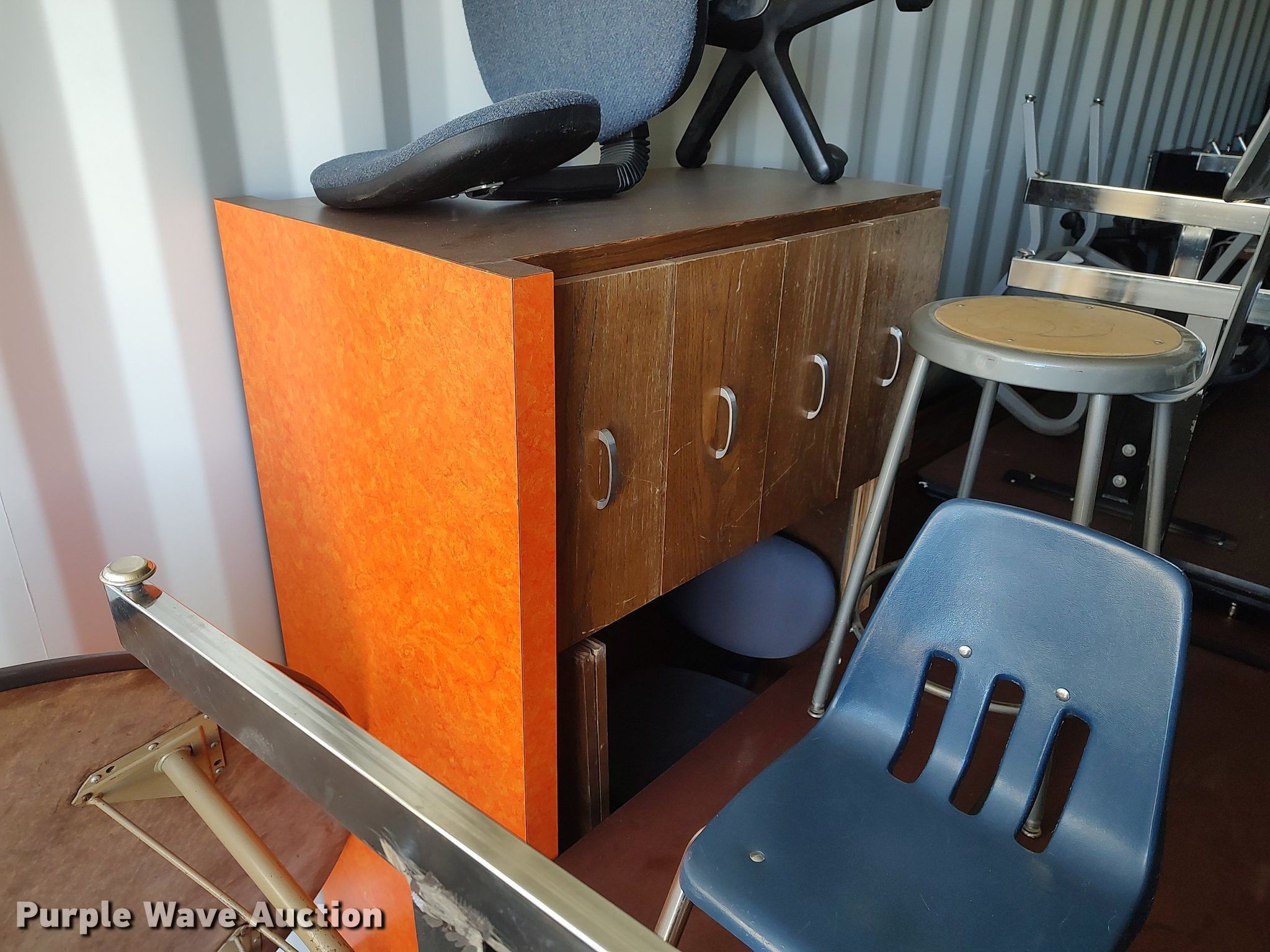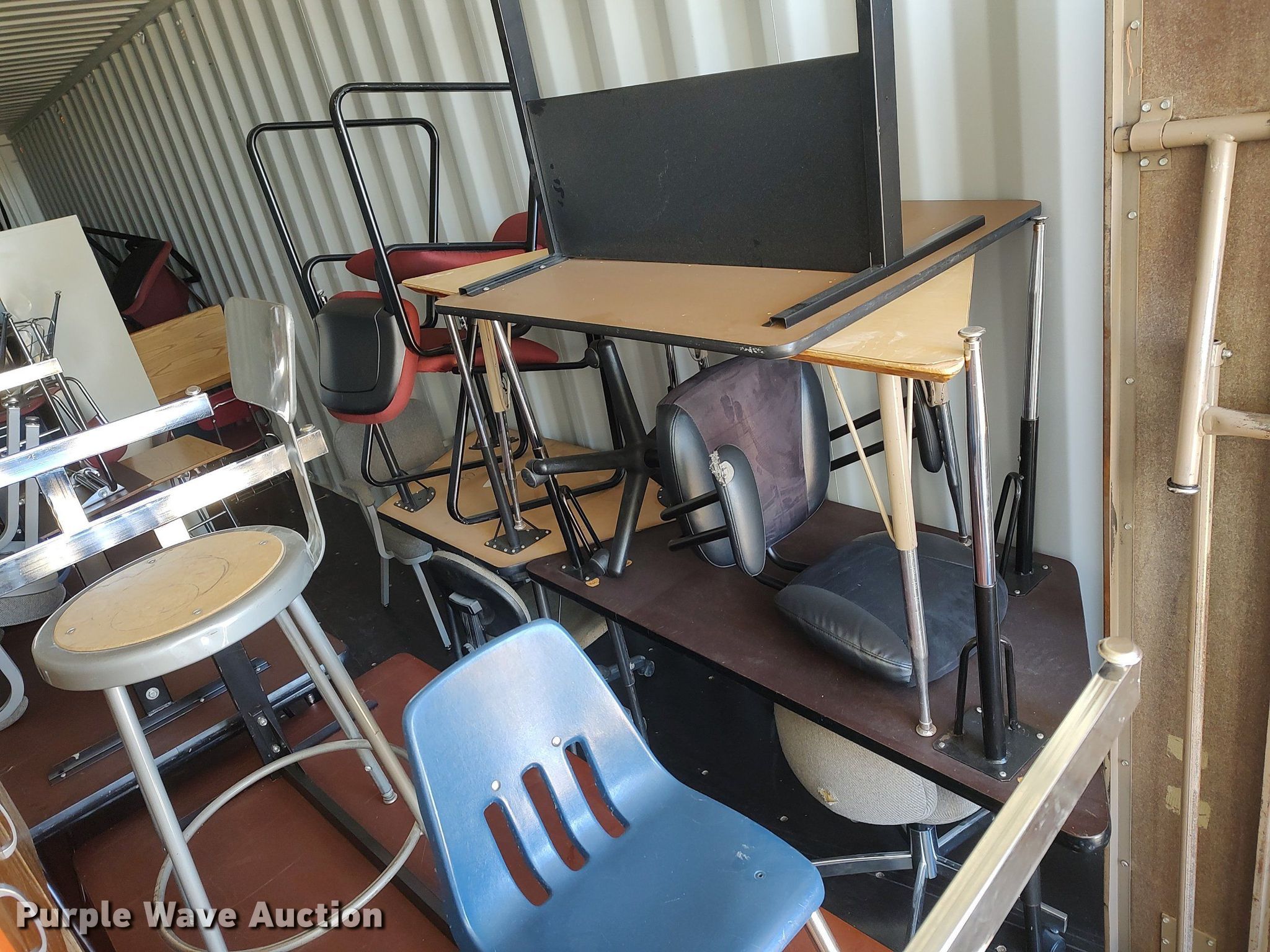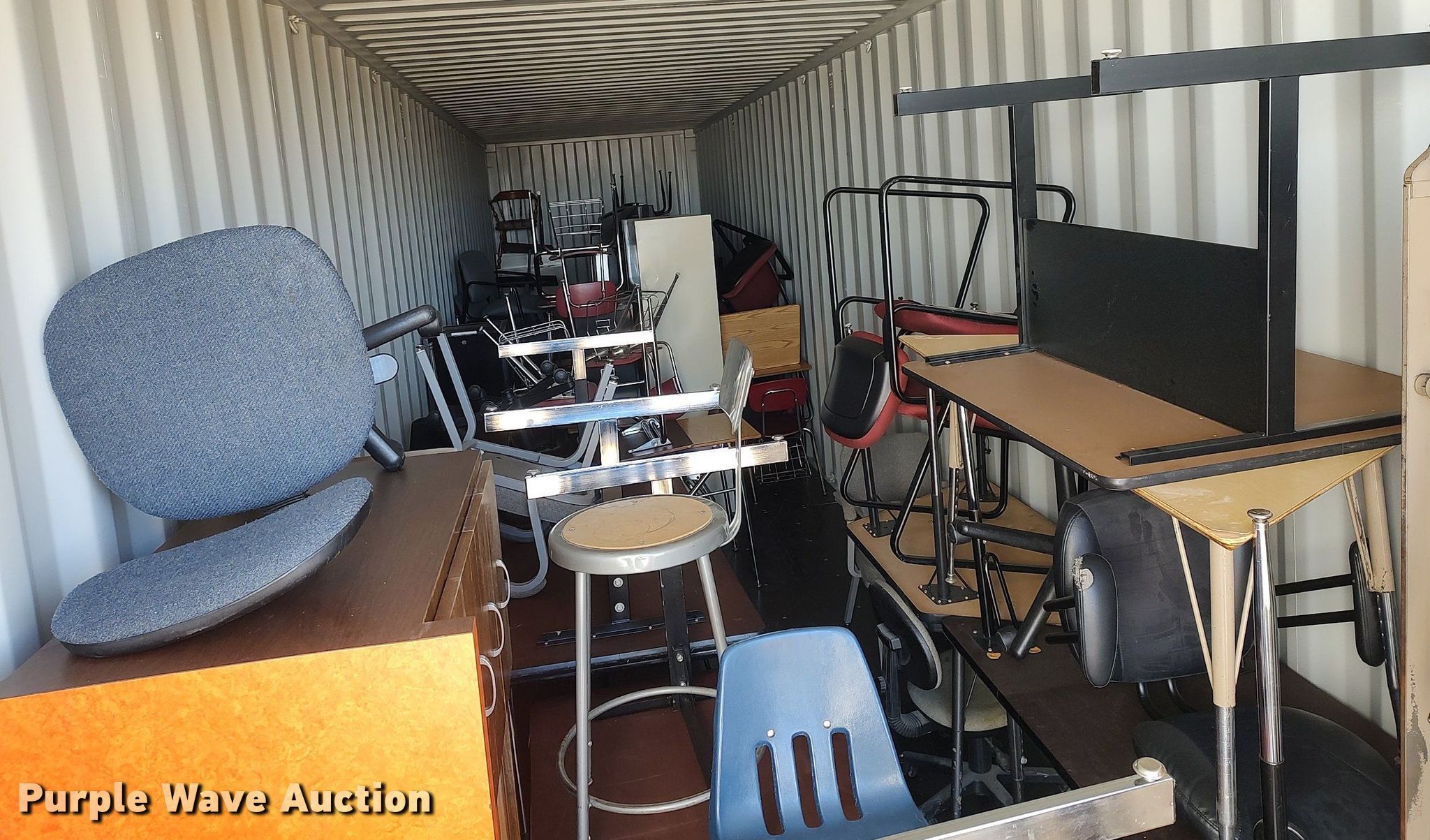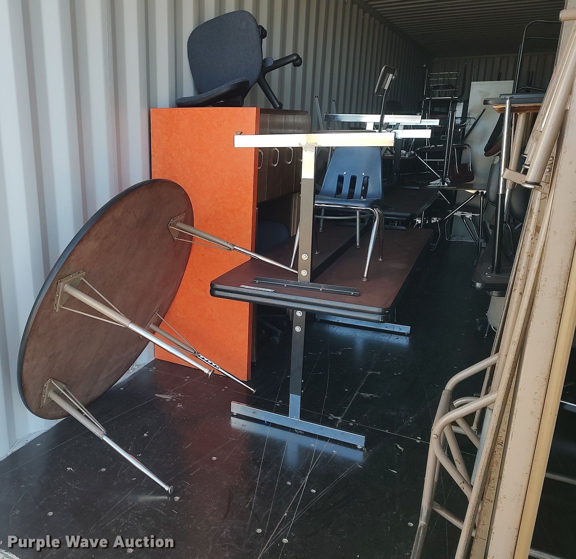 Purple Wave is selling a used Furniture in Kansas. This item is a Furniture with the following: Approx. 18 chairs, Approx. 18 tables, Approx. 10 desks, (3) entertainment carts, (3) televisions, File cabinets and more
