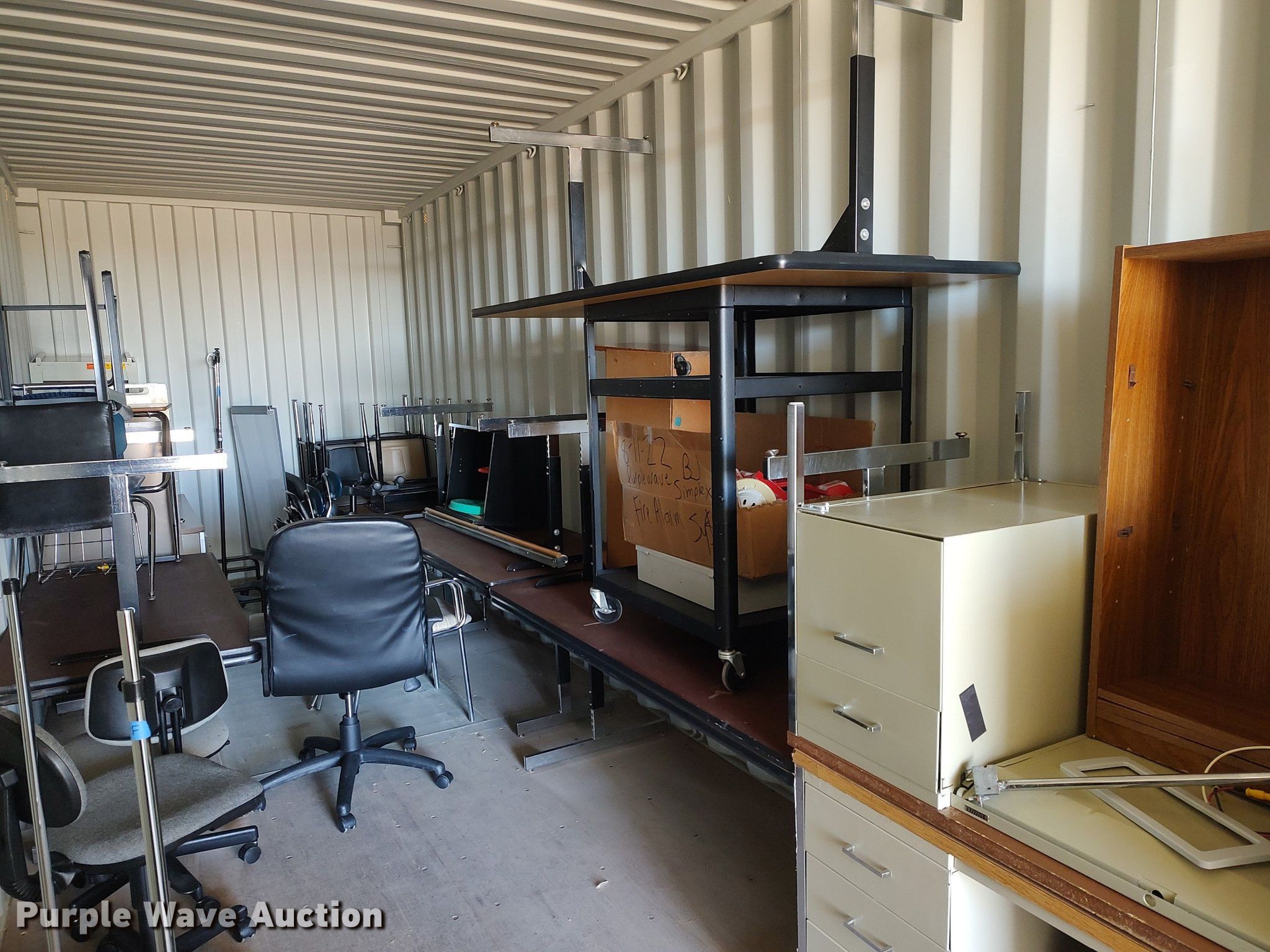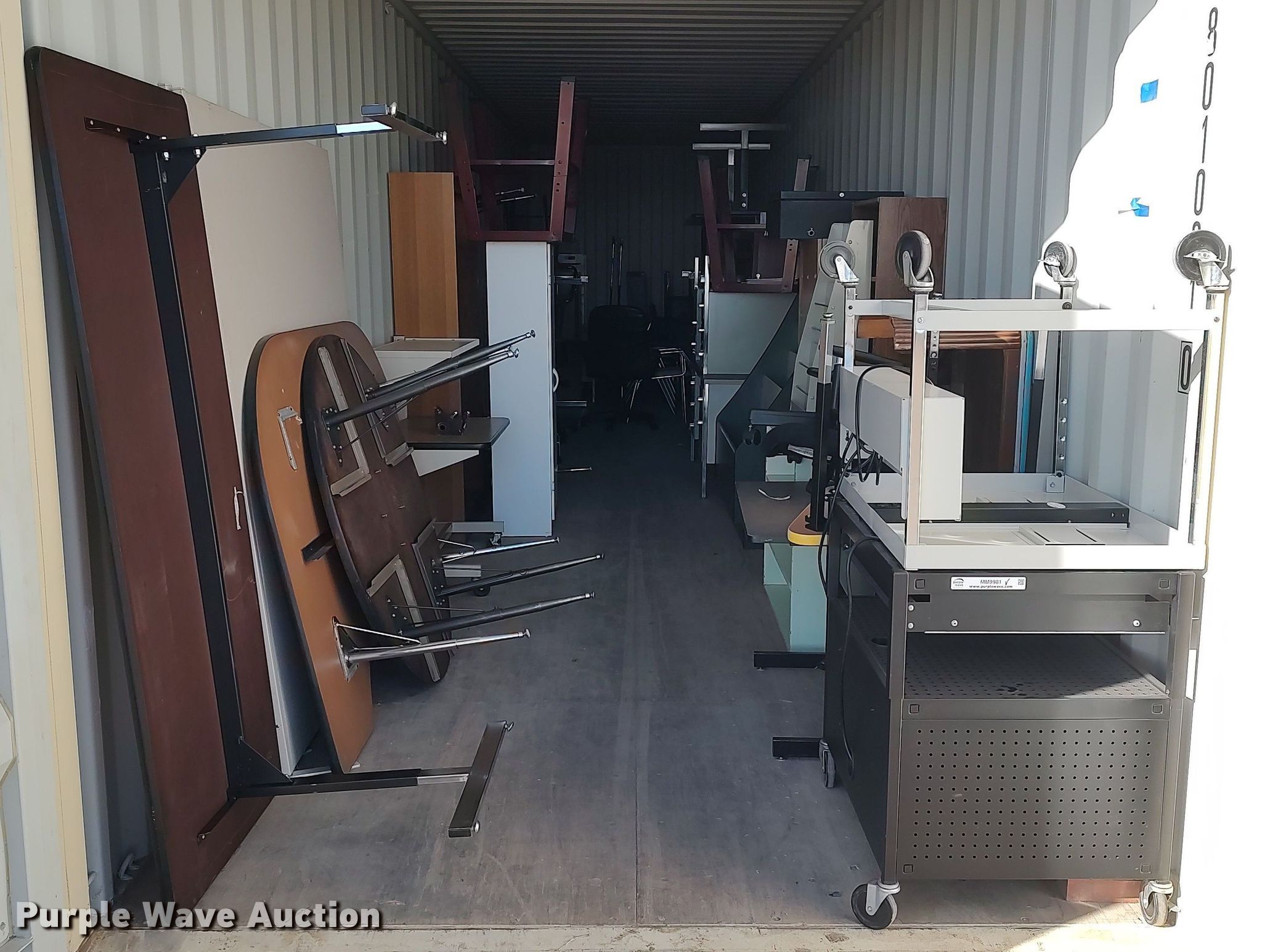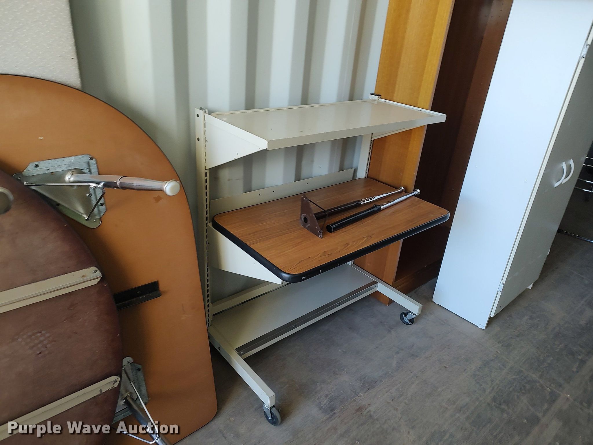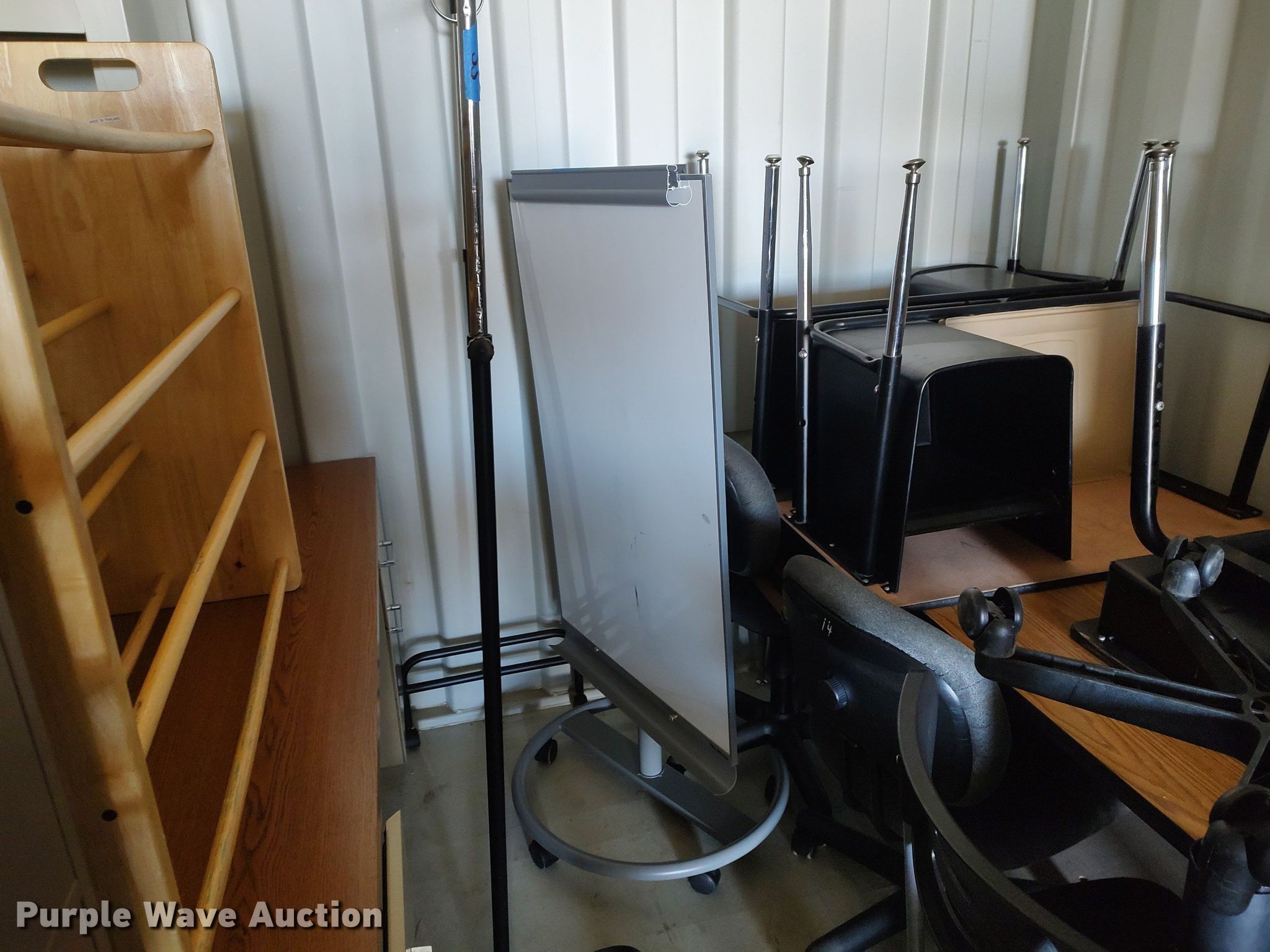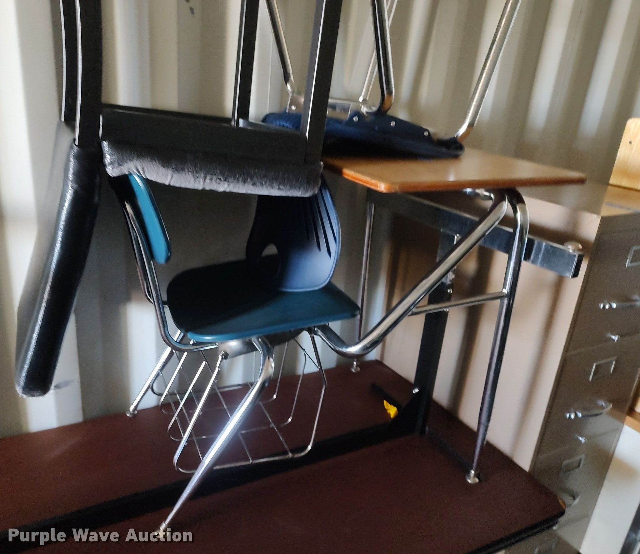 Purple Wave is selling a used Furniture in Kansas. This item is a Furniture with the following: Approx. 17 chairs, Approx. 11 tables, (3) desks, Fire alarm system, File cabinets, Entertainment carts, Poster organizer and more
