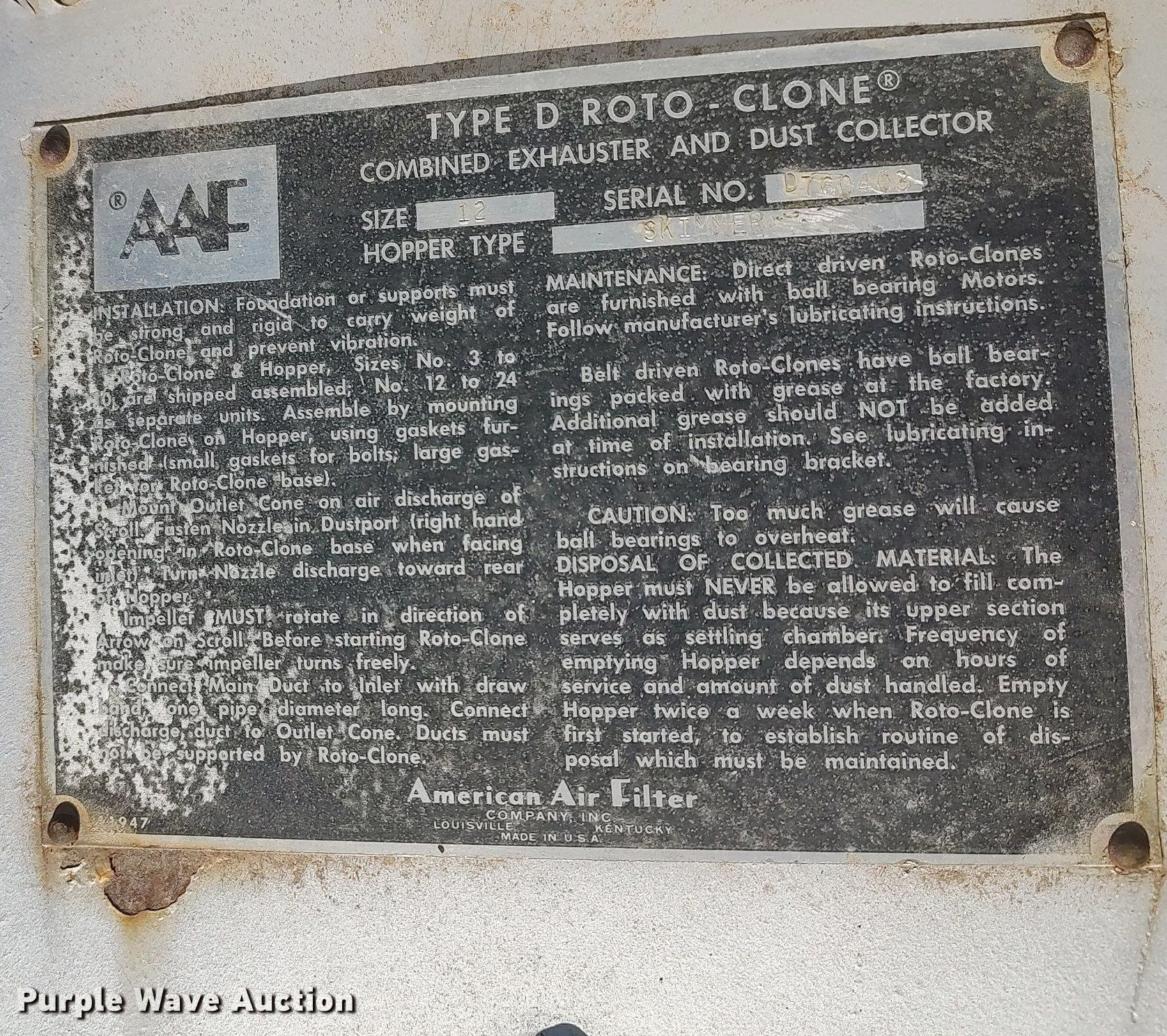 Purple Wave is selling a used Tools in Kansas. This item is a AAF Skimmer dust collector with the following: Serial: S760219, Baldor electric motor, Volts: 208/230/460, HP: 10, Dimensions: 80" W x 8' H x 44" D