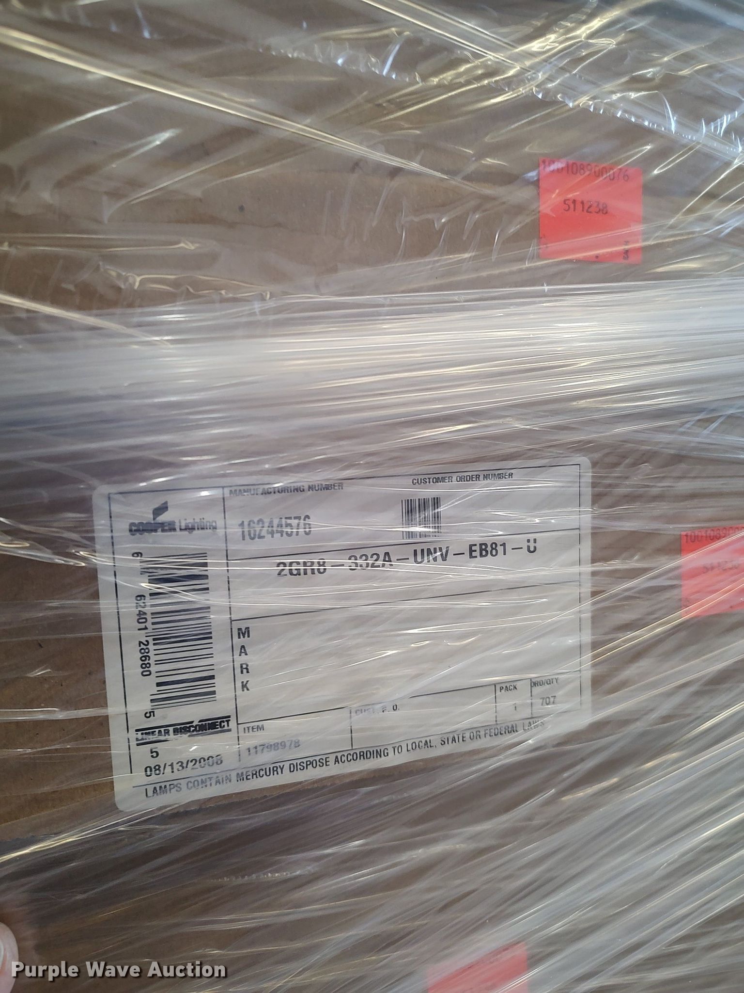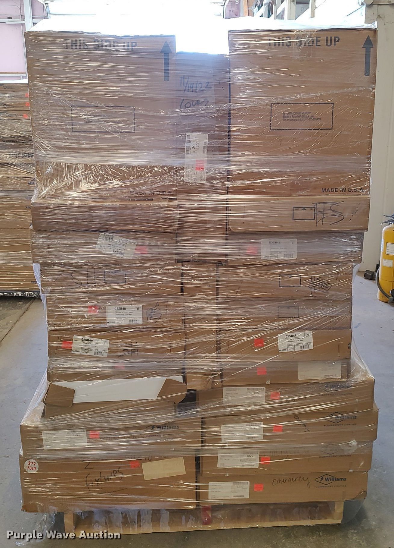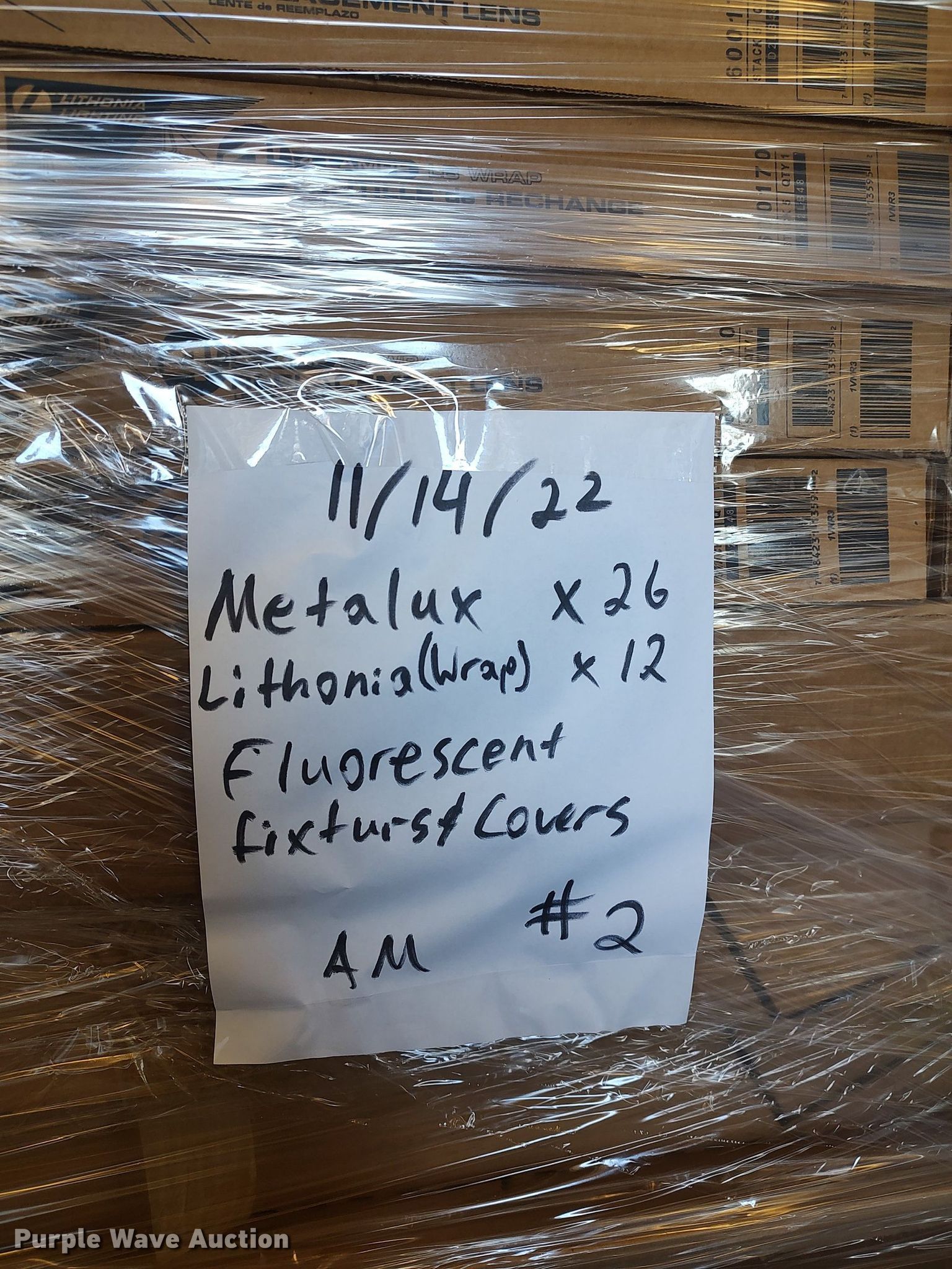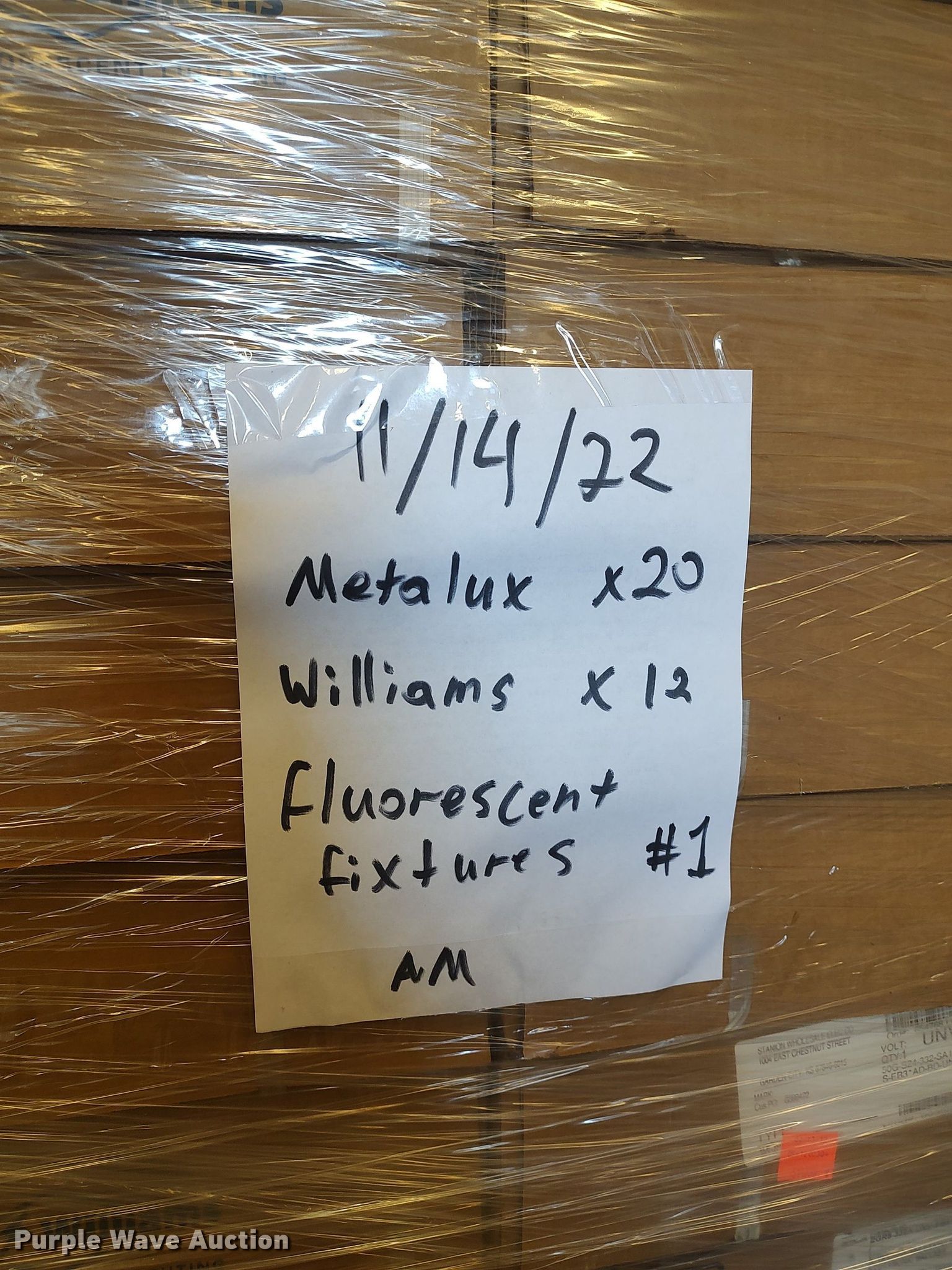 Purple Wave is selling a used Building Materials in Kansas. This item is a (3) pallets of light fixtures with the following: (25) Williams, (9) Lithonia wraps, (4) high intensity bulbs, (46) Metalux fixtures, (12) Lithonia fixture covers