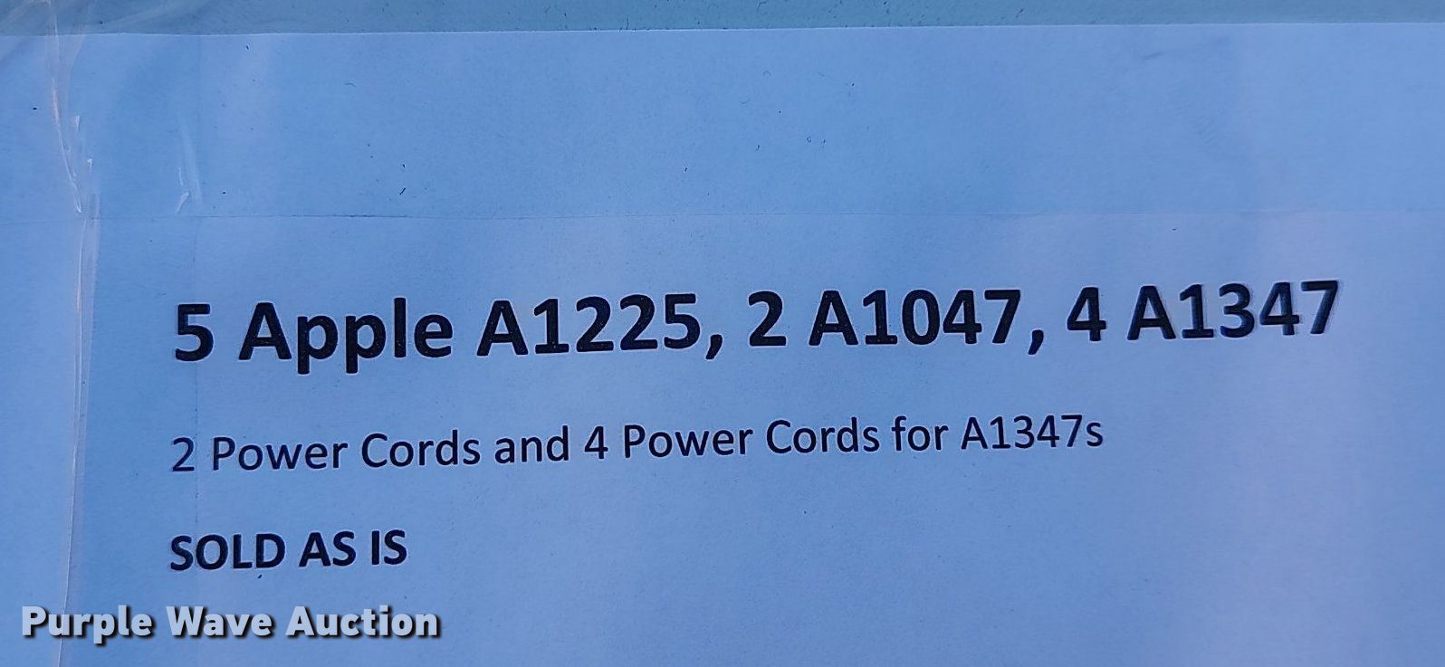 Purple Wave is selling a used Computers in Kansas. This item is a Apple computers with the following: (5) Apple A1225, (2) Apple A1047, (4) Apple A1347, (6) power cords