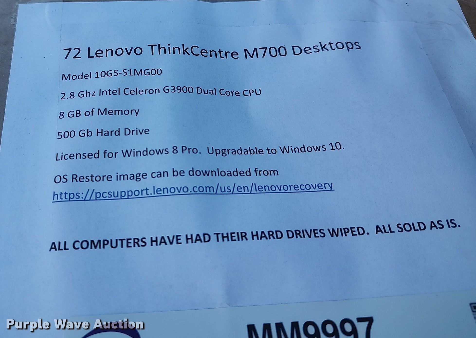 Purple Wave is selling a used Computers in Kansas. This item is a (72) Lenovo ThinkCentre M700 10GS-S1MG00 CPUs with the following: Intel Celeron G3900 2.8GHz dual core, Memory 8 GB, 500 GB hard drive, DVD burner, Hard drives wiped