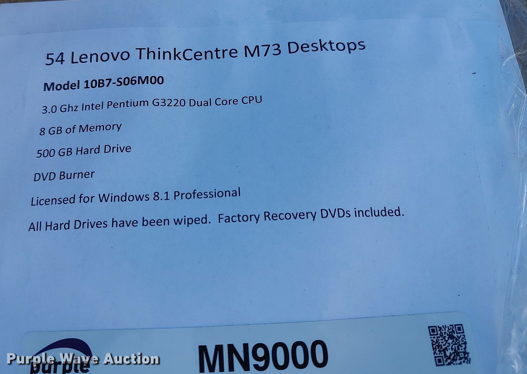 Purple Wave is selling a used Computers in Kansas. This item is a (54) Lenovo ThinkCentre M73 10B7-S06M00 CPUs with the following: Intel Pentium G3220 3.0GHz dual core, Intel I5-4300M, Memory 8 GB, 500 GB hard drive, DVD burner, Hard drives wiped