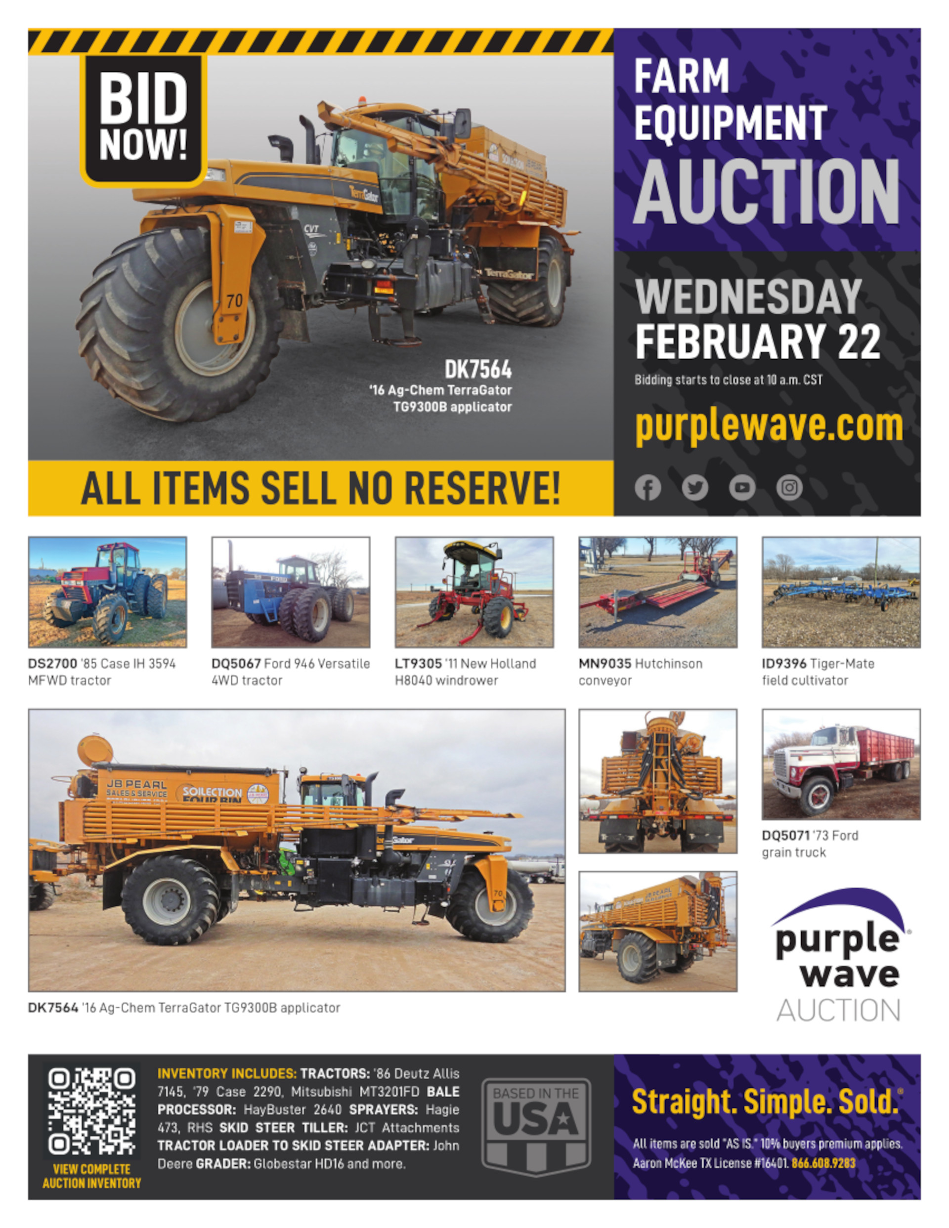 This auction is conducted by Purple Wave, Inc., whose home office is 825 Levee Drive, Manhattan, Kansas. Aaron McKee, Texas auctioneer license # 16401, operates Purple Wave, Inc. Complaints against us may be directed to the Texas Department of Licensing and Regulation, P.O. Box 12157, Austin, Texas 78711, (512) 463-6599. For additional required information, see the attached document.