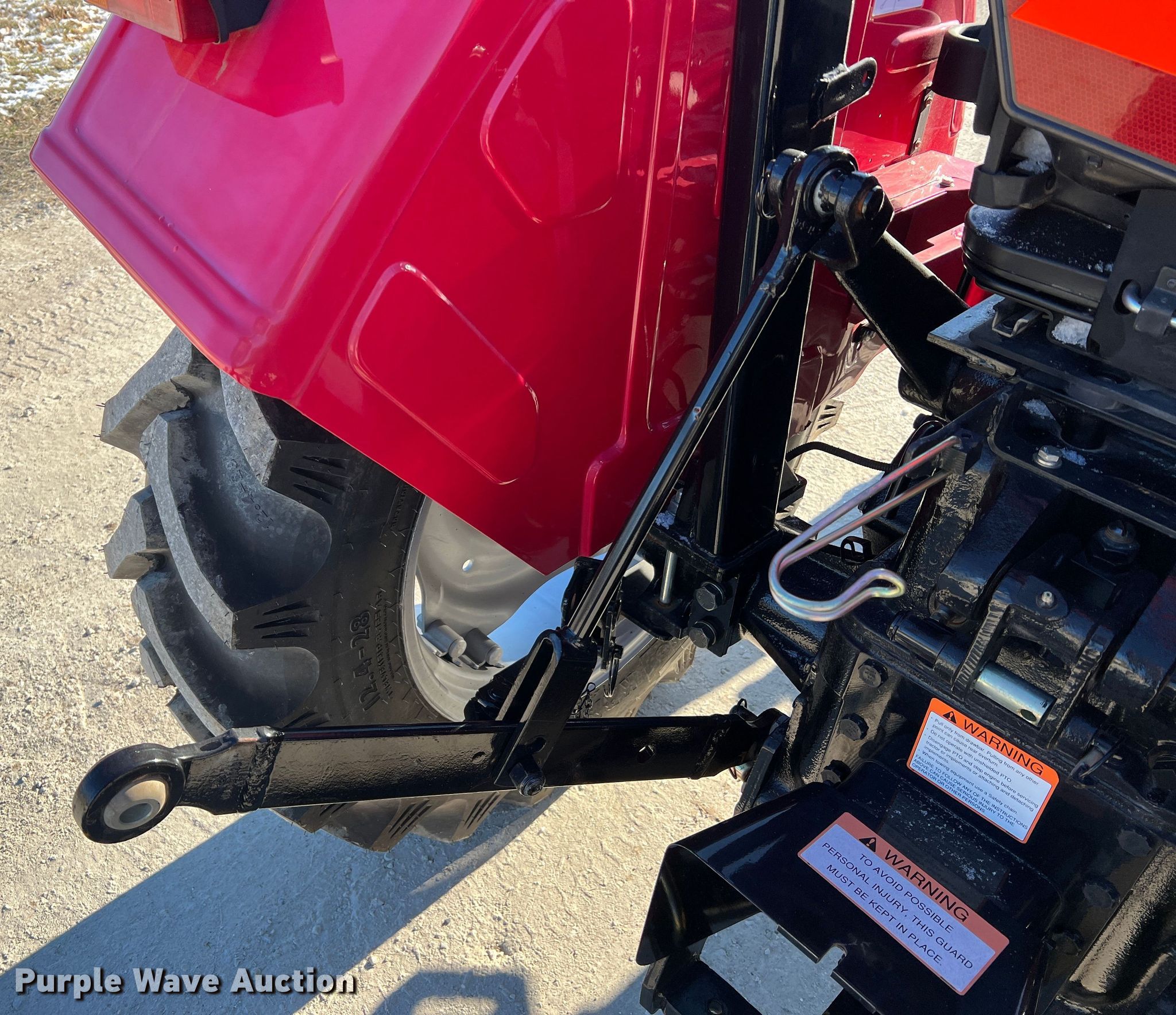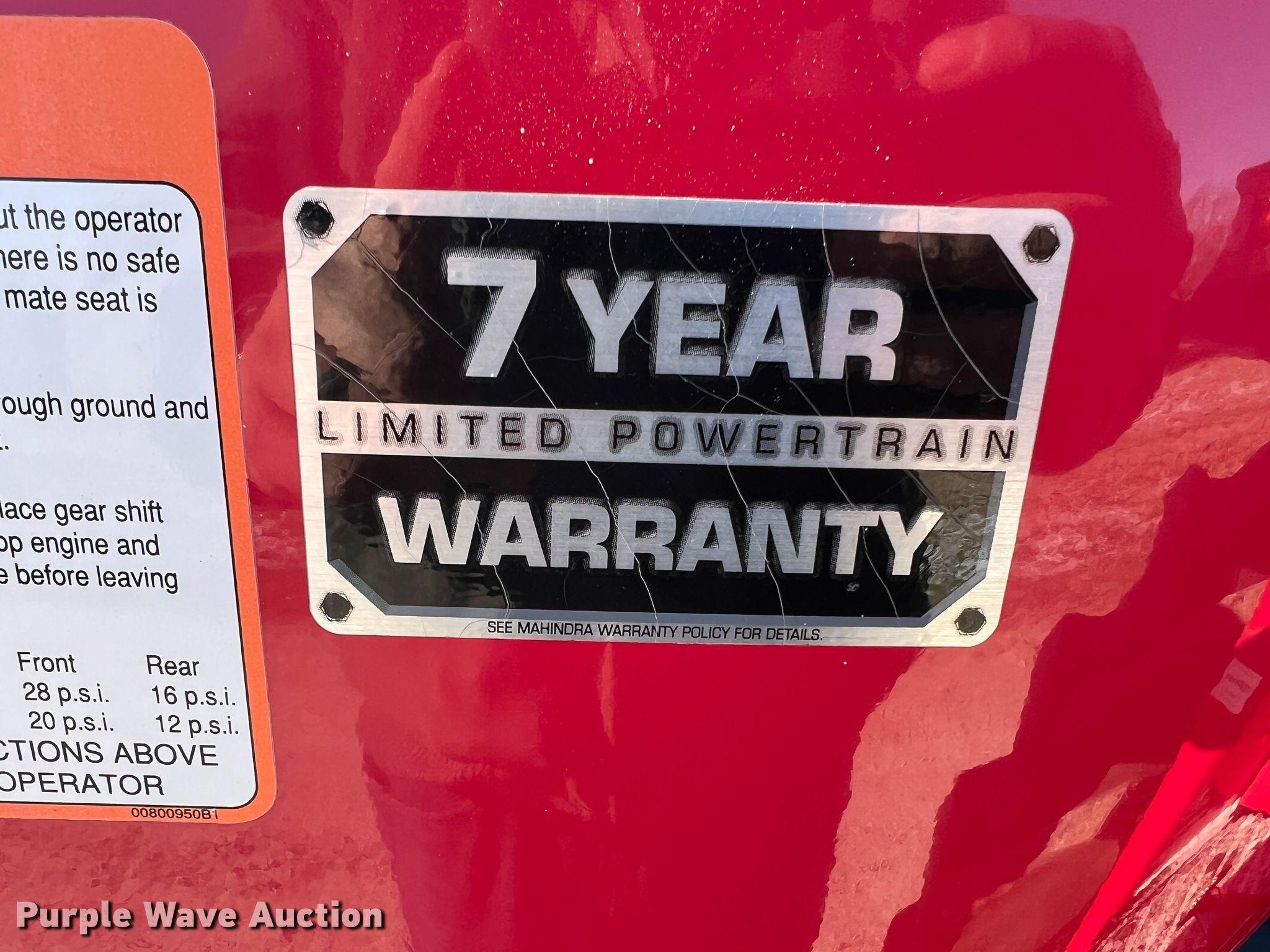 Mahindra 4540 tractor. Hours: 3 on meter, Serial: MBCNY3890. Engine Mahindra UT-41, Displacement: 2.7L, Cylinders: 4, Fuel type: Diesel, kW: 29. Transmission Manual, 8F - 2R. Features PTO: 540, Three point. Tires Front: 6.00-16, Rear: 12.4-28. Gome's Repair. 5908 MO-133. Meta, MO 65058