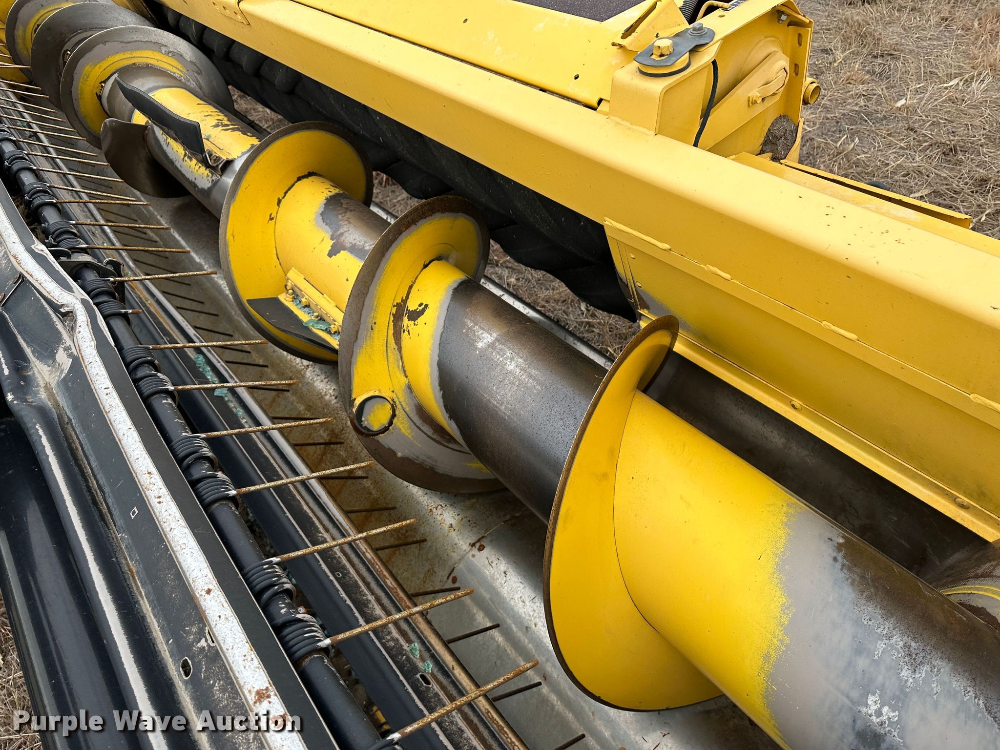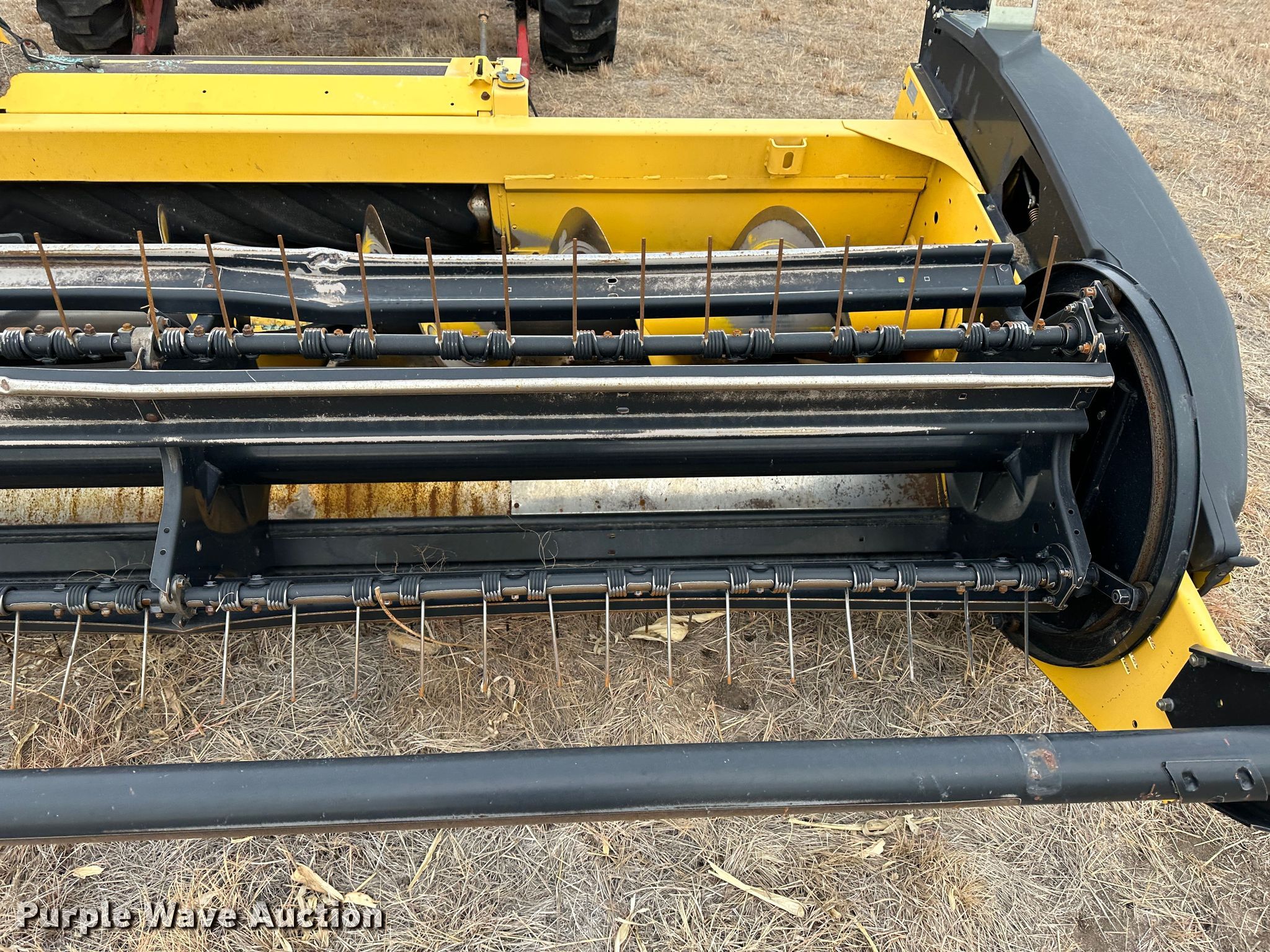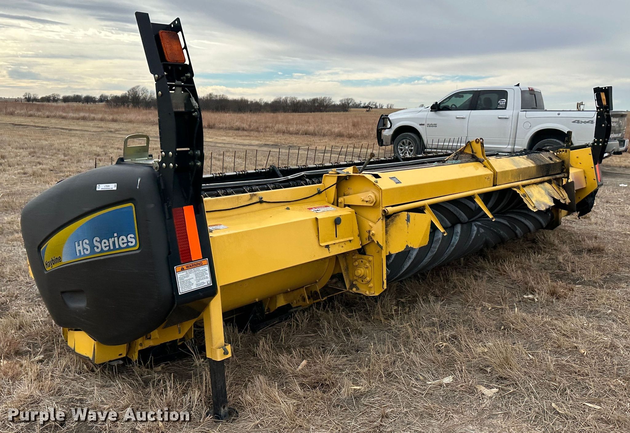 New Holland Haybine 16HS double sickle head. Serial: Y8G601100, Unit #: A857976F00. Features Width: 16', Hydraulic head tilt, Hydraulic fore/aft, Power reverser, Conditioners: Rubber/ rubber. Notes Fire damage, Non-operational unit. Insurance salvage unit. Farm Bureau Financial Services. Zurich, KS 67663