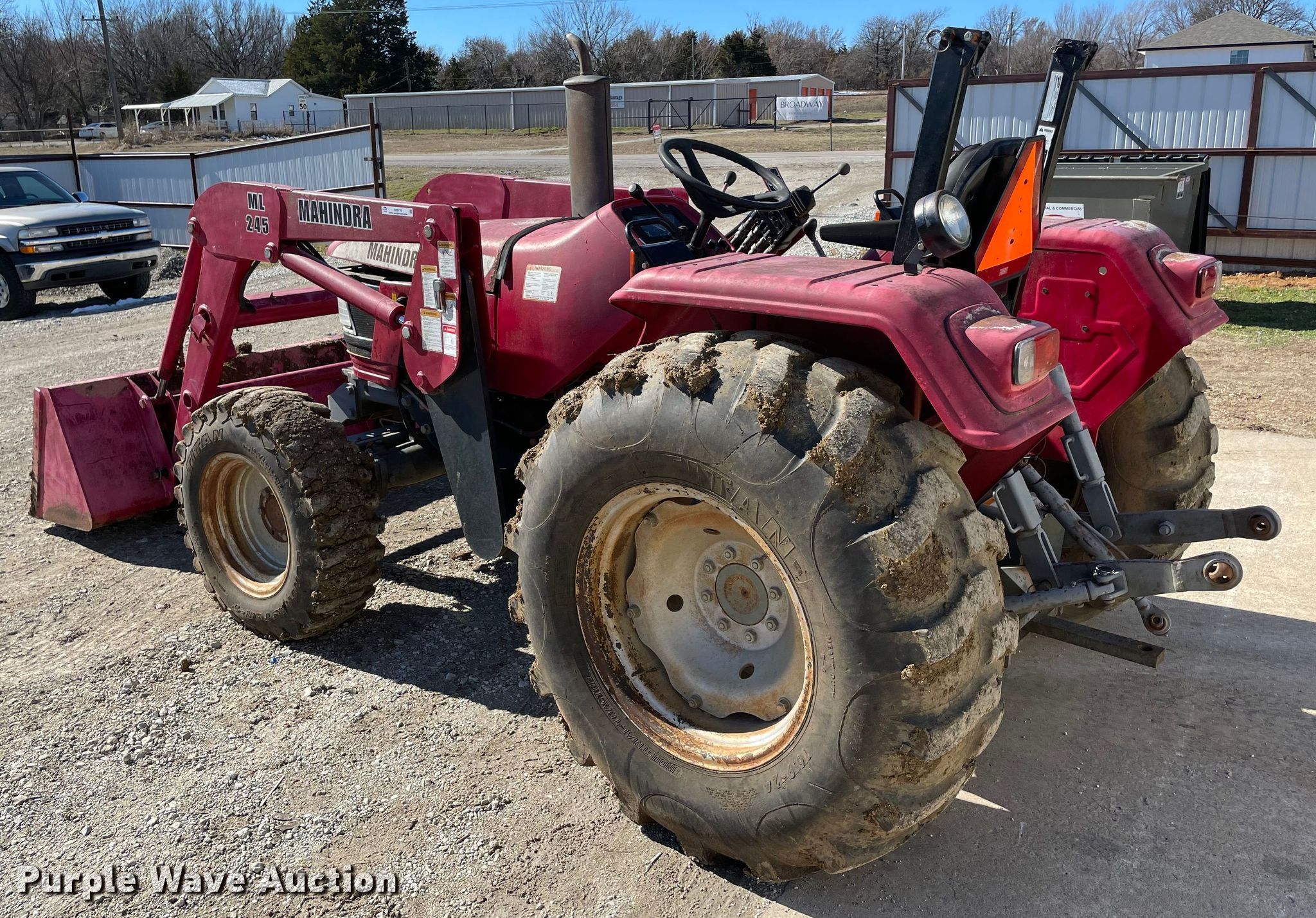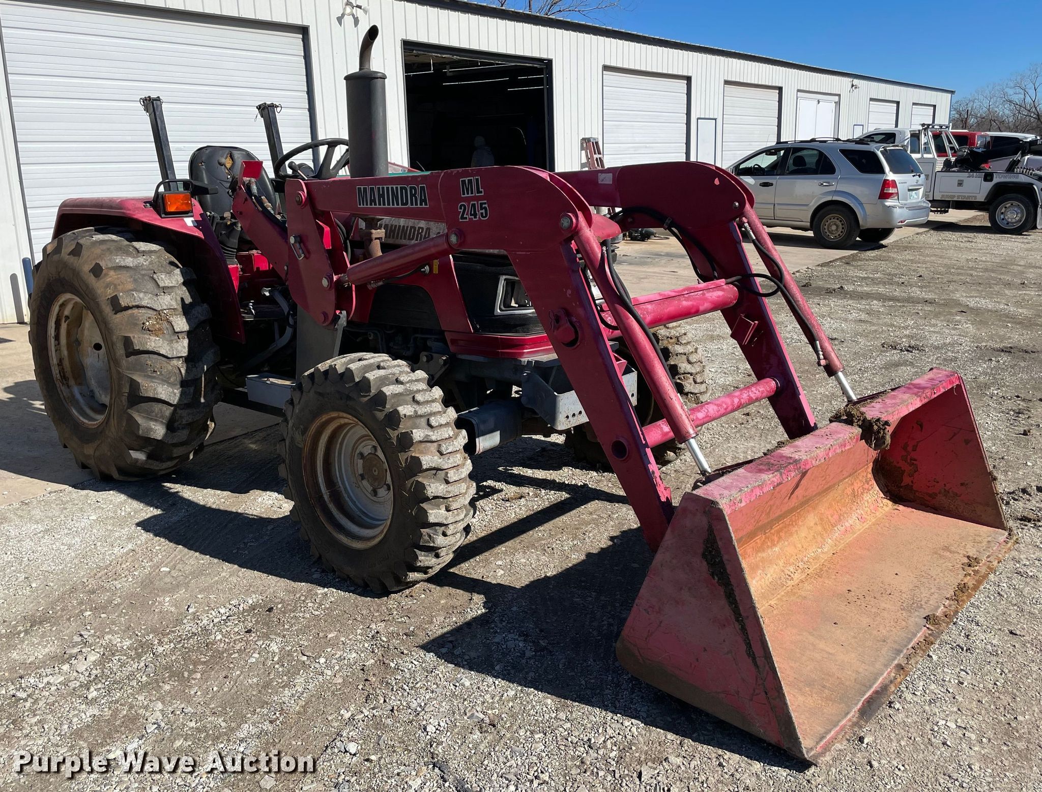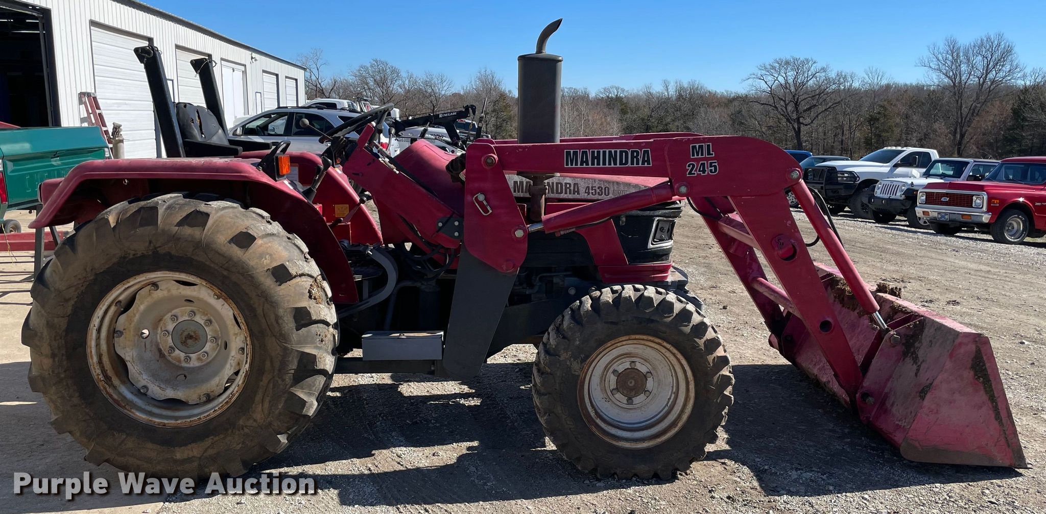 Mahindra 4530 MFWD tractor. Hours: 674 on meter, Serial: USM1124K5. Engine Cylinders: 3, Fuel type: Diesel. Transmission Synchro, 8F - 8R, Left-hand reverser. Features PTO: 540, Three point Top link, Hydraulic remote sets Rear: 1, Loader Mahindra ML 245, Controls: Joystick, Bucket Width: 73".. Tires Front: 10.5/80-18, Rear: 16.9-24. Notes Dead battery, Possible clutch issues, weak. 11206 State Highway 99 North. Ada, OK 74820