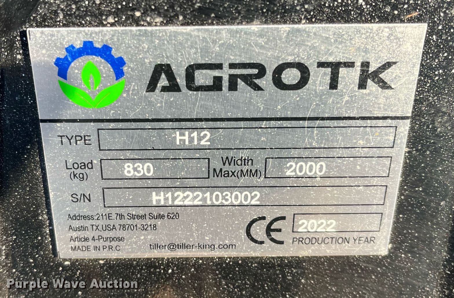 Purple Wave is selling a used Mini Excavator in Kansas. This item is a 2022 Agrotk H12 mini excavator with the following: Hours: 0 on meter, Serial: H1222103002