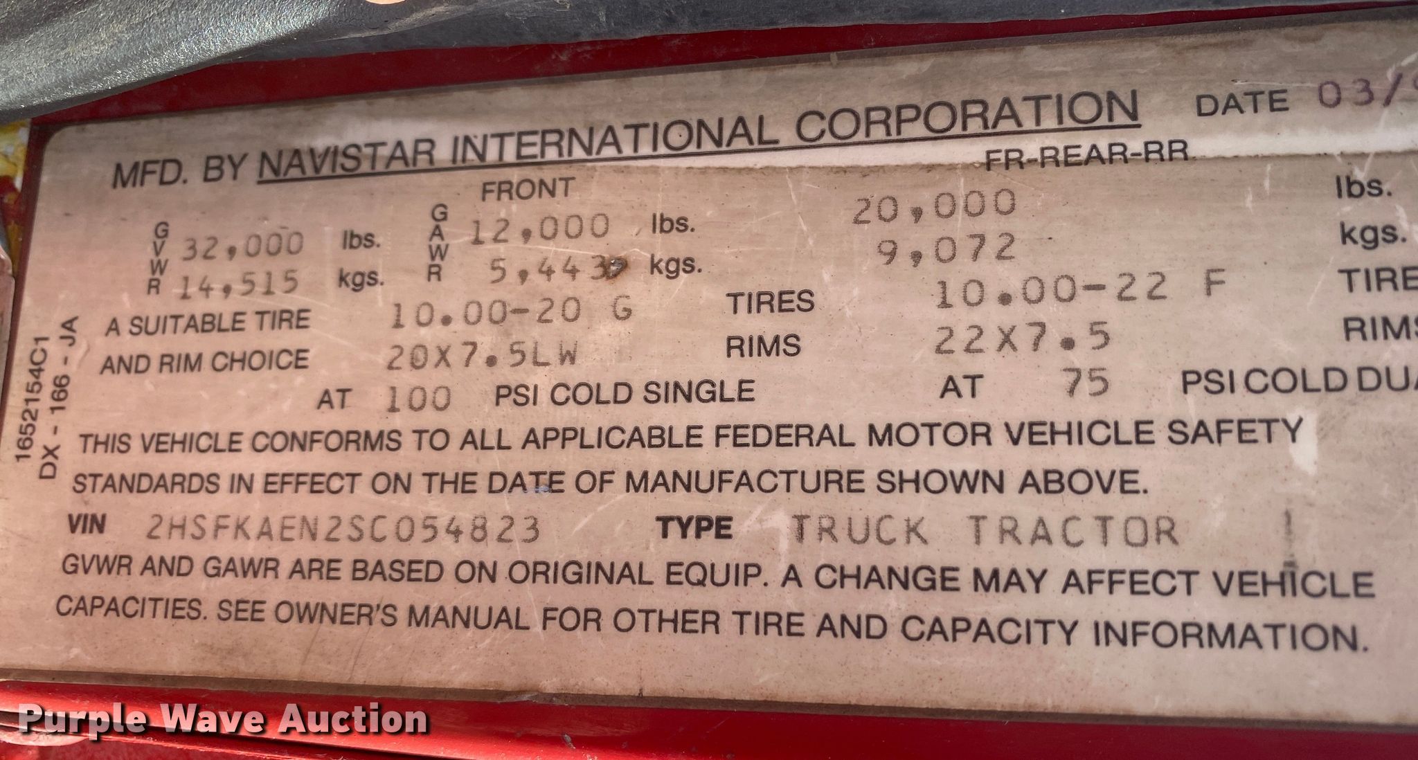 Purple Wave is selling a used Truck Tractor in Oklahoma. This item is a 1995 International 9400 semi truck with the following: Miles: 607,495 on odometer, VIN: 2HSFKAEN2SC054823