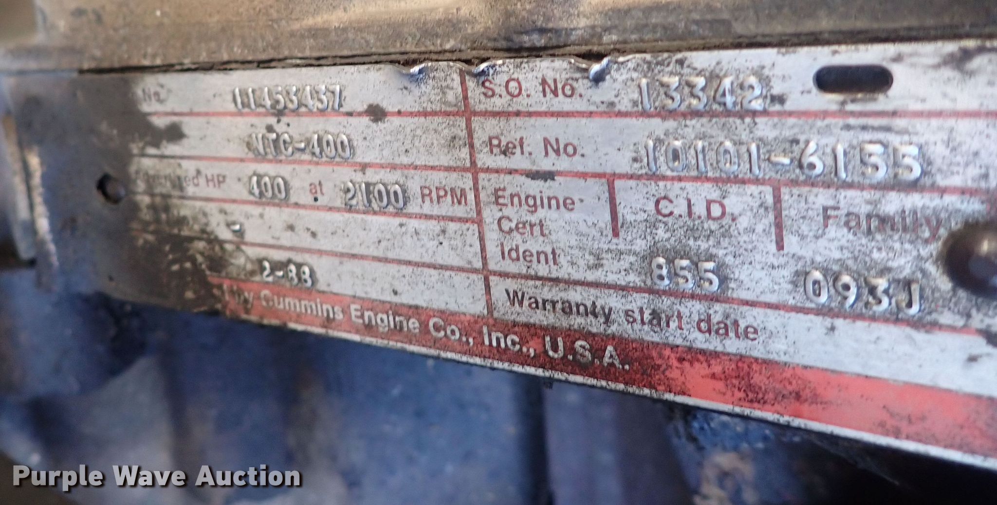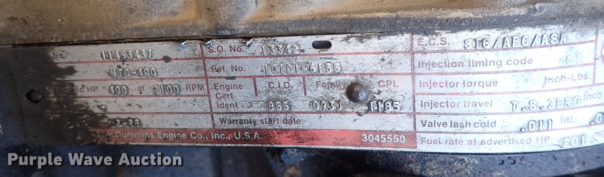 1988 White GMC WIA semi truck. Miles: 7,579 on odometer Actual Mileage Unknown, VIN: 4V1WDBJG1JN601980. Engine Cummins NTC-400, Displacement: 14.0L, Cylinders: 6, Fuel type: Diesel, HP: 400, Engine brake. Transmission Eaton Fuller Roadranger, Manual, Speed: 13. Chassis Axles: Tandem, Gear ratio: 3.73, Differential lock: Inter-axle, Suspension: Air, Brakes: Air, PTO, Wet kit. Interior AC, Heat, Passenger power window, Air ride cab, Sleeper Sleeper length: 40", Beds: Single, Rear climate control. Features Fifth wheel type: Air operated, Sliding, Fuel tank: Single. Tires Size: 285/75R24.5. Kansas title. Mileage has not been verified. Exempt will be written in the odometer disclosure on the title. Title distribution may be delayed up to 14 days from verification of funds. Hutchinson, KS 67501