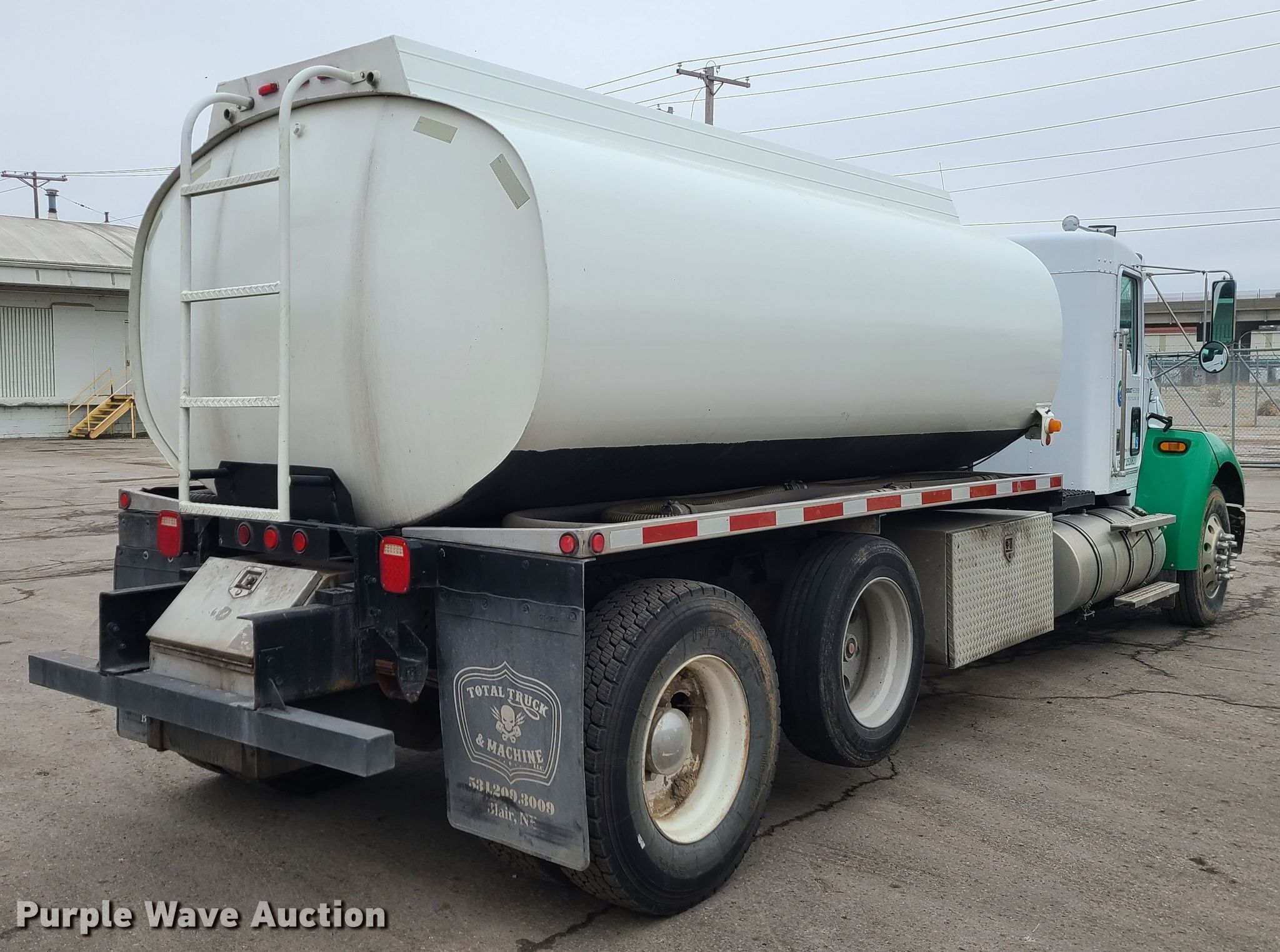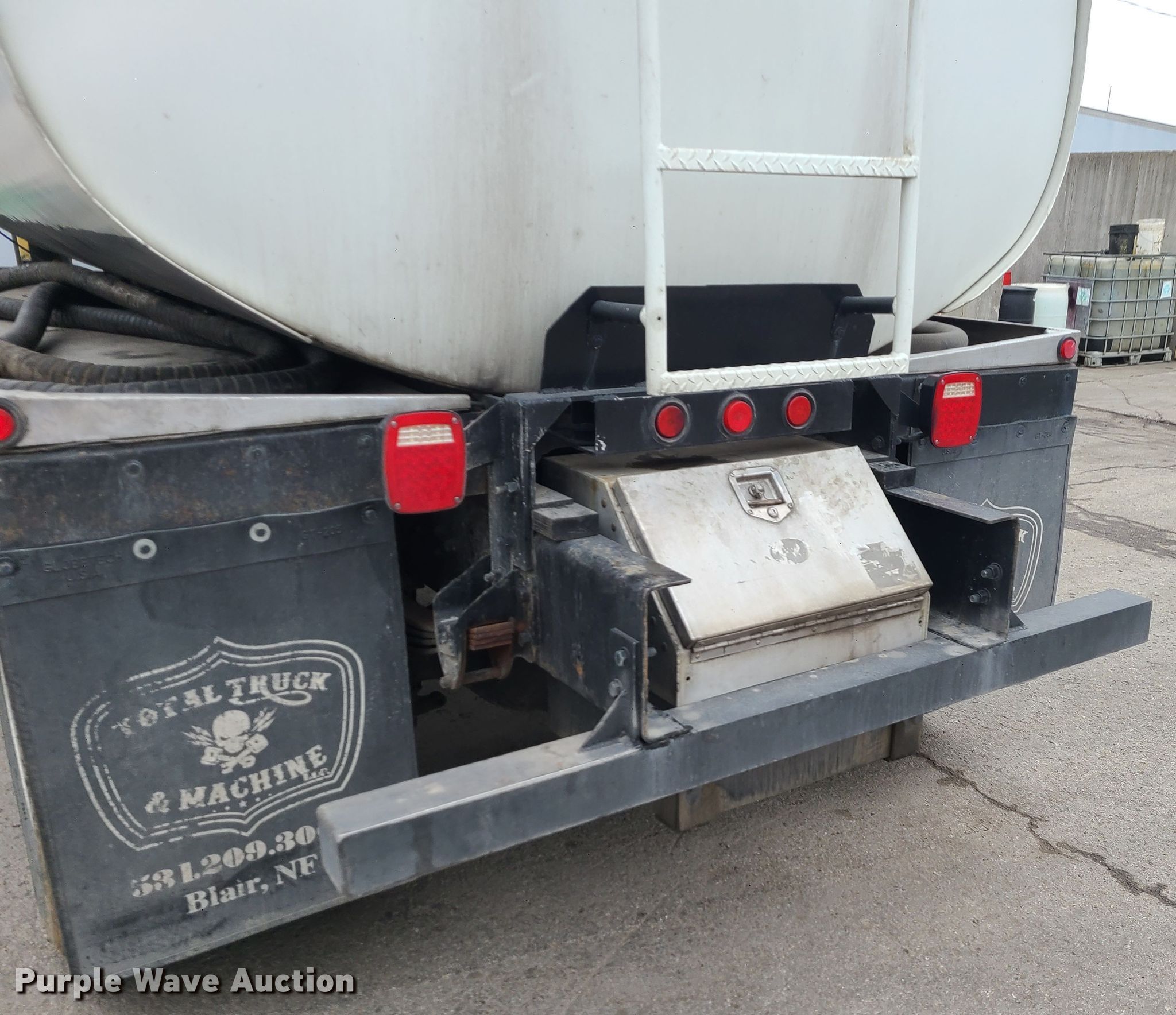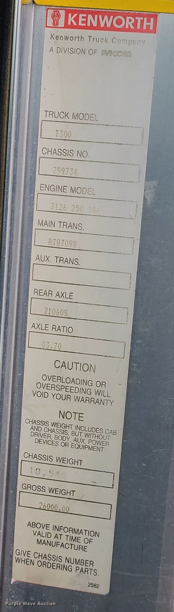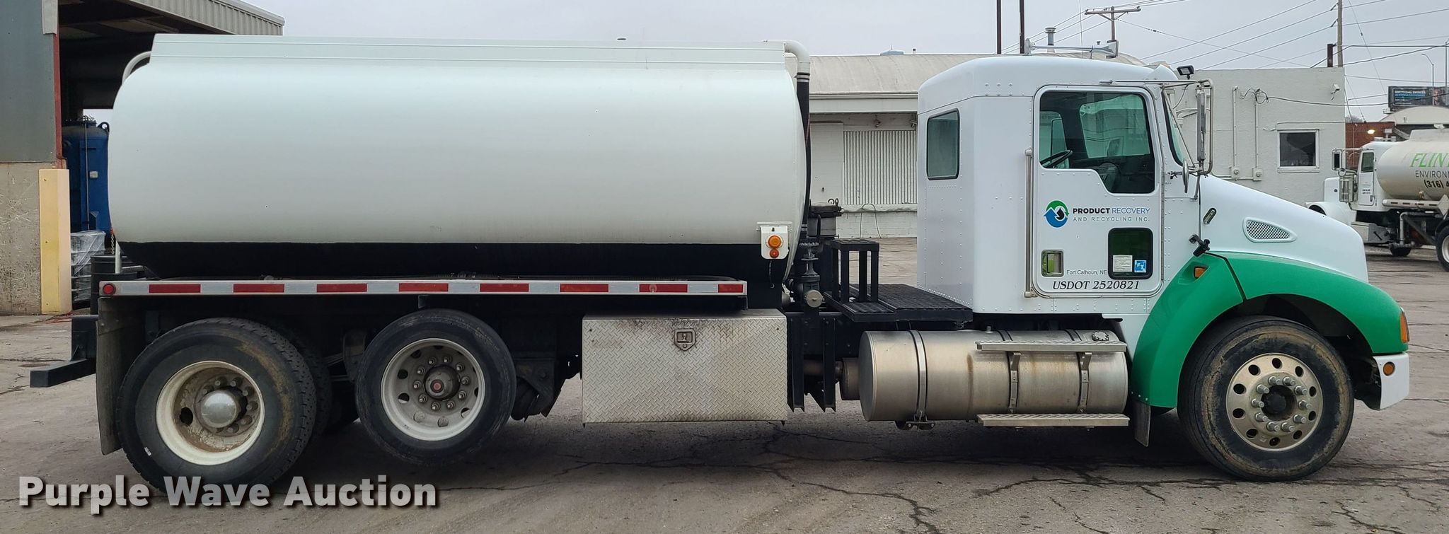 1999 Kenworth T300 tank truck. Miles: 278,261 on odometer, VIN: 1NKMHD6X0XS799734. Engine Caterpillar 3126, Displacement: 7.2L, Cylinders: 6, Fuel type: Diesel. Transmission Manual. Chassis Axles: Tandem, Pusher axle, Suspension: Spring, Brakes: Air, PTO. Interior AC, Heat. Features Bed / tank Capacity: 2,800 gallons, 13' L x 96" W, Top fill. Tires Front: 295/75R22.5, Rear: 11R22.5, Lift axle: 255/70R22.5. Illinois title. GFL Liquid Waste. 1420 Woodswether Road. Kansas City, MO 64105
