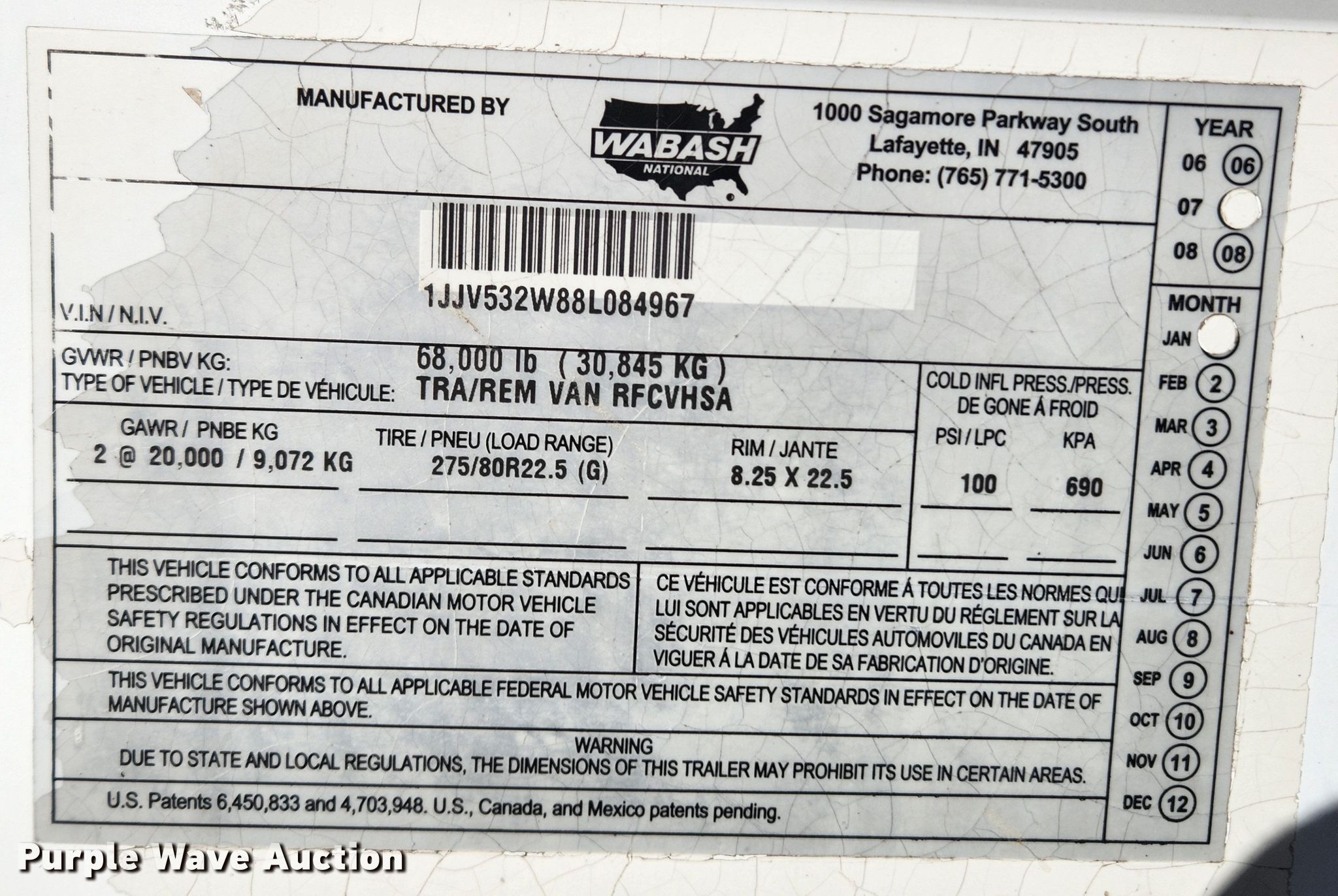 2008 Wabash RFCVHSA refrigerated van trailer. VIN: 1JJV532W88L084967. Dimensions Overall: 53' L x 102" W. Features Deck type: Aluminum, Refrigeration unit Thermo King Whisper, Hours: 31,559. Chassis Landing gear: Dual, Two speed, Suspension: Spring, Brakes: Air, Axles: Tandem, GVWR: 68,000 lbs, GAWR: 20,000 lbs. Tires Steel wheels, Size: 295/75R22.5. View repairs. Missouri title. Title distribution may be delayed up to 14 days from verification of funds. John Spurlock. Bowling Green, MO 63334
