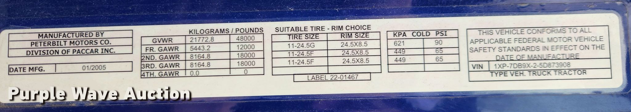 Purple Wave is selling a used Truck Tractor in Missouri. This item is a 2005 Peterbilt 387 semi truck with the following: Miles: 582,802 on odometer, VIN: 1XP7DB9X25D873908