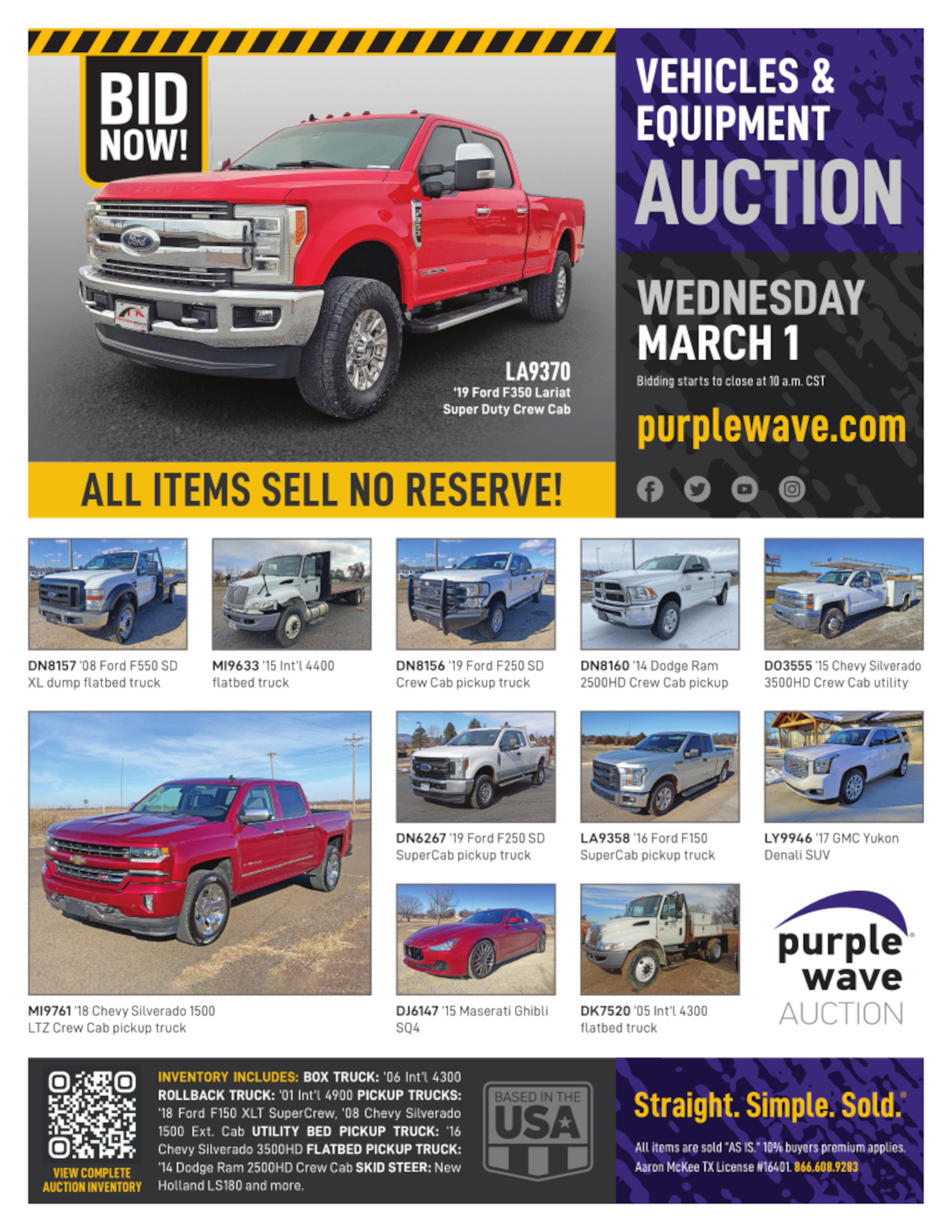 This auction is conducted by Purple Wave, Inc., whose home office is 825 Levee Drive, Manhattan, Kansas. Aaron McKee, Texas auctioneer license # 16401, operates Purple Wave, Inc. Complaints against us may be directed to the Texas Department of Licensing and Regulation, P.O. Box 12157, Austin, Texas 78711, (512) 463-6599. For additional required information, see the attached document.