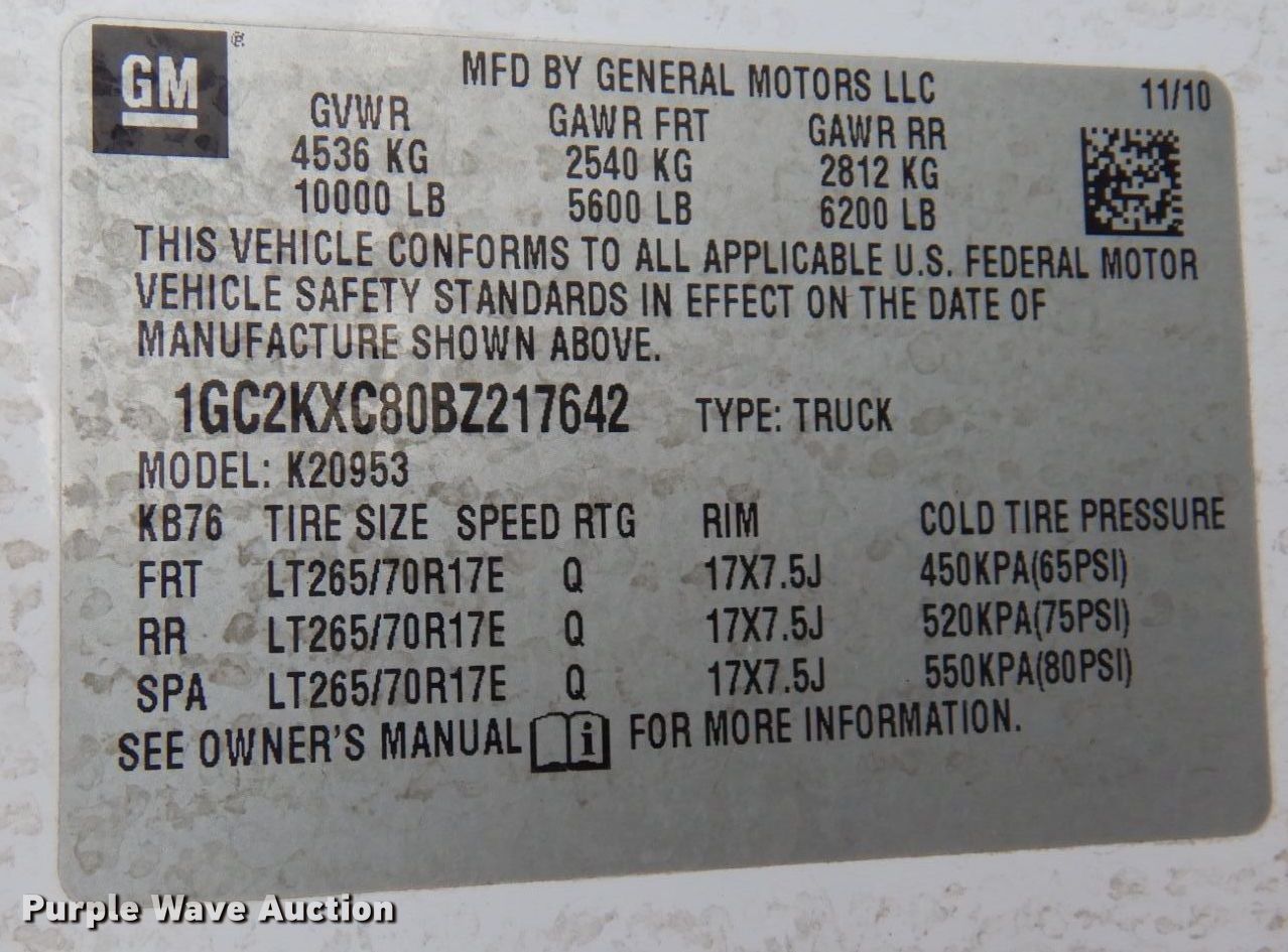 2011 Chevrolet Silverado 2500HD Ext. Cab flatbed pickup truck. Miles: 242,462 on odometer, VIN: 1GC2KXC80BZ217642. Engine Displacement: 6.6L V8 OHV, Cylinders: 8, Fuel type: Diesel. Transmission Automatic, Four wheel drive. Interior AC, Heat, Power windows, Power locks, Cruise control. Features Flatbed PJ, 8' L x 7' W, Hitch: Gooseneck, SnowEX Model: 77750, Width: 8'. Tires Size: LT285/70R17. Notes Dash warning indicator: Check engine, TPMS, ABS, Traction control. Minnesota title. Title distribution may be delayed up to 14 days from verification of funds. Proturf. 7780 215th Street West. Lakeville, MN 55044