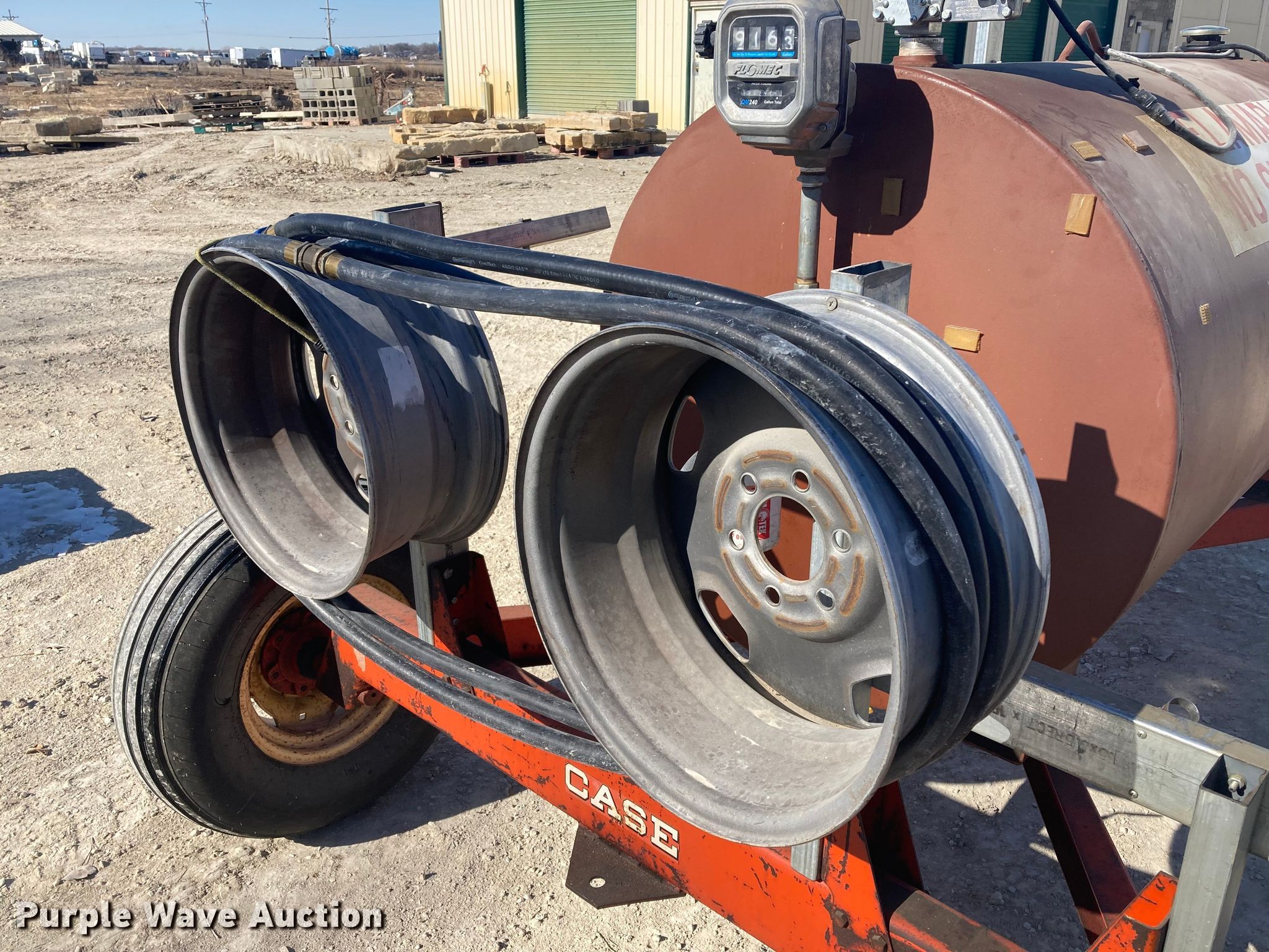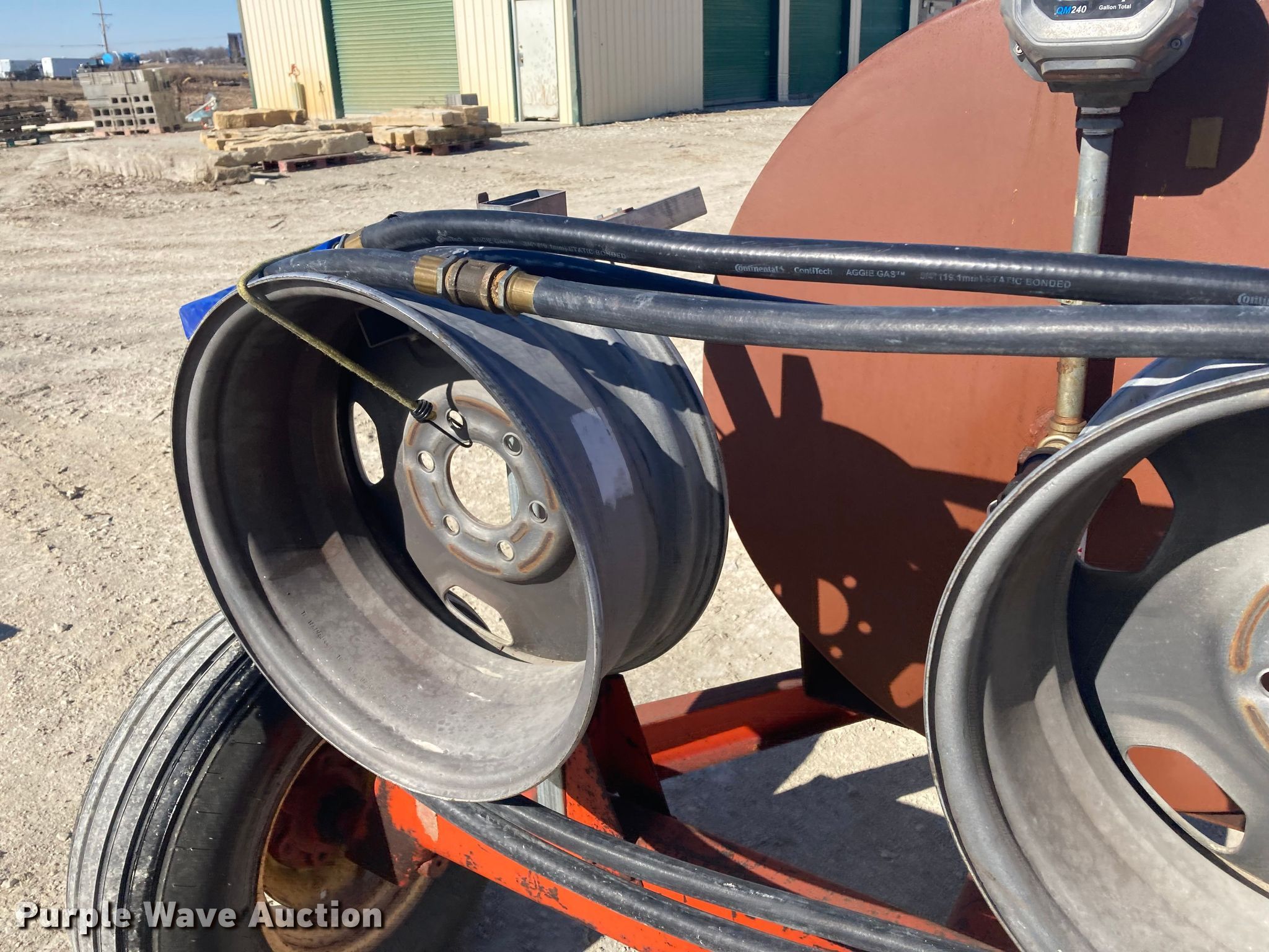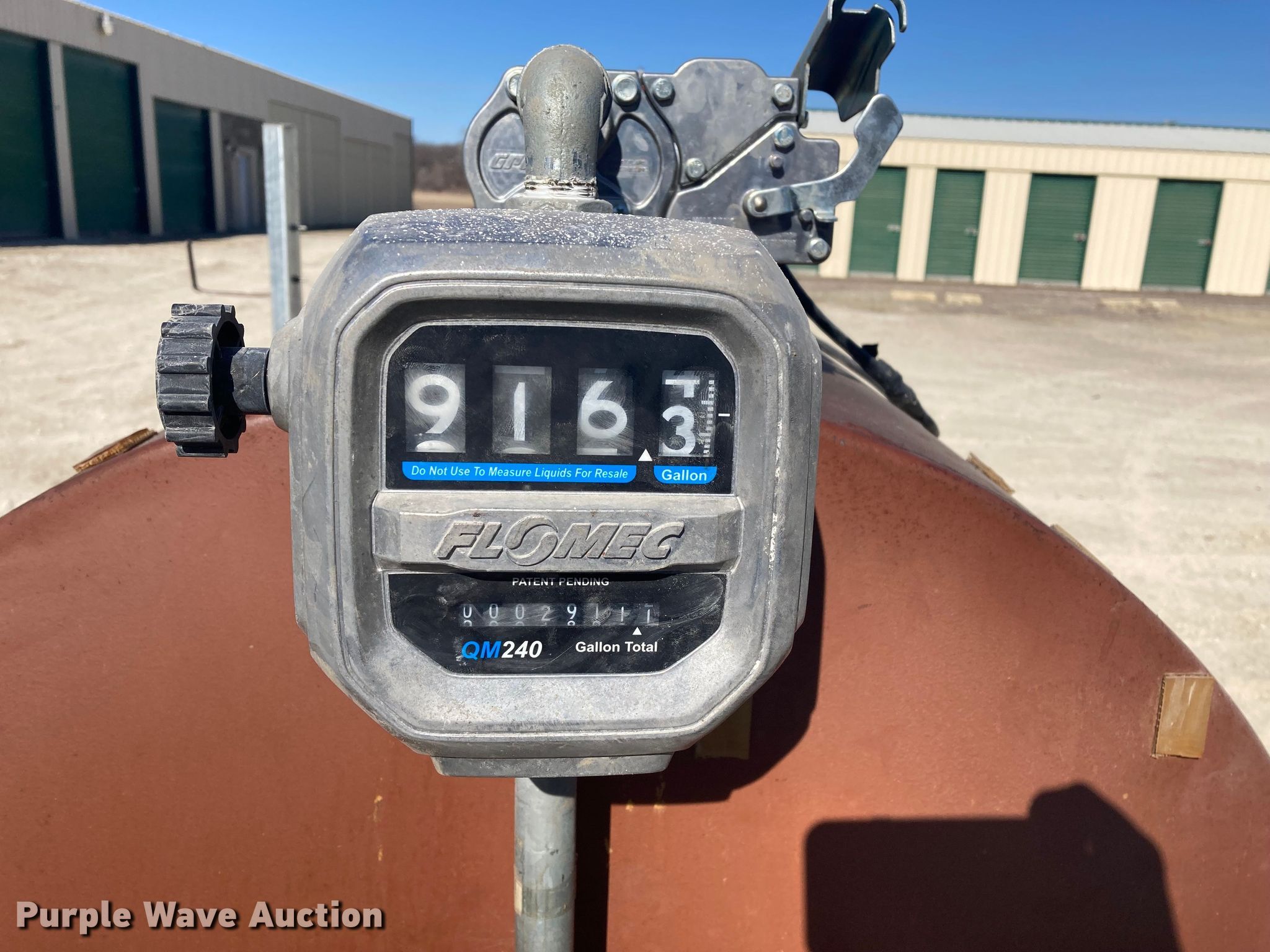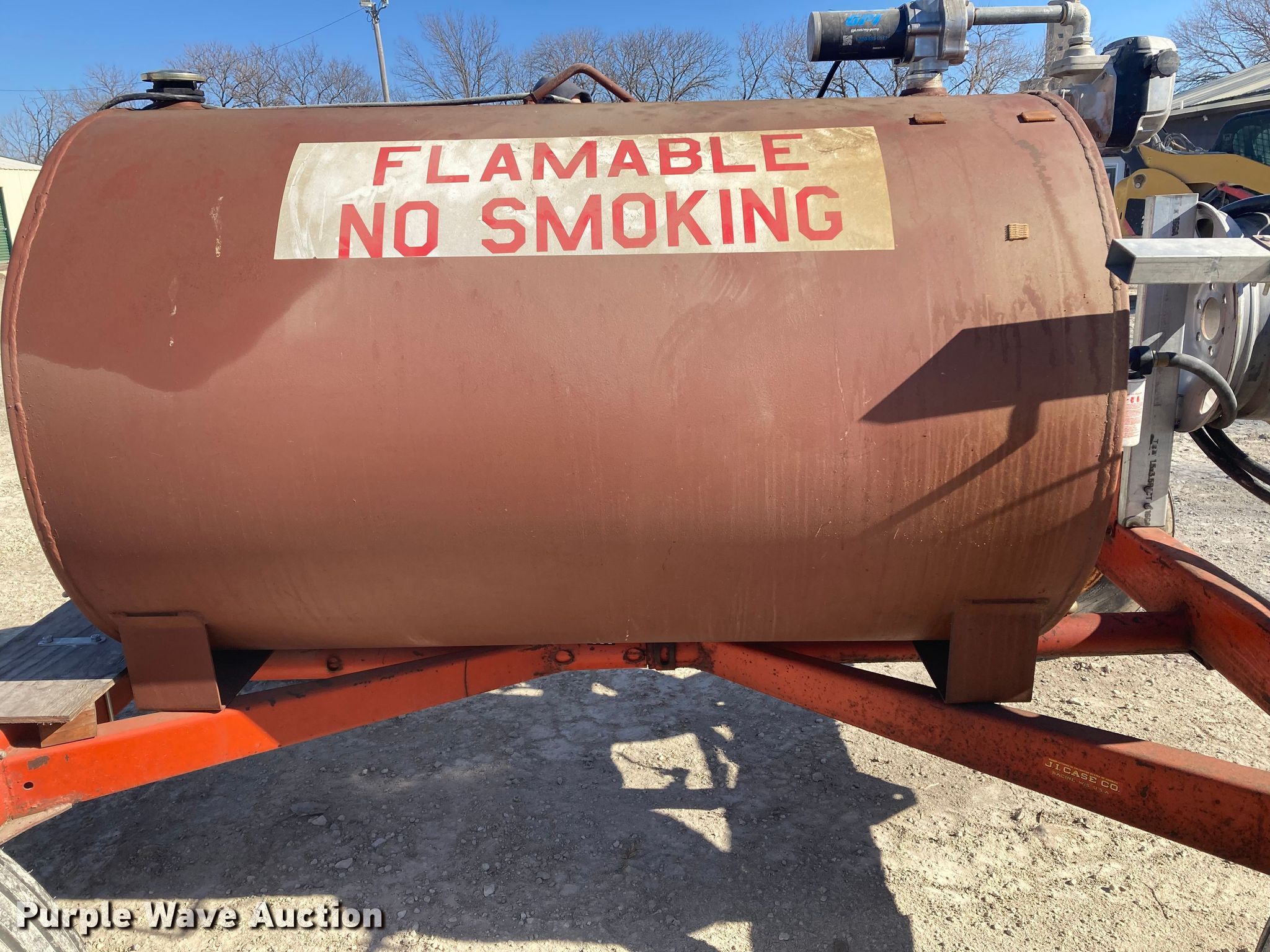Shop built tank trailer. Dimensions. Overall: 6' 8" L x 80" W. Features Tank type: Steel Capacity: 300 gallons, Pump GPI, Fuel nozzle GPI, Flomec QM240 meter. Chassis Hitch: Pintle. Tires Size: 9.5-14. LeDuc Memorial Design. Manhattan, KS 66502