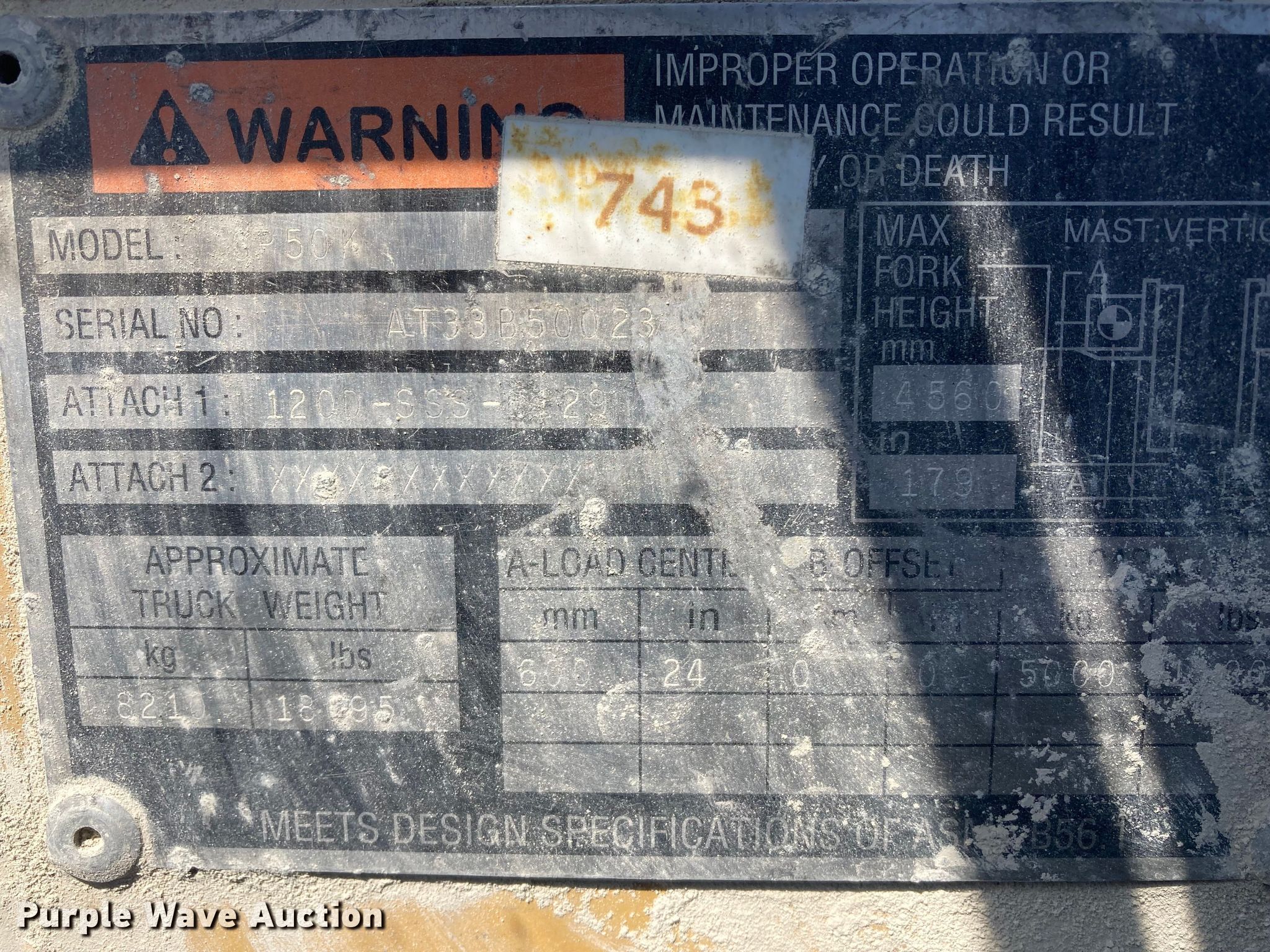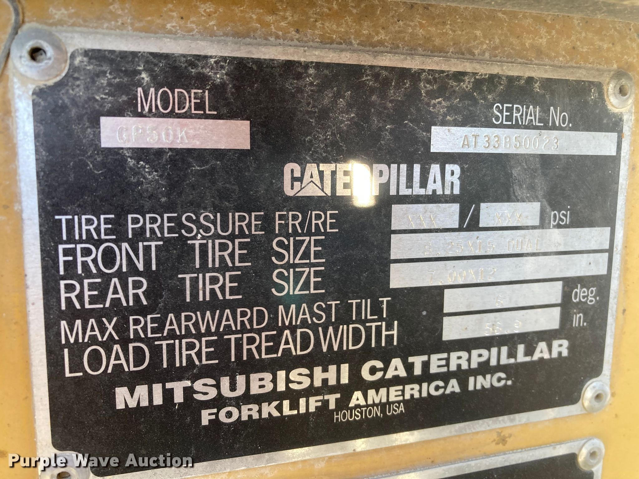 Purple Wave is selling a used Cushion Tire or Pneumatic Forklift in Kansas. This item is a Caterpillar GP50K forklift with the following: Hours: 18,831 on meter, Serial: AT33B50023
