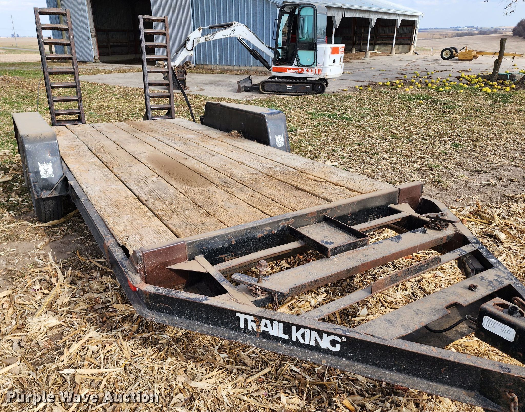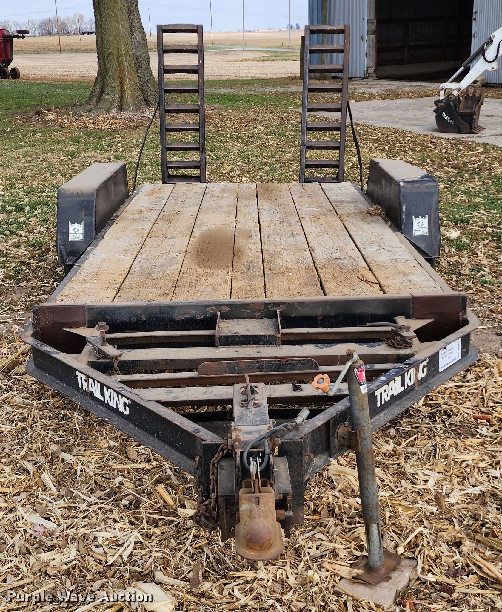 1986 Trail King TK10 equipment trailer. VIN: 1TKU01426GM067572. Dimensions Overall: 20' L x 101" W, Deck: 14' L x 79" W Length: 5'. Features Deck type: Wood. Chassis Ball hitch: 2 5/16", Landing gear: Single, Suspension: Spring, Brakes: Electric. Tires Size: 7-15. Missouri title. Title distribution may be delayed up to 14 days from verification of funds. 11130 220th Road. Blackburn, MO 65321