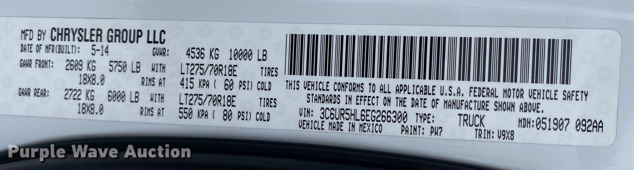 Purple Wave is selling a used 3/4 or 1 Ton Pickup or Van in Oklahoma. This item is a 2014 Dodge Ram 2500HD Crew Cab pickup truck with the following: Miles: 108,576 on odometer, VIN: 3C6UR5HL6EG266300