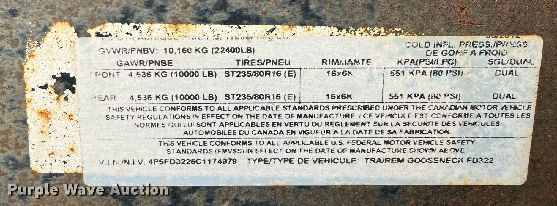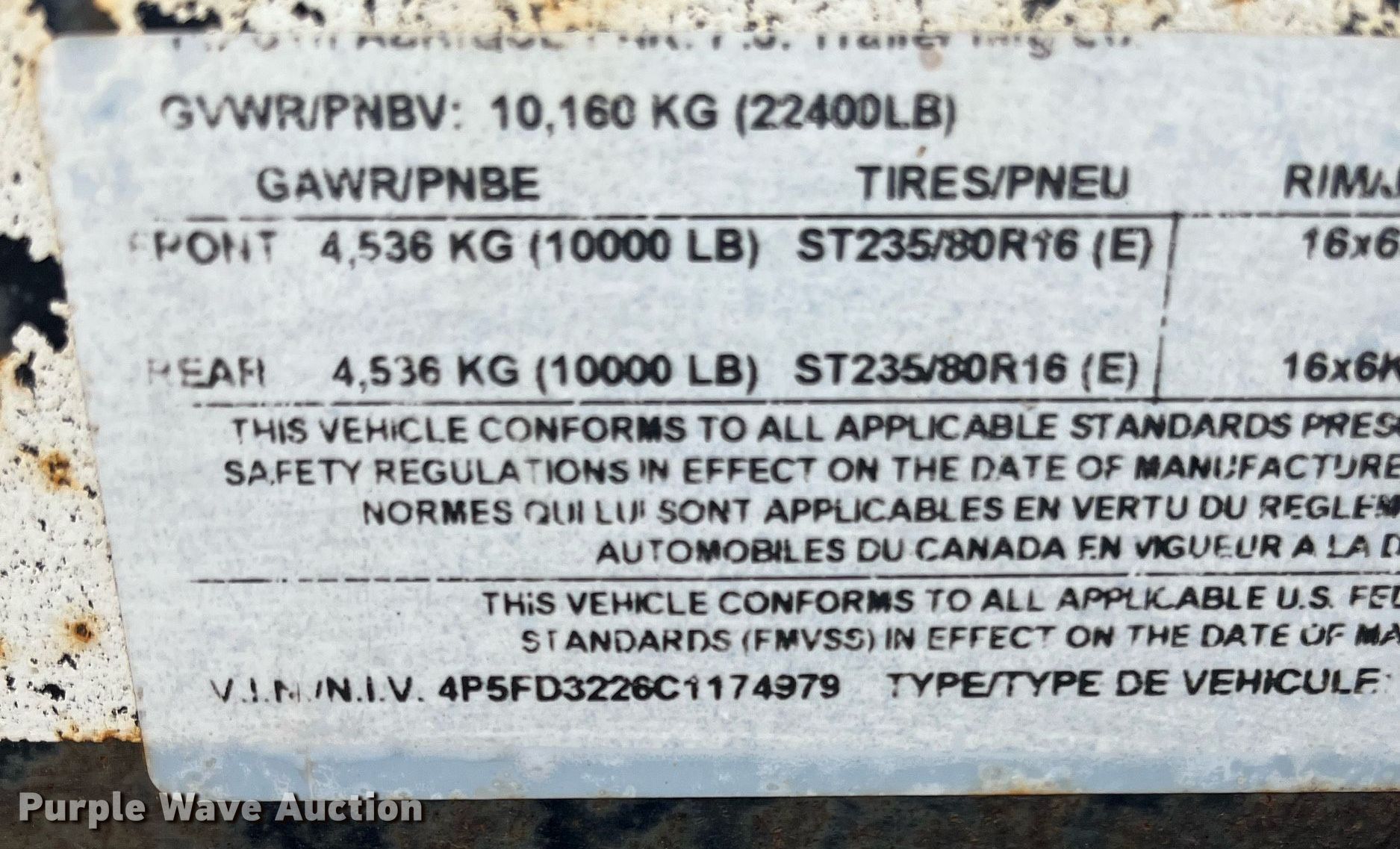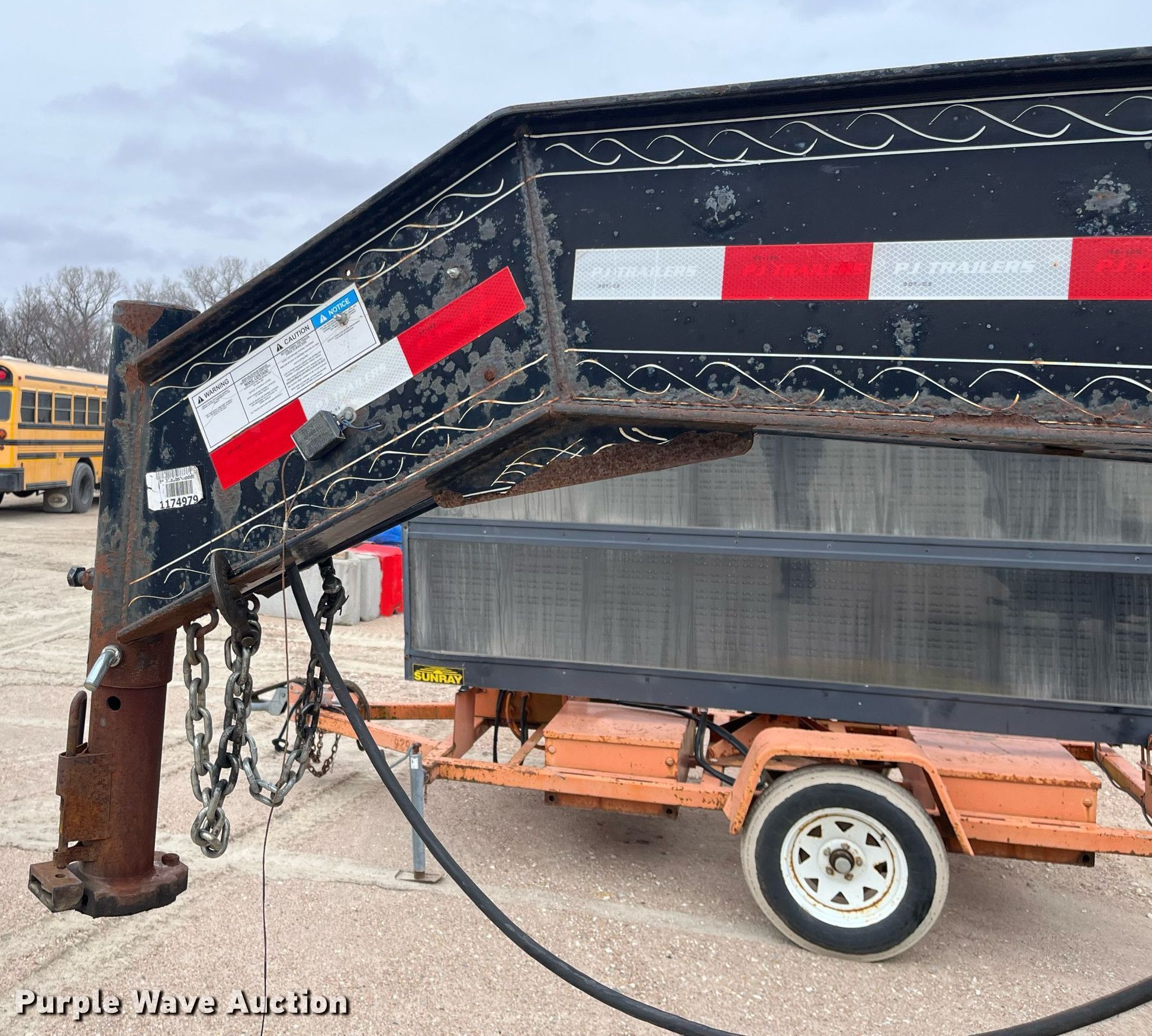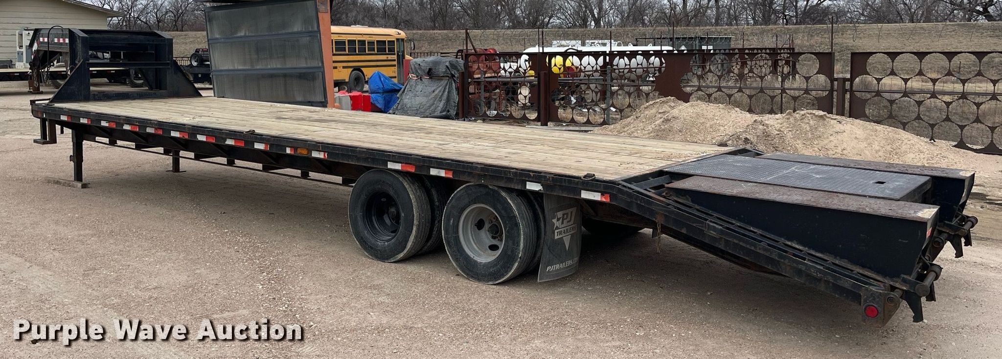 2012 PJ equipment trailer. VIN: 4P5FD3226C1174979. Dimensions Overall: 41' L x 102" W, Deck: 27' L x 96" W, Tail length: 6', Ramps: Manual Length: 60". Features Deck type: Wood. Chassis Hitch: Gooseneck, Landing gear: Dual, Suspension: Spring, Brakes: Electric, Axles: Tandem, GVWR: 22,400 lbs. Tires Steel wheels, Size: 235/85R16. Kansas title. Title distribution may be delayed up to 14 days from verification of funds. Martin Machine & Welding. Halstead, KS 67056