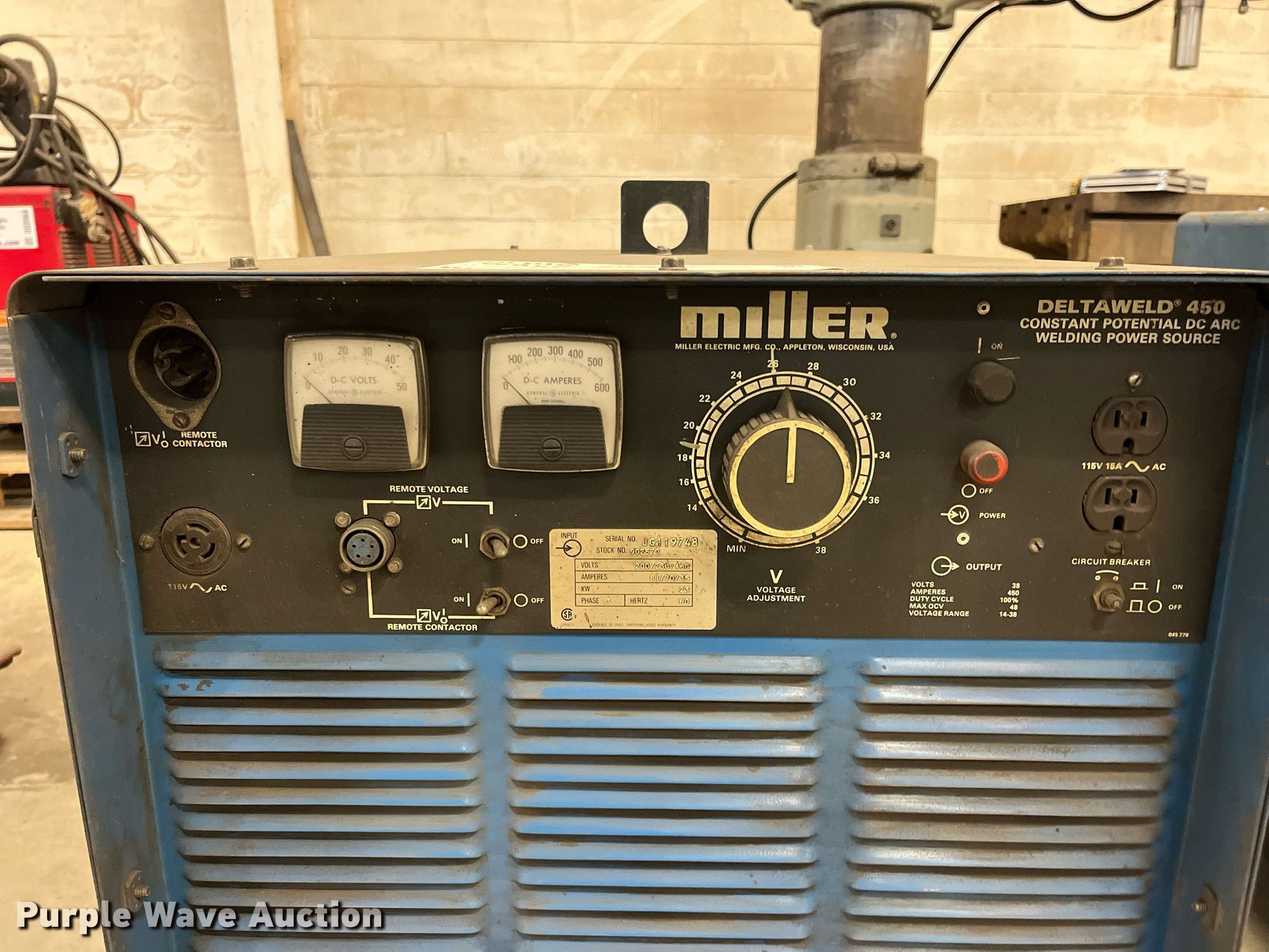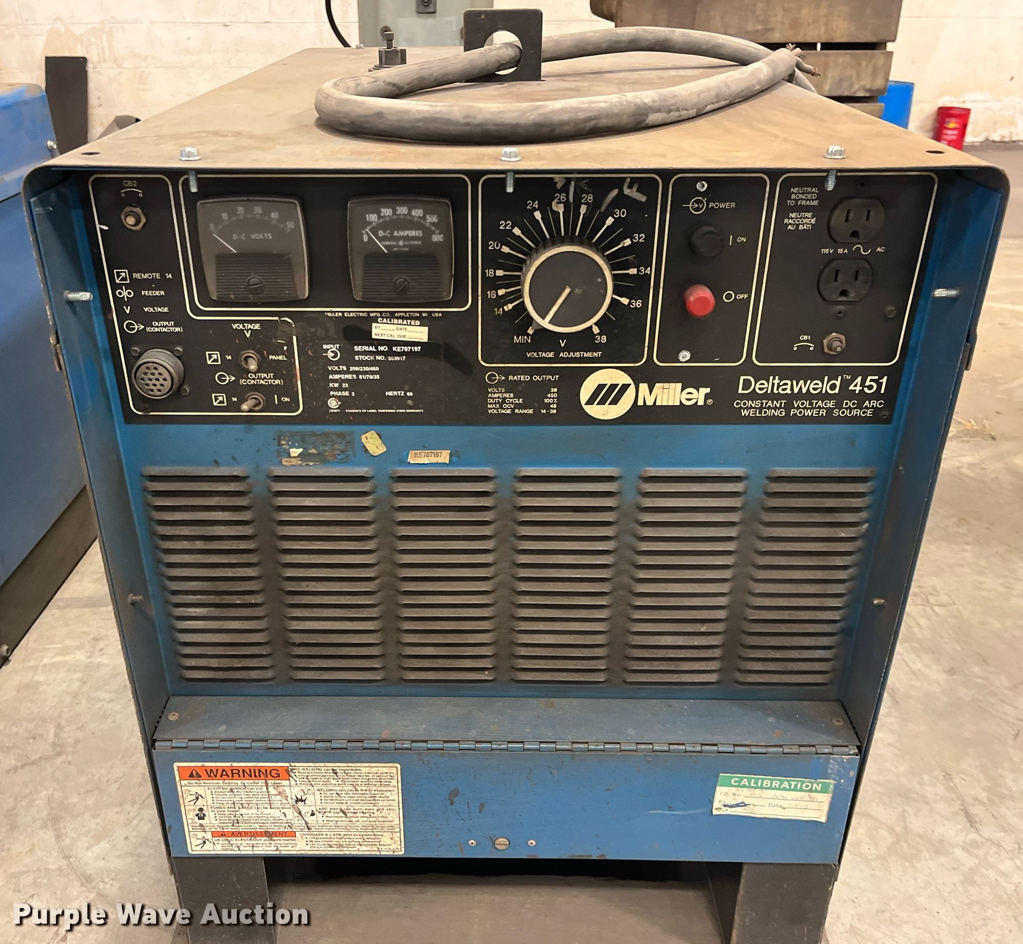 (2) welder/generators. Miller Deltaweld 450. Serial: JG119748. Electric Motor Serial: KE707197, kW: 23, Volts: 200/230/460, Phase: Three. Features Welder Capabilities: DC, AC, Wire, Generator 120V outlets: 2. Notes Missing power cord. Miller Deltaweld 451 Serial: KE707197. Electric Motor kW: 23, Volts: 200/230/460, Phase: Three. Features Welder Capabilities: DC, AC, Wire, Generator 120V outlets: 2. Martin Machine & Welding. Halstead, KS 67056