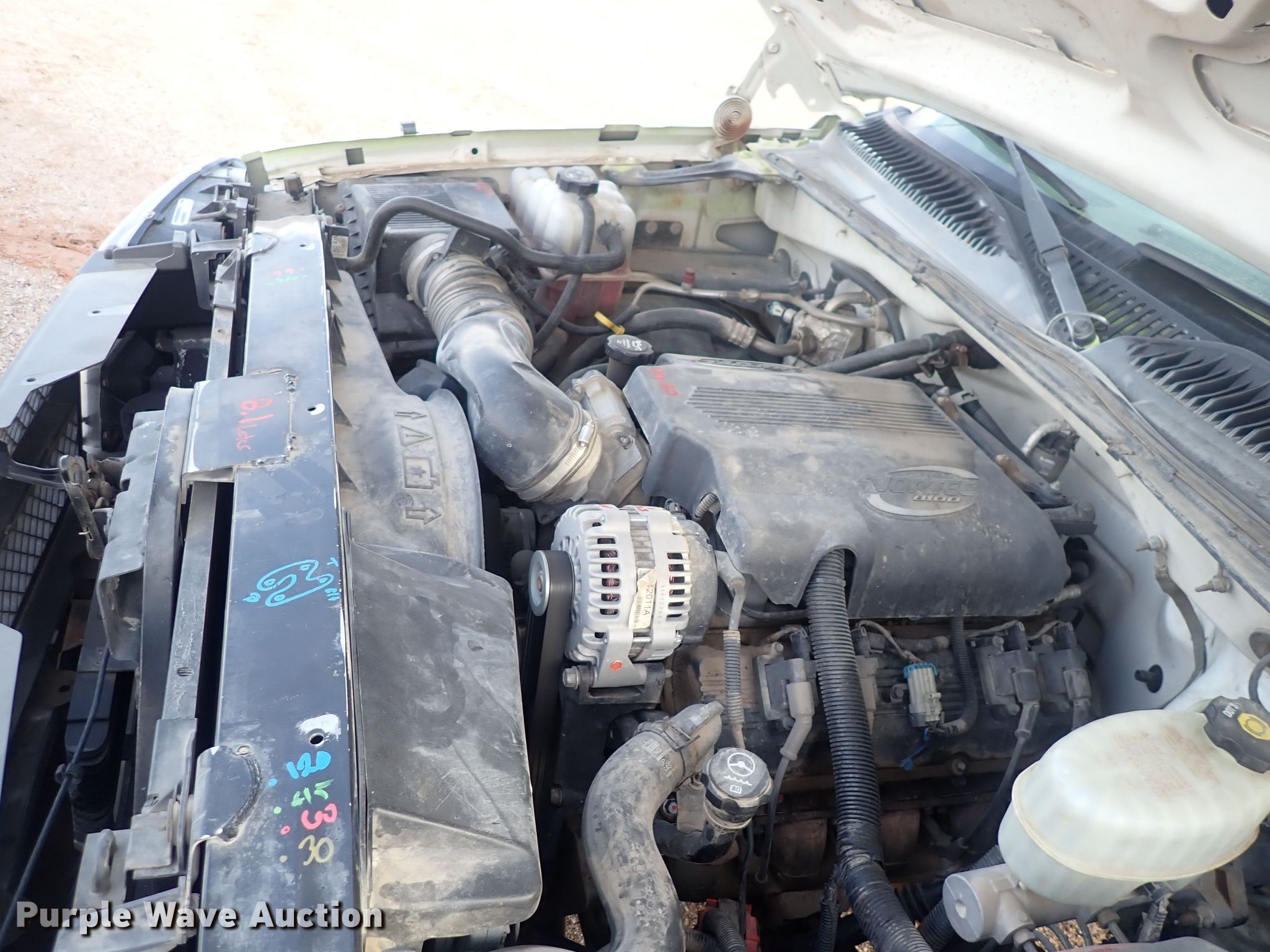 2003 Chevrolet Silverado 3500 Crew Cab flatbed pickup truck. Miles: 189,728 on odometer, VIN: 1GBJC33G33F194678, Unit #: 04.144. Engine Displacement: 8.1L V8 OHV, Cylinders: 8, Fuel type: Gas. Transmission Automatic. Interior AC, Heat, Cruise control. Features Flatbed 10' L x 95" W. Tires Size: LT215/85R16. Notes Driver side door latch issues. Kansas title. Sherwood Construction Company. 3219 W May St. Wichita, KS 67213