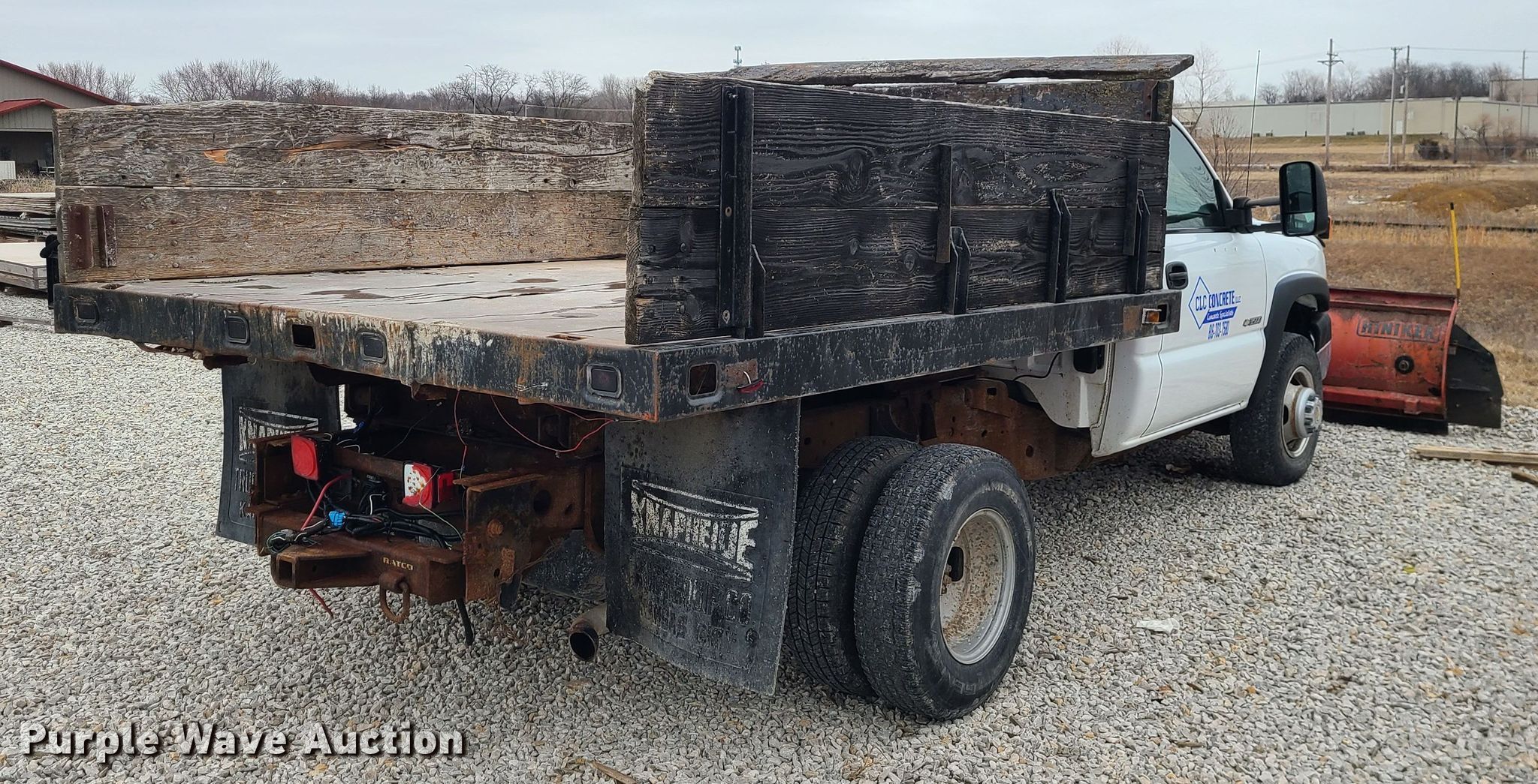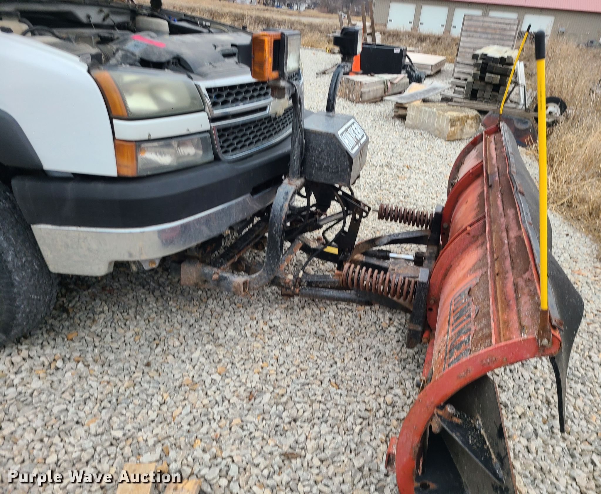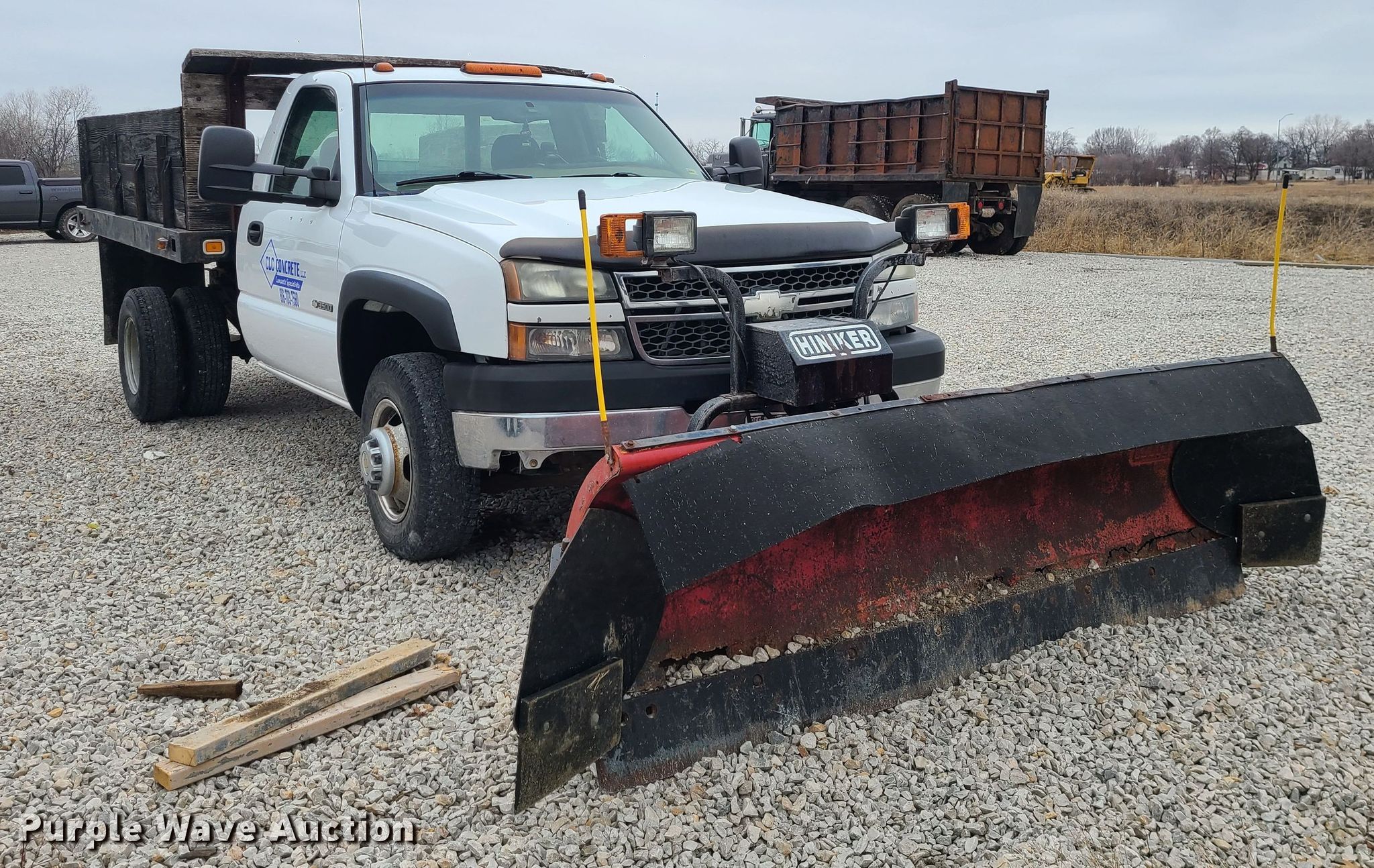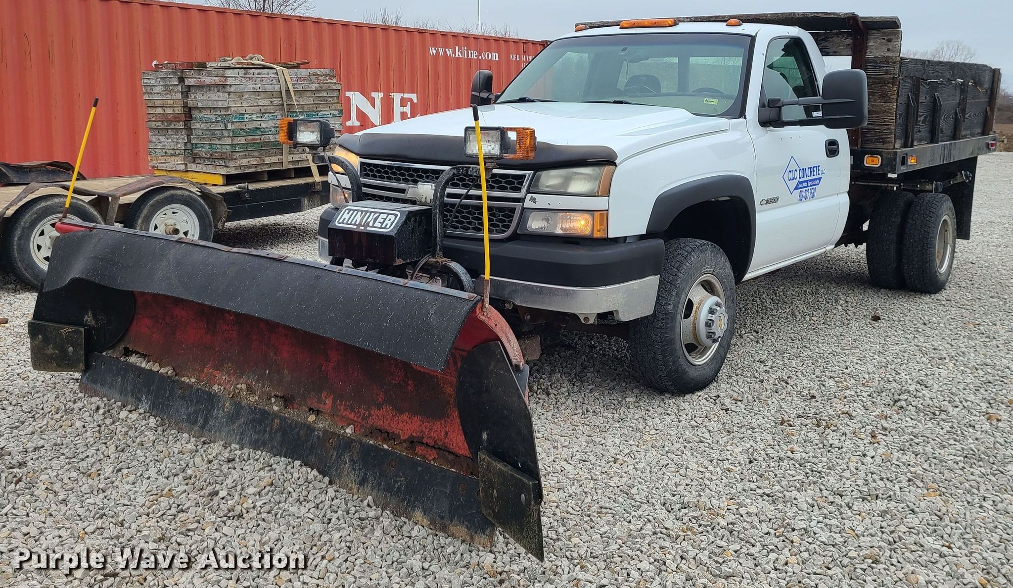 2005 Chevrolet Silverado 3500 dump bed pickup truck. Miles: 367,585 on odometer, VIN: 1GBJK34G55E296669. Engine Displacement: 8.1L V8 OHV, Cylinders: 8, Fuel type: Gas. Transmission Automatic, Four wheel drive. Interior AC, Heat, Power windows. Features Dump flatbed 9' 3" L x 94" W, Hiniker snow plow 116" W. Tires Size: 215/85R16. Notes Dash warning indicator: ABS. Missouri title. Title distribution may be delayed up to 14 days from verification of funds. CLC Concrete. 1300 Richland Parkway. Pleasant Hill, MO 64080