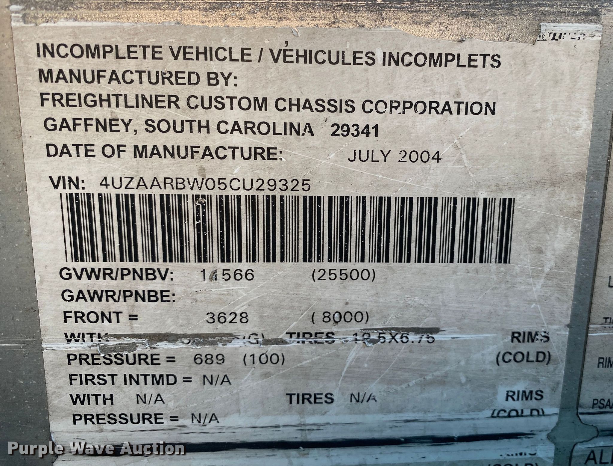 2005 Freightliner MT55 delivery van. Miles: 305,537 on odometer, VIN: 4UZAARBW05CU29325. Engine Displacement: 5.9L, Cylinders: 6, Fuel type: Diesel. Transmission Automatic. Interior Heat. Features Box bed 22' L x 93" W x 96" H. Tires Size: 245.70R19.5. Notes Dash warning indicator: ABS. Oklahoma title. Title distribution may be delayed up to 14 days from verification of funds. 15107 North 137th East Avenue. Collinsville, OK 74021