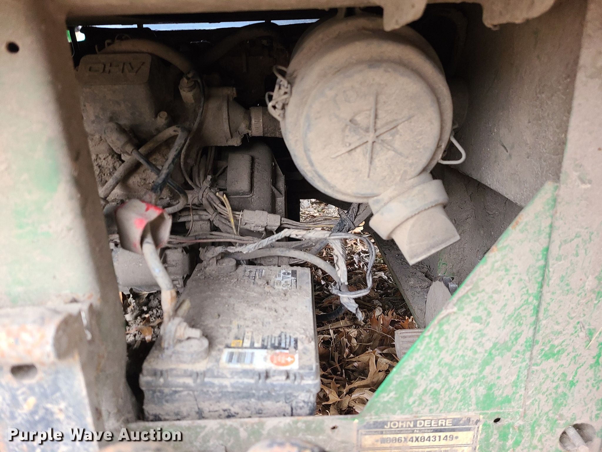 John Deere Gator 6X4 utility vehicle. Hours: 2,037 on meter, Serial: W006X4X043149. Features Dump bed 44" L x 53" W, Dump bed type: Manual. Tires Front: 22.5x10x8, Rear: 25x13x9. Notes Non-operational unit. Transfer of ownership documentation will be a bill of sale. 273 NW Division Road. Centerview, MO 64019