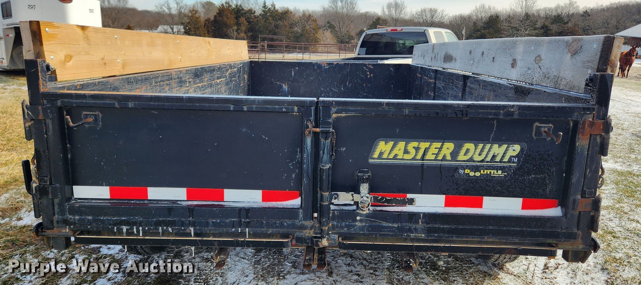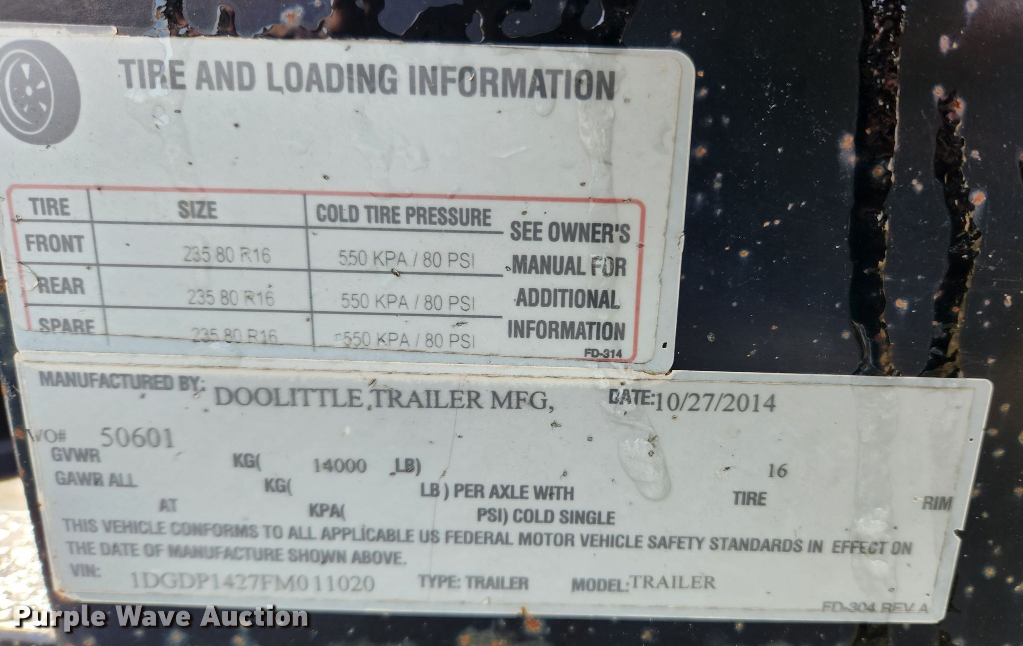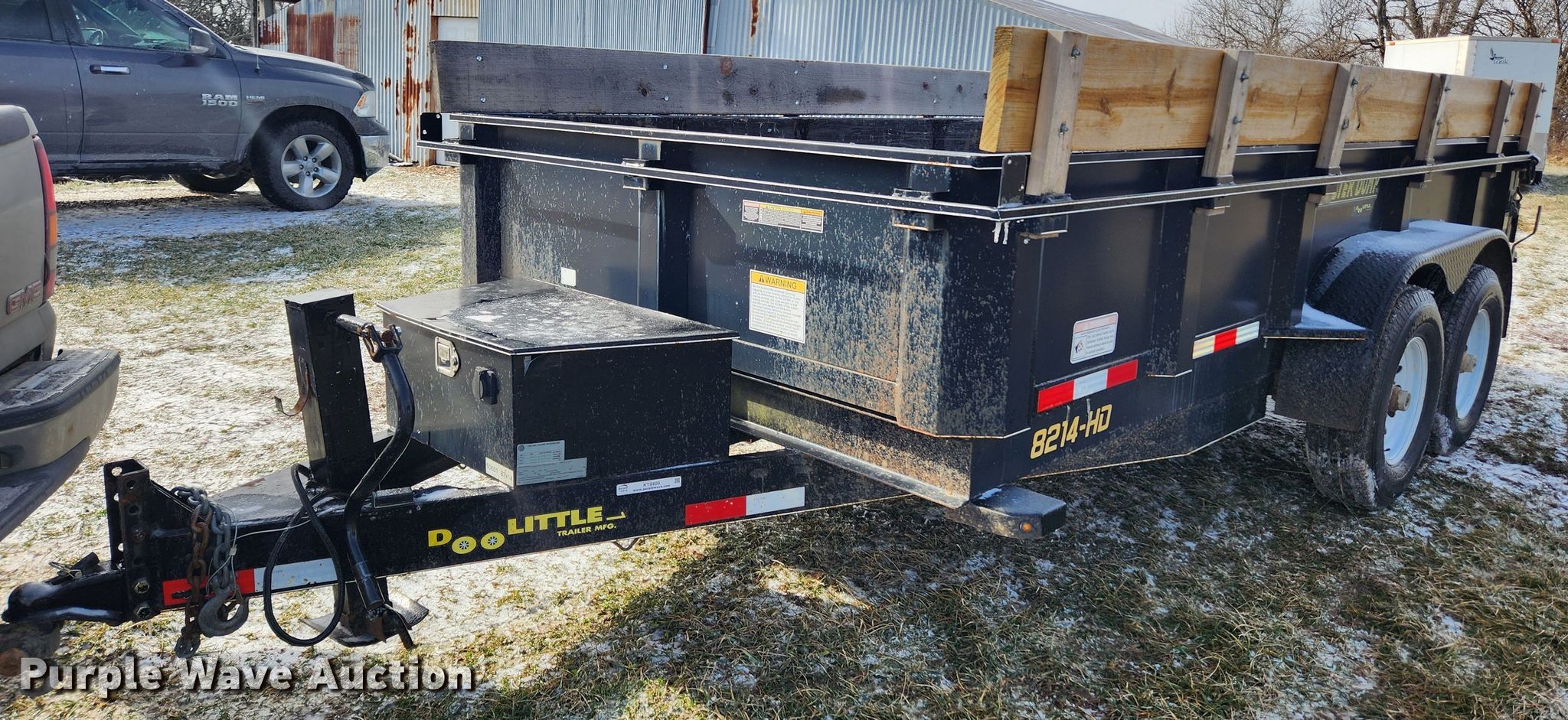 2015 Doolittle 8214HD dump trailer. VIN: 1DGDP1427FM011020. Dimensions Overall: 19' L x 106" W, Body: 14' L x 82" W, Side height: 24", Sideboard height: 9". Features Body type: Steel, Ram: Single, End gate: Manual, Wireless remote. Chassis Ball hitch: 2 5/16", Landing gear: Single, Suspension: Spring, Brakes: Electric, Axles: Tandem, GVWR: 14,000 lbs. Tires Steel wheels, Size: 235/80R16. Missouri title. Title distribution may be delayed up to 14 days from verification of funds. 3791 Farris Road. Owensville, MO 65066