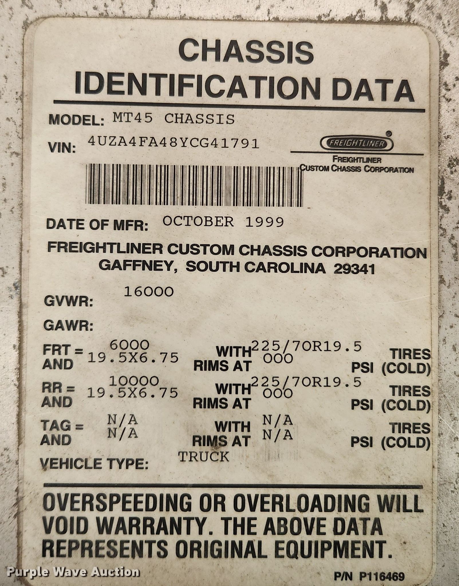 Purple Wave is selling a used Delivery Truck or Van in Missouri. This item is a 2000 Freightliner MT45 delivery van with the following: Miles: 76,073 on odometer, VIN: 4UZA4FA48YCG41791