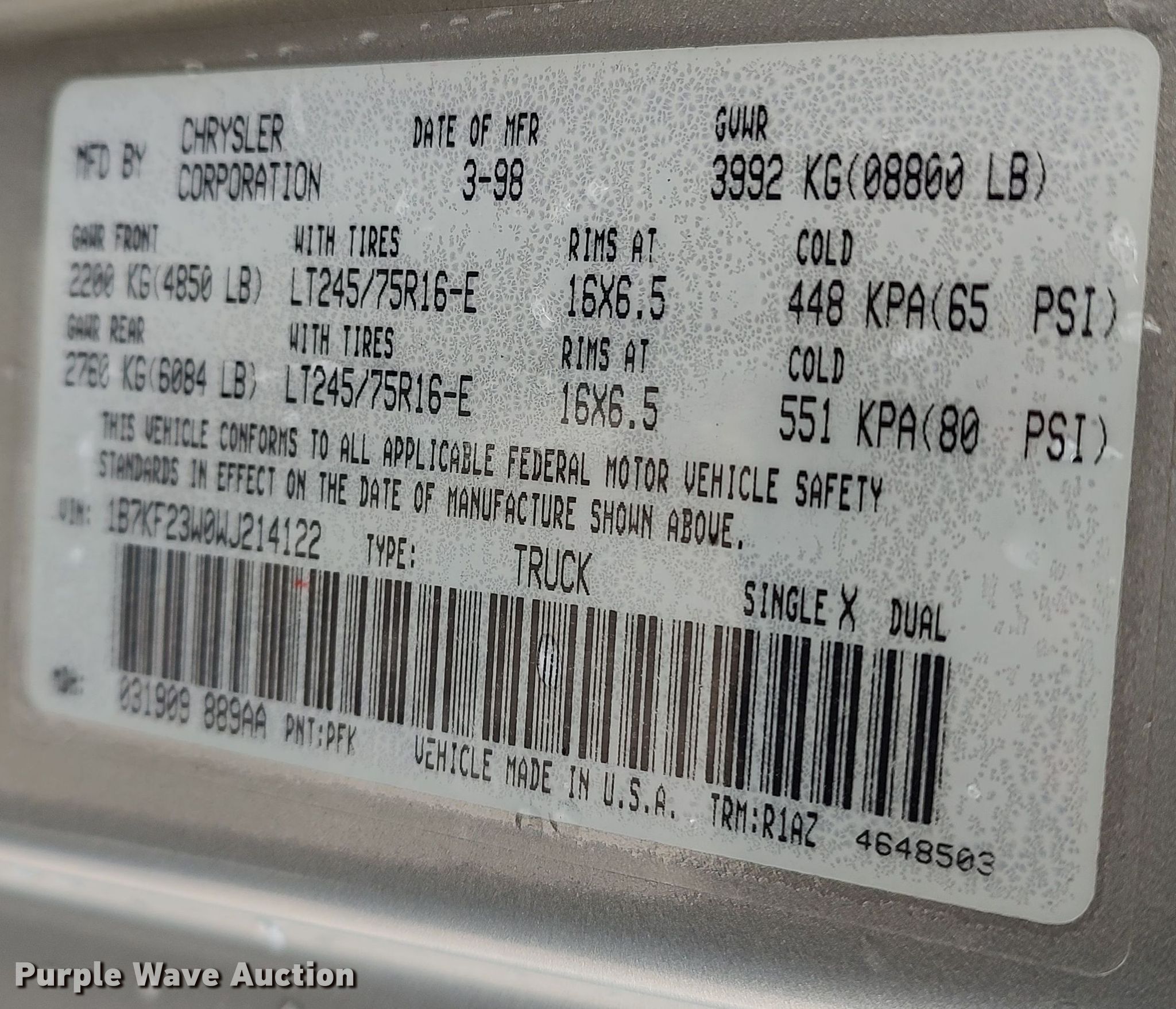 - VIN: 1B7KF23W0WJ214122