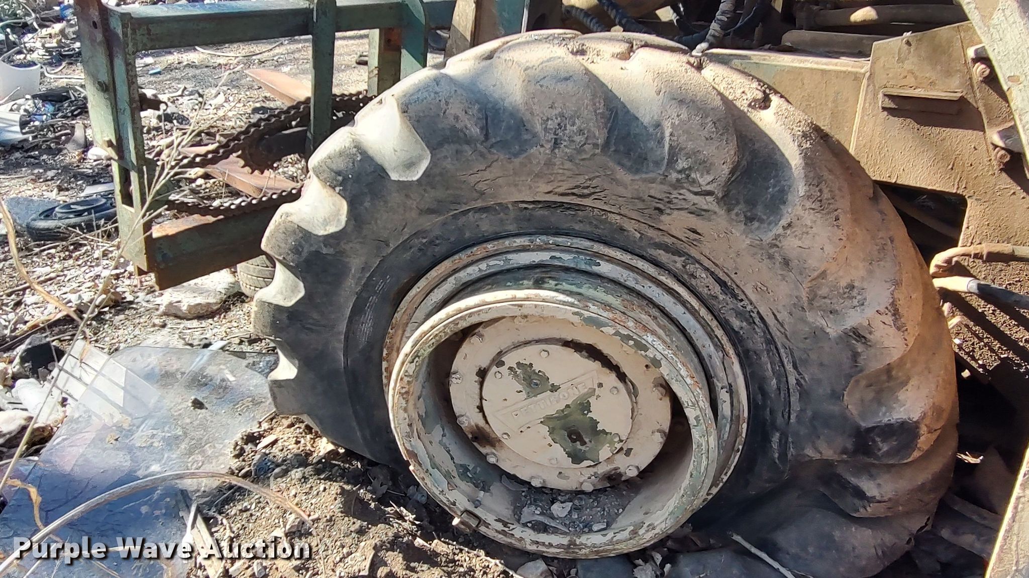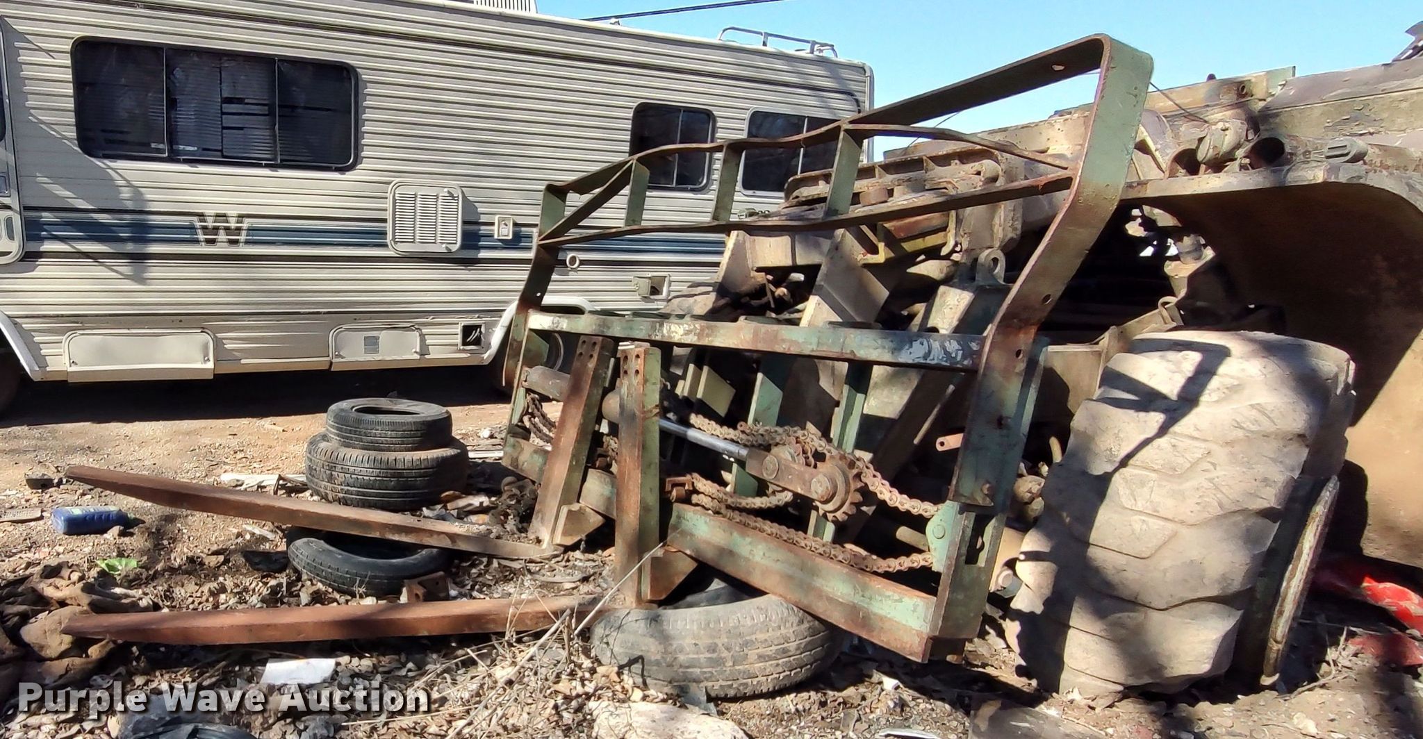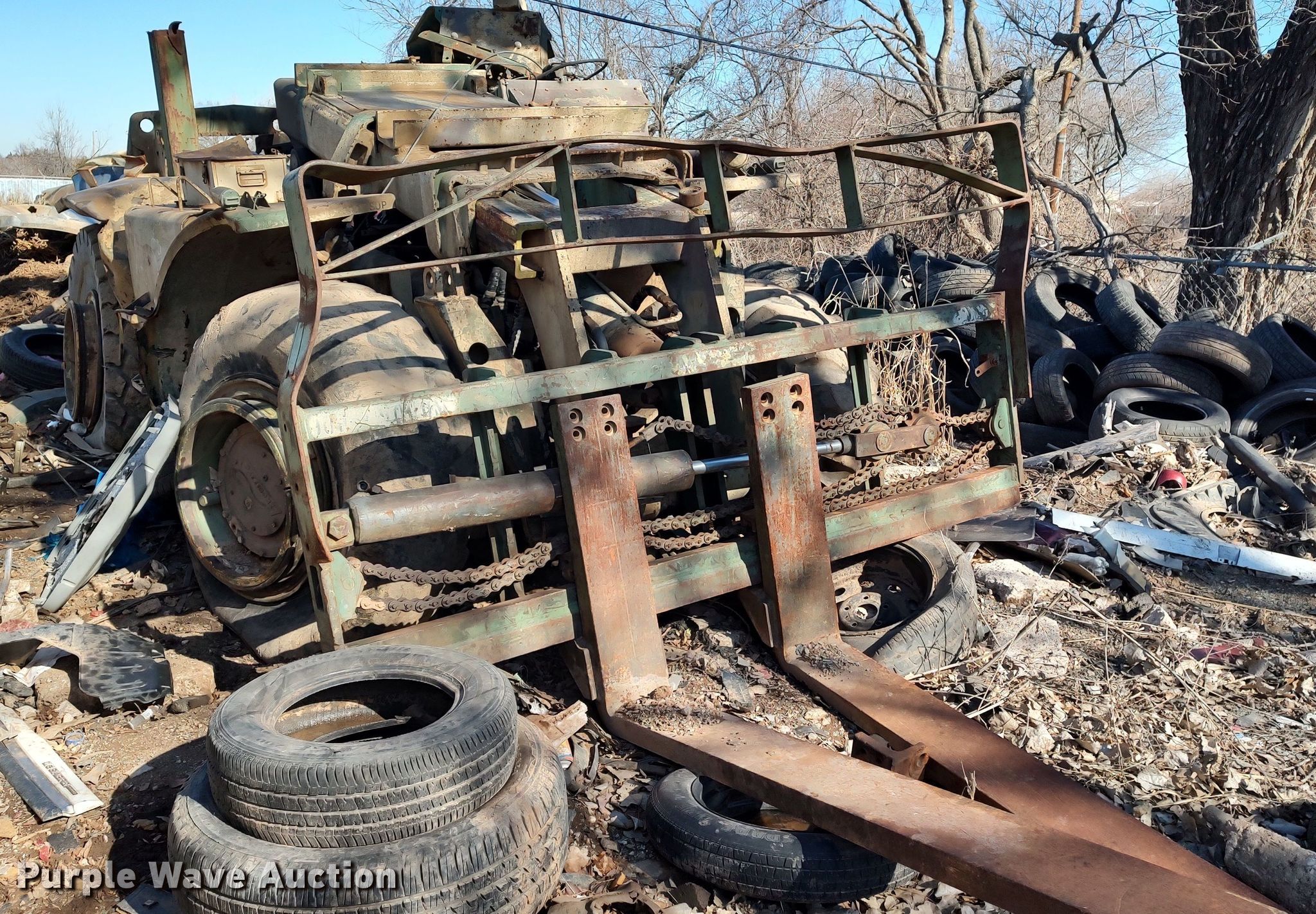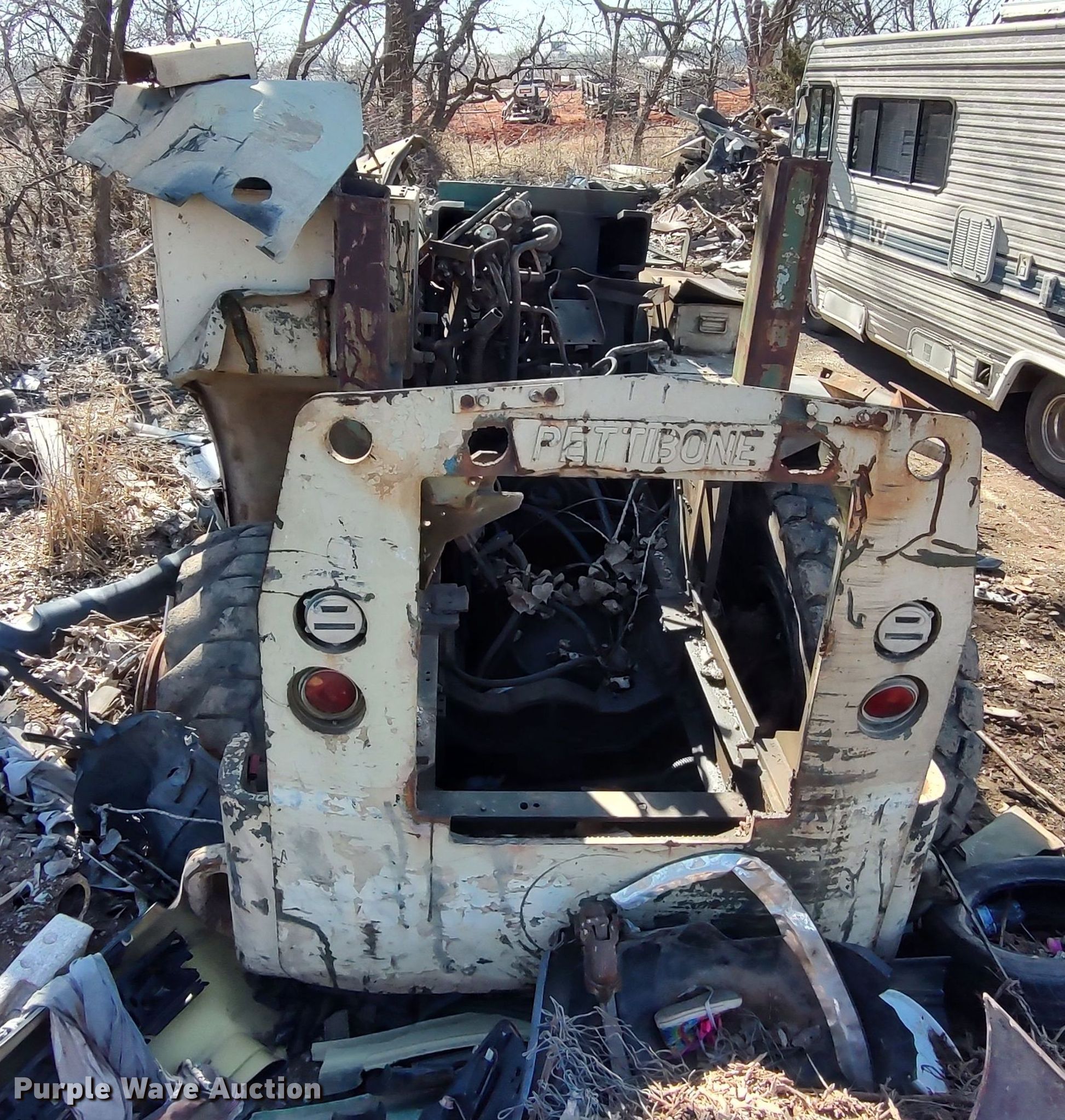 Pettibone telehandler. Hours: 574 on meter. Transmission Powershift. Features Fork length: 72". Tires Front: 20.5-25. Notes Engine missing, Parts may be missing, Flat tires, Non-operational unit. Newcastle Salvage. 4300 Newcastle Rd. Oklahoma City, OK 73119