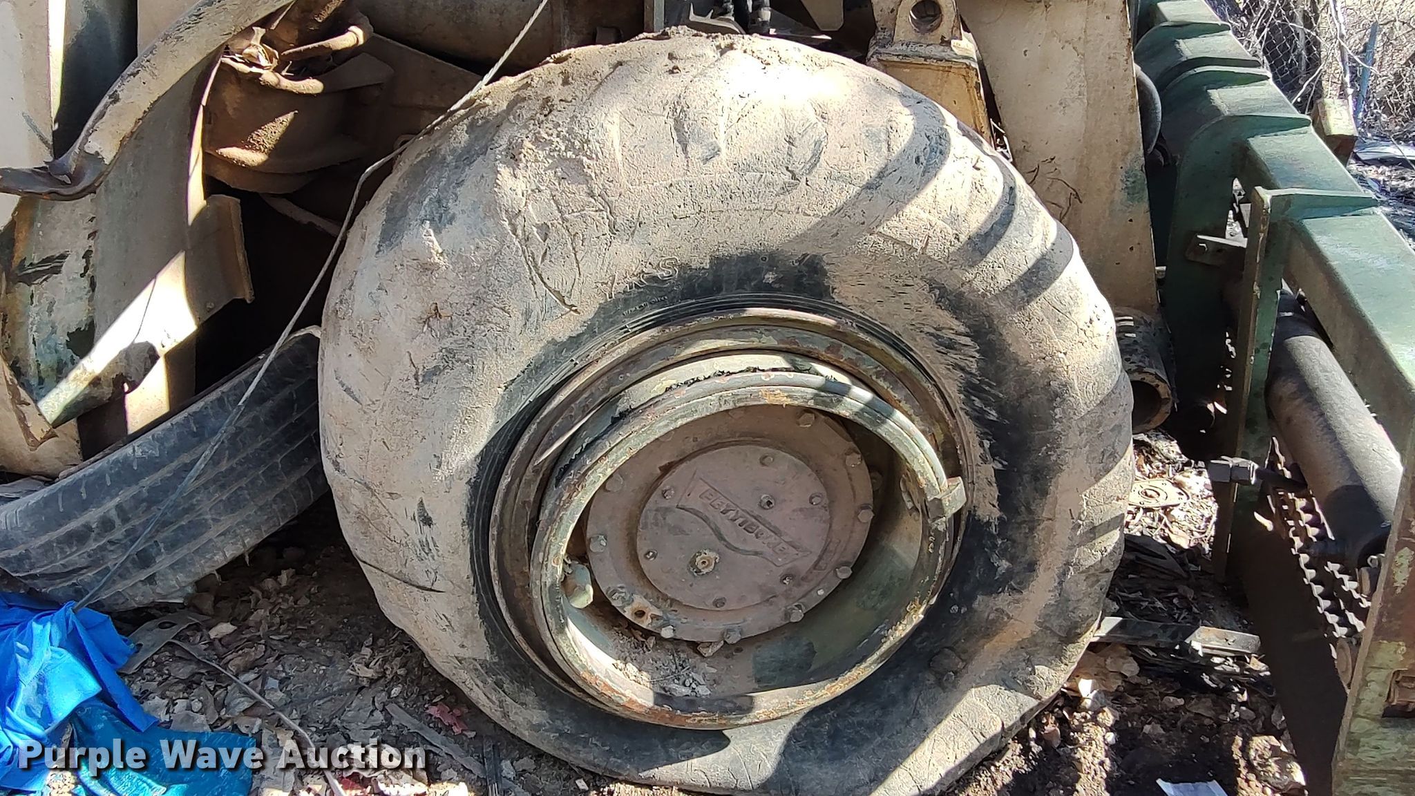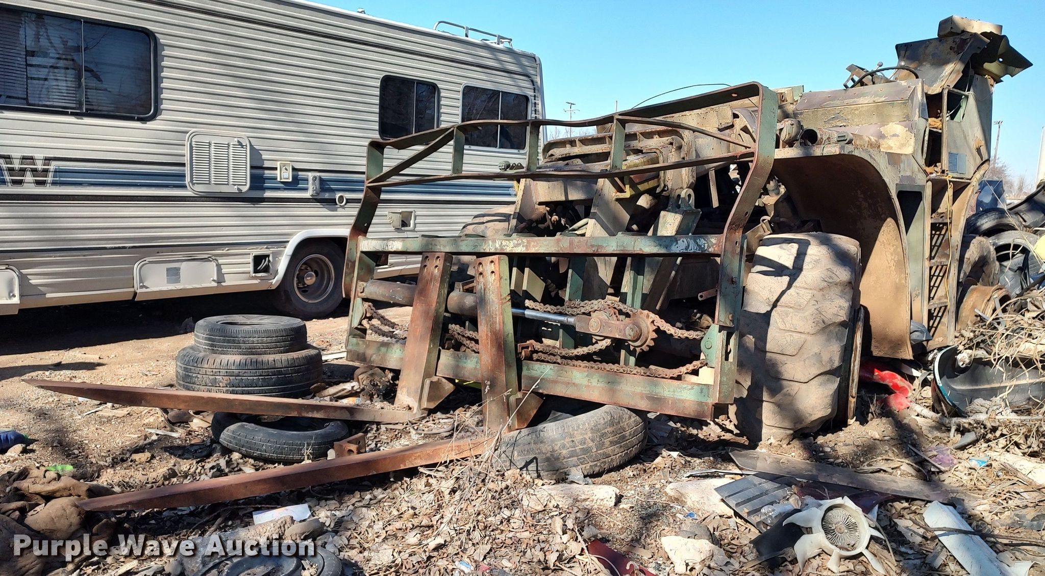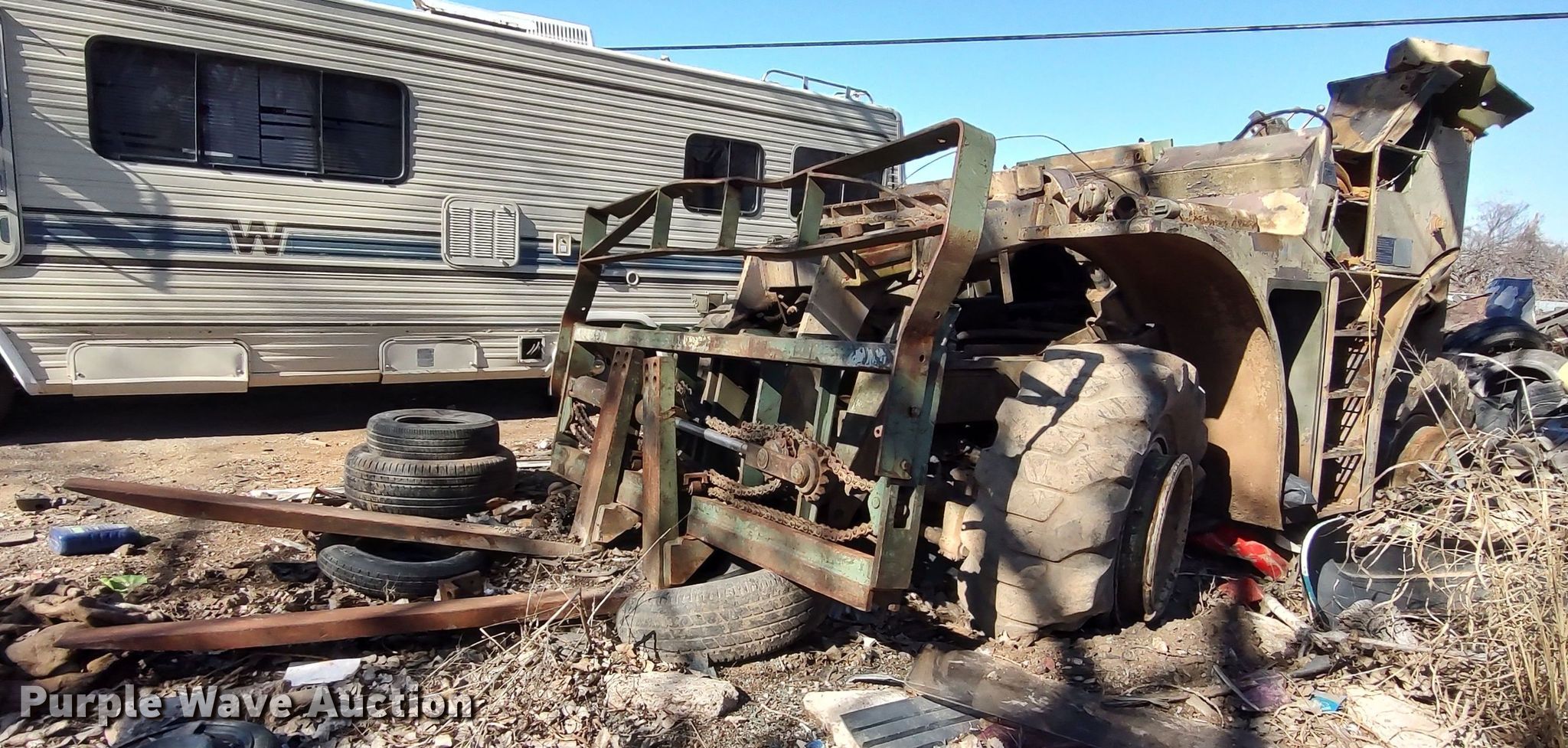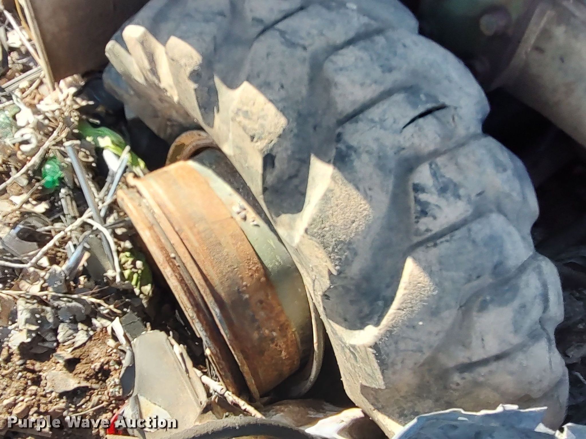 Pettibone telehandler. Hours: 574 on meter. Transmission Powershift. Features Fork length: 72". Tires Front: 20.5-25. Notes Engine missing, Parts may be missing, Flat tires, Non-operational unit. Newcastle Salvage. 4300 Newcastle Rd. Oklahoma City, OK 73119