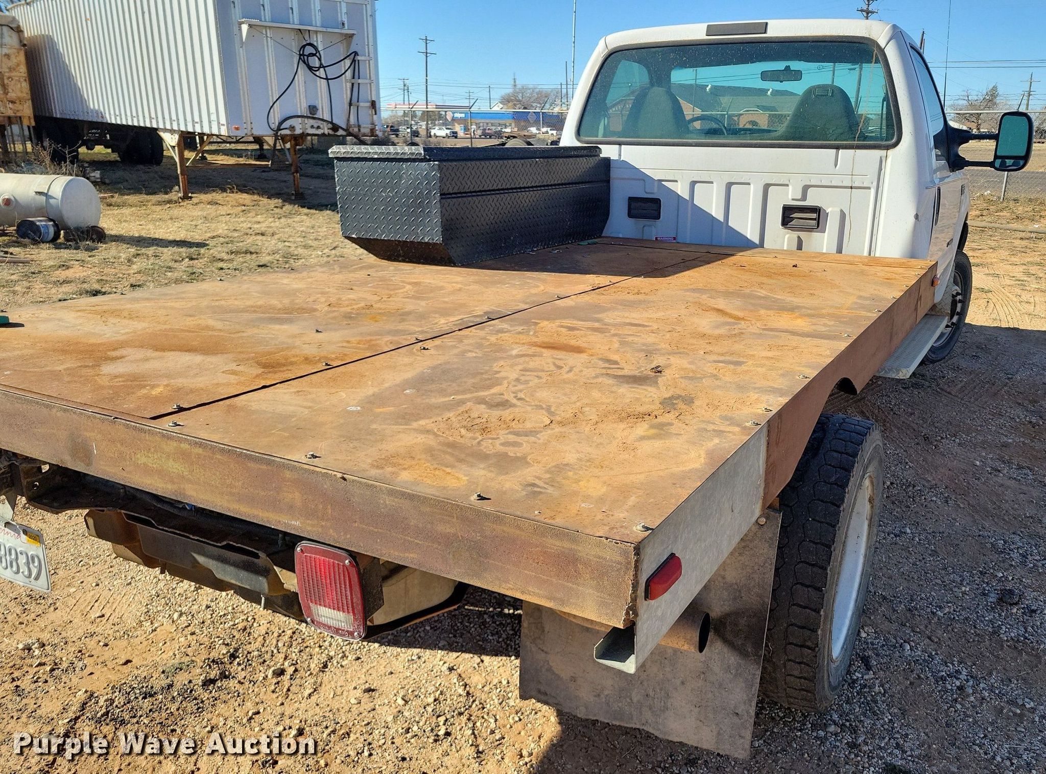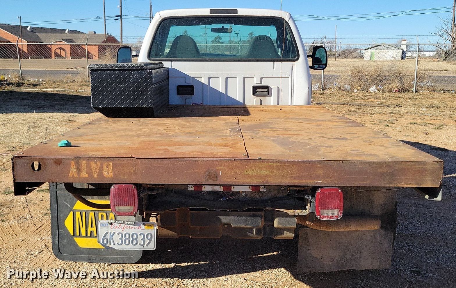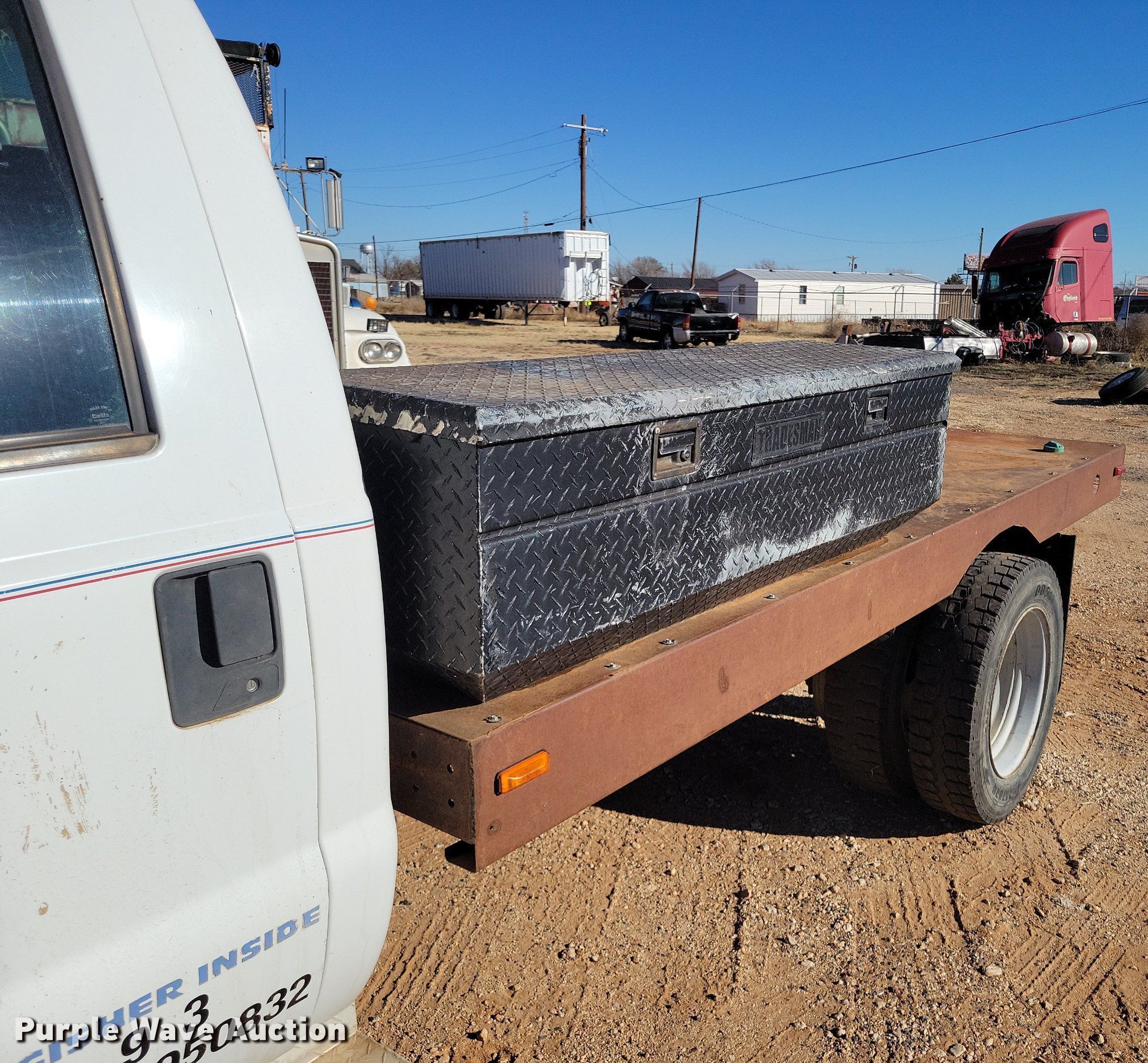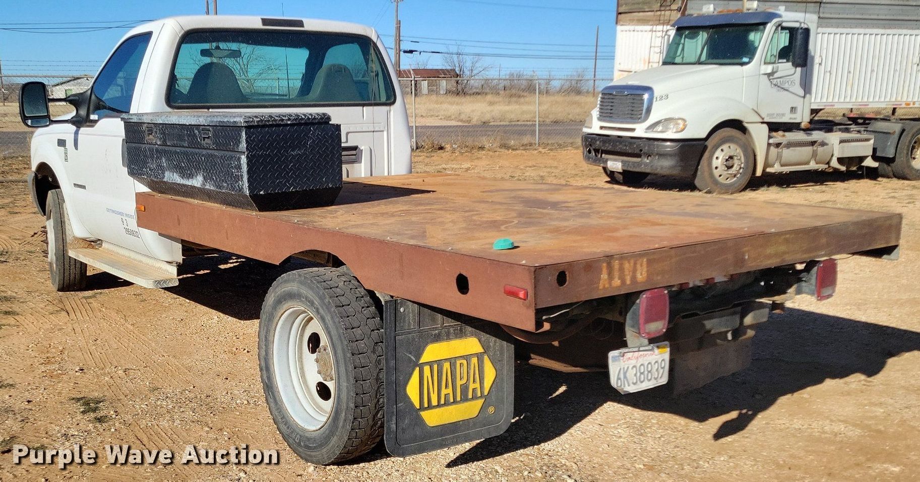 2000 Ford F450 Super Duty flatbed truck. Miles: 330,927 on odometer, VIN: 1FDXF46F7YEE28769. Engine Displacement: 7.3L, Cylinders: 8, Fuel type: Diesel. Transmission Automatic. Chassis Axles: Single, Suspension: Spring, Brakes: Hydraulic, GVWR: 15,000 lbs, Wheelbase: 165". Interior AC, Heat. Features Flatbed 11' L x 84" W. Tires Size: 225/70R19.5. Notes Windshield chipped or cracked. California title. 717 Seagraves Hwy. Brownfield, TX 79316