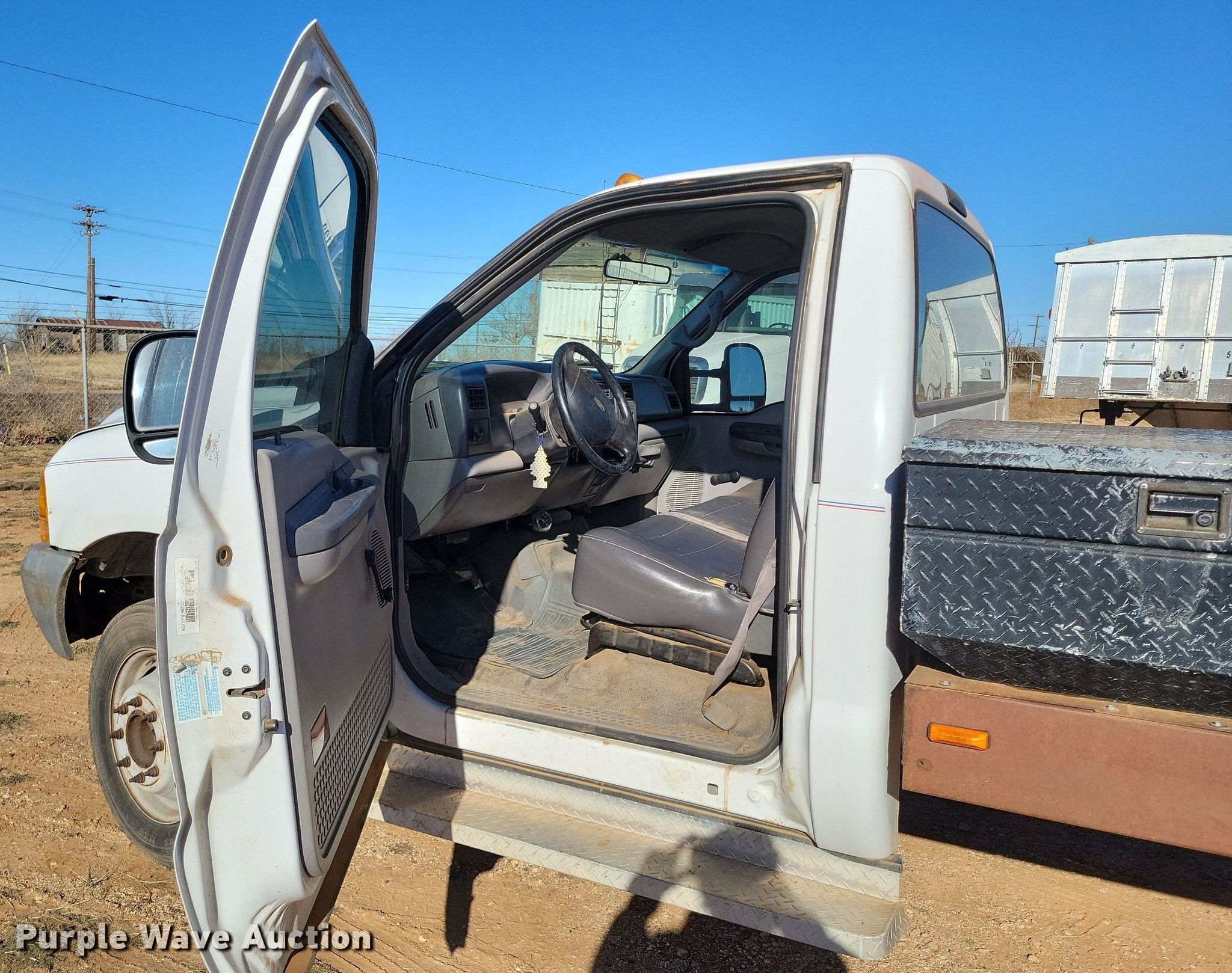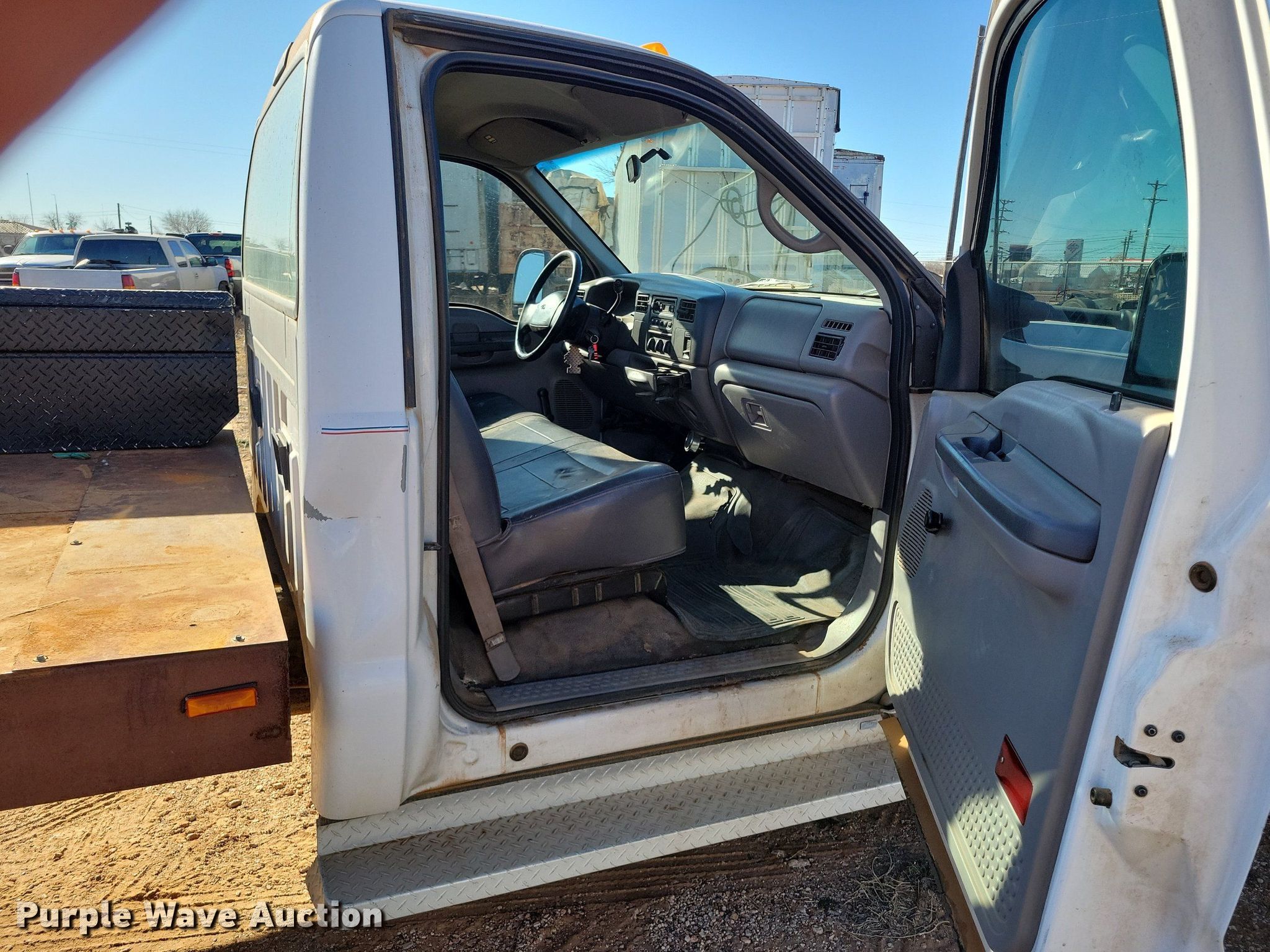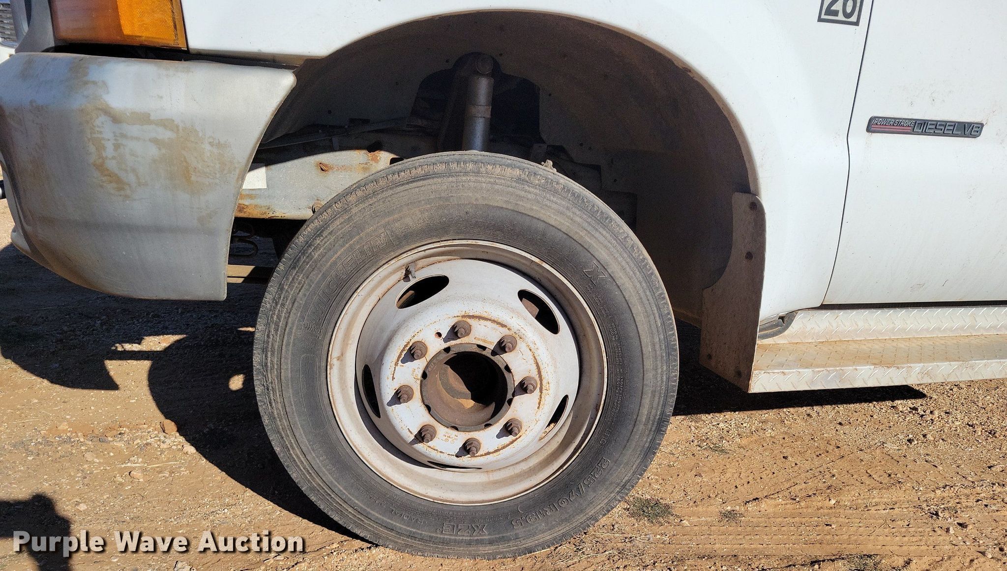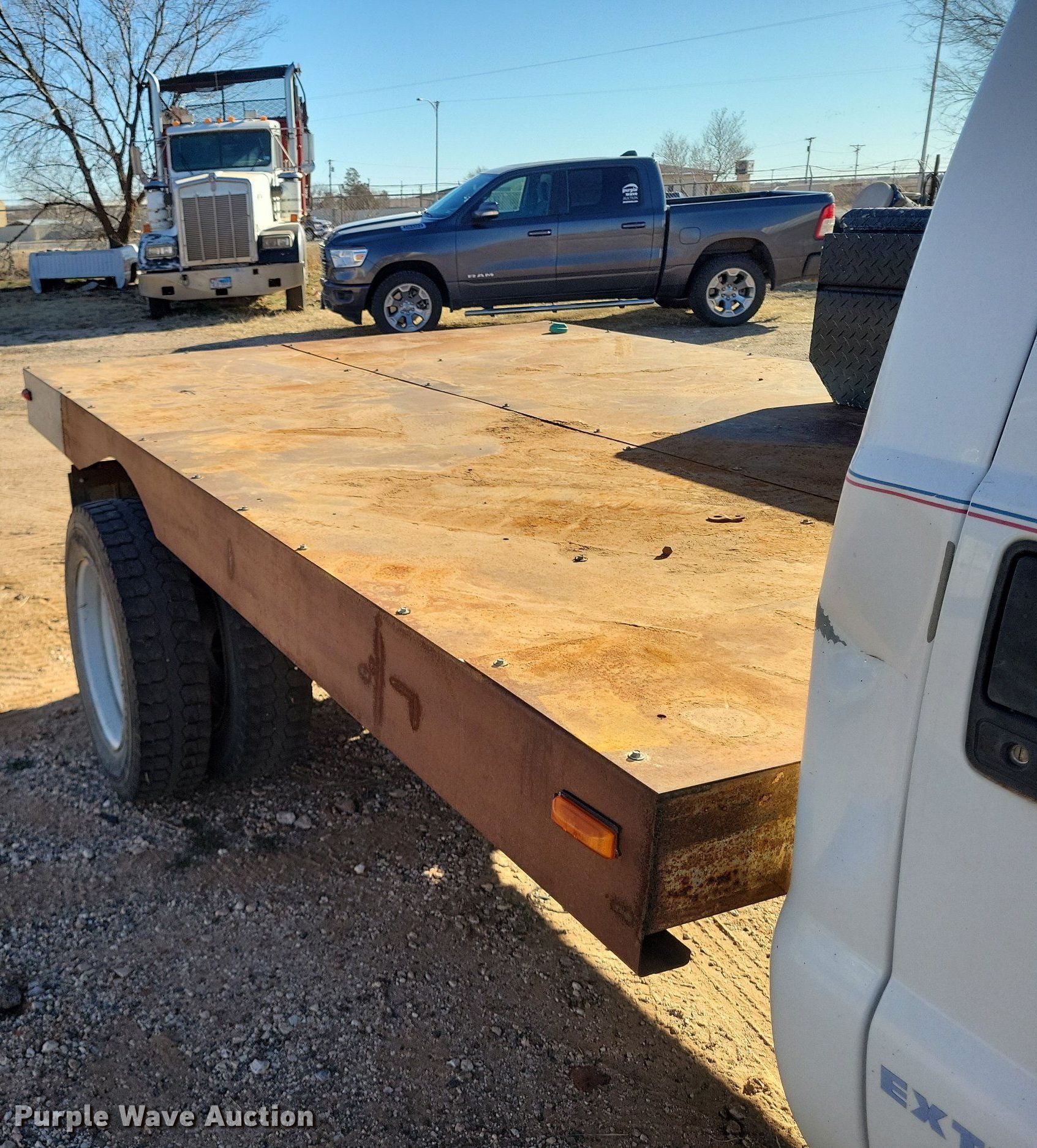 2000 Ford F450 Super Duty flatbed truck. Miles: 330,927 on odometer, VIN: 1FDXF46F7YEE28769. Engine Displacement: 7.3L, Cylinders: 8, Fuel type: Diesel. Transmission Automatic. Chassis Axles: Single, Suspension: Spring, Brakes: Hydraulic, GVWR: 15,000 lbs, Wheelbase: 165". Interior AC, Heat. Features Flatbed 11' L x 84" W. Tires Size: 225/70R19.5. Notes Windshield chipped or cracked. California title. 717 Seagraves Hwy. Brownfield, TX 79316