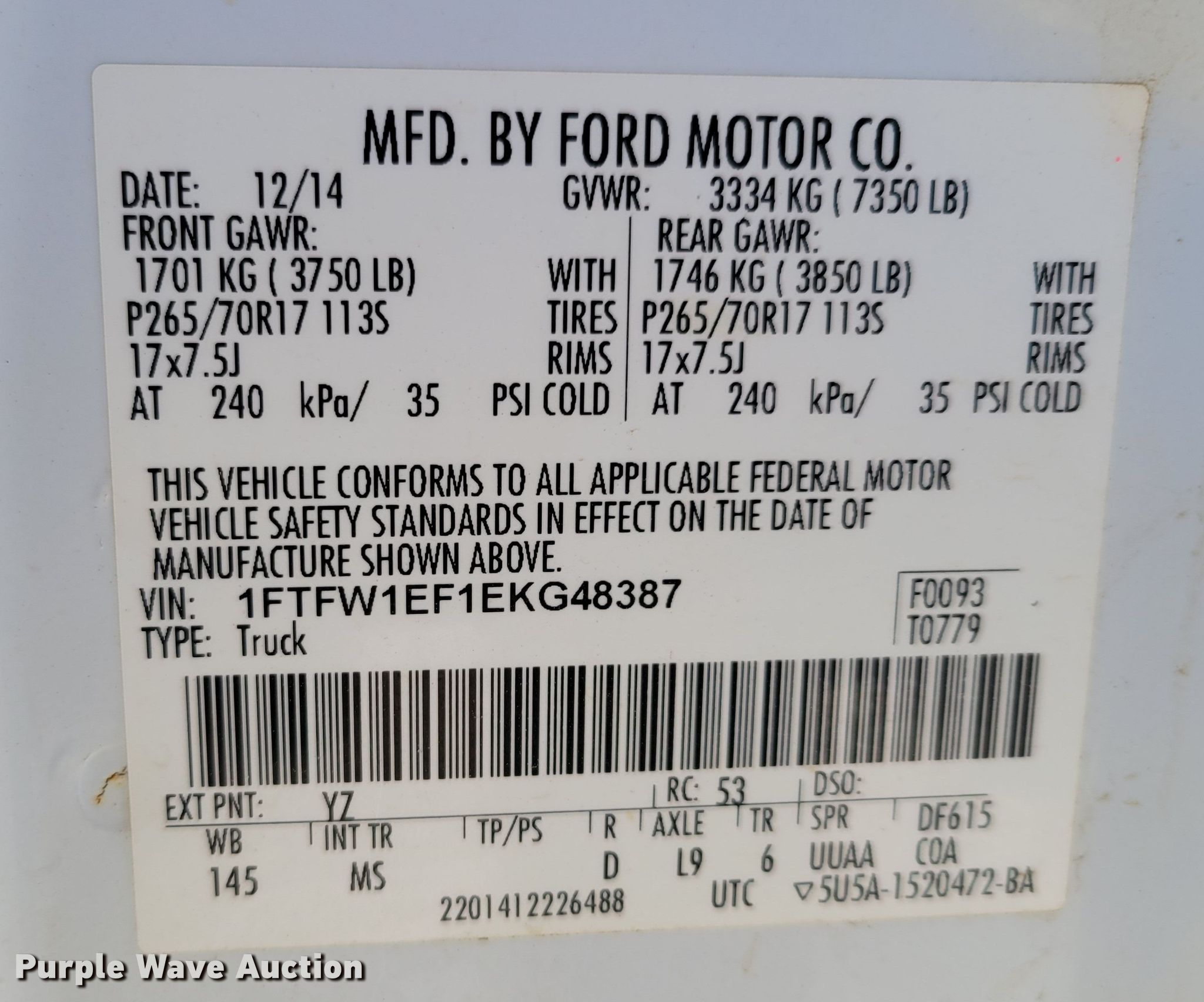 2014 Ford F150 XLT SuperCrew pickup truck. Miles: 242,362 on odometer, VIN: 1FTFW1EF1EKG48387. Engine Displacement: 5.0L V8, Cylinders: 8, Fuel type: Gas. Transmission Automatic, Four wheel drive. Interior AC, Heat, Seat: Power driver, Power windows, Power locks, Cruise control. Tires Size: LT265/70R17. Notes Dash warning indicator: Check engine, Windshield chipped or cracked. View repairs. Nebraska title. Title distribution may be delayed up to 14 days from verification of funds. Commercial Contractors Equipment, Inc.. 701 Northwest 27th Street. Lincoln, NE 68528