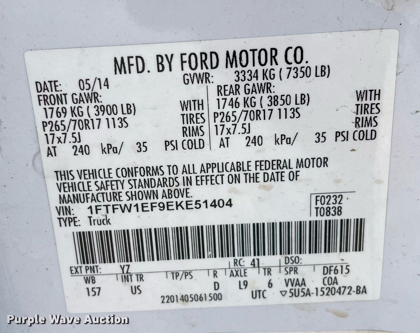 2014 Ford F150 XLT SuperCrew pickup truck. Miles: 231,216 on odometer, VIN: 1FTFW1EF9EKE51404. Engine Displacement: 5.0L V8, Cylinders: 8, Fuel type: Gas. Transmission Automatic, Four wheel drive. Interior AC, Heat, Seat: Power driver, Heated mirrors, Power windows, Power locks, Cruise control. Tires Size: 265/70R17. Notes Dash warning indicator: TPMS, Air bag, Rear passenger door latch issues. Illinois title. Title distribution may be delayed up to 14 days from verification of funds. The Waldinger Corporation/GP Systems. 2020 E. Wilkins Drive. Chillicothe, IL 61523