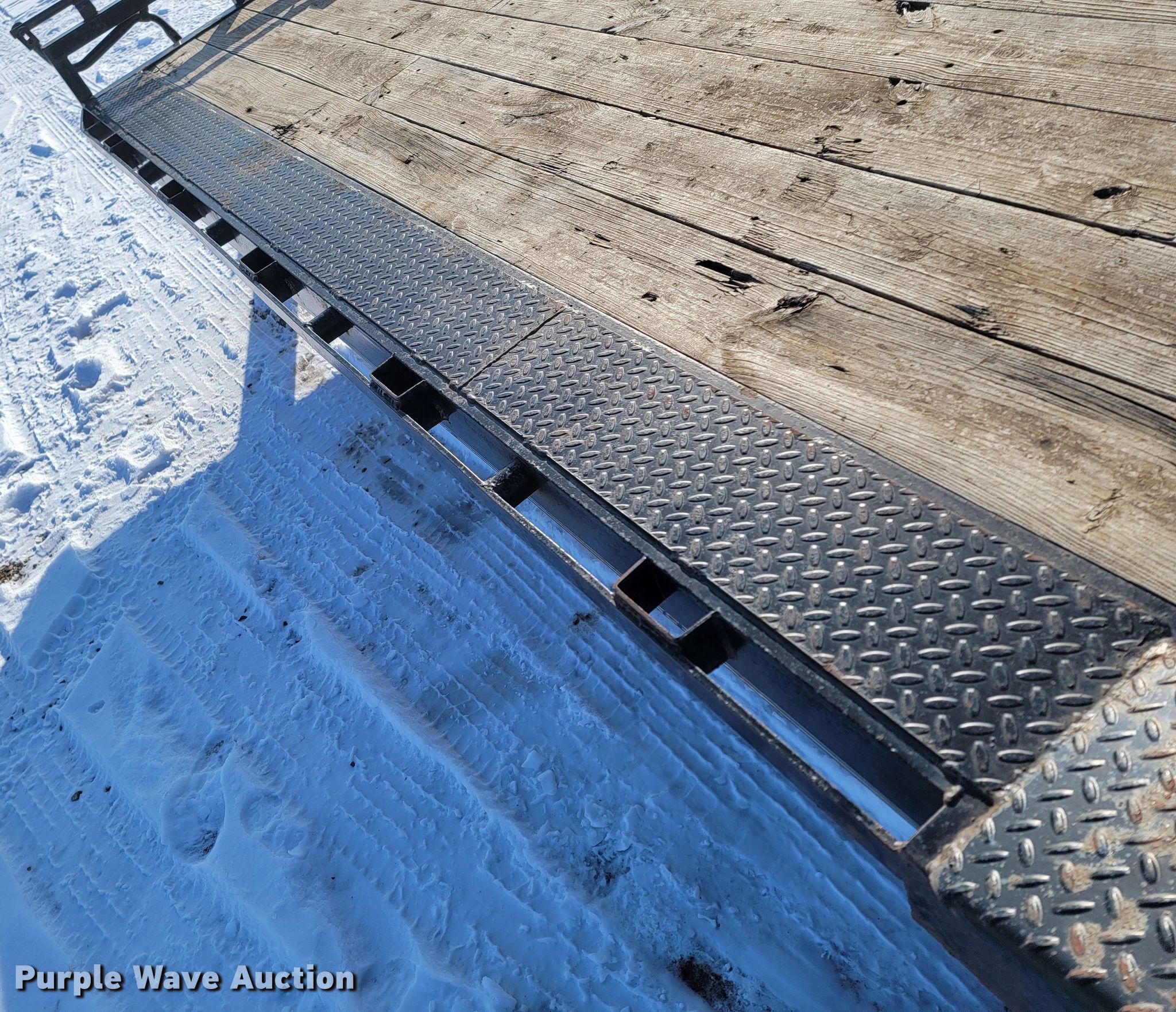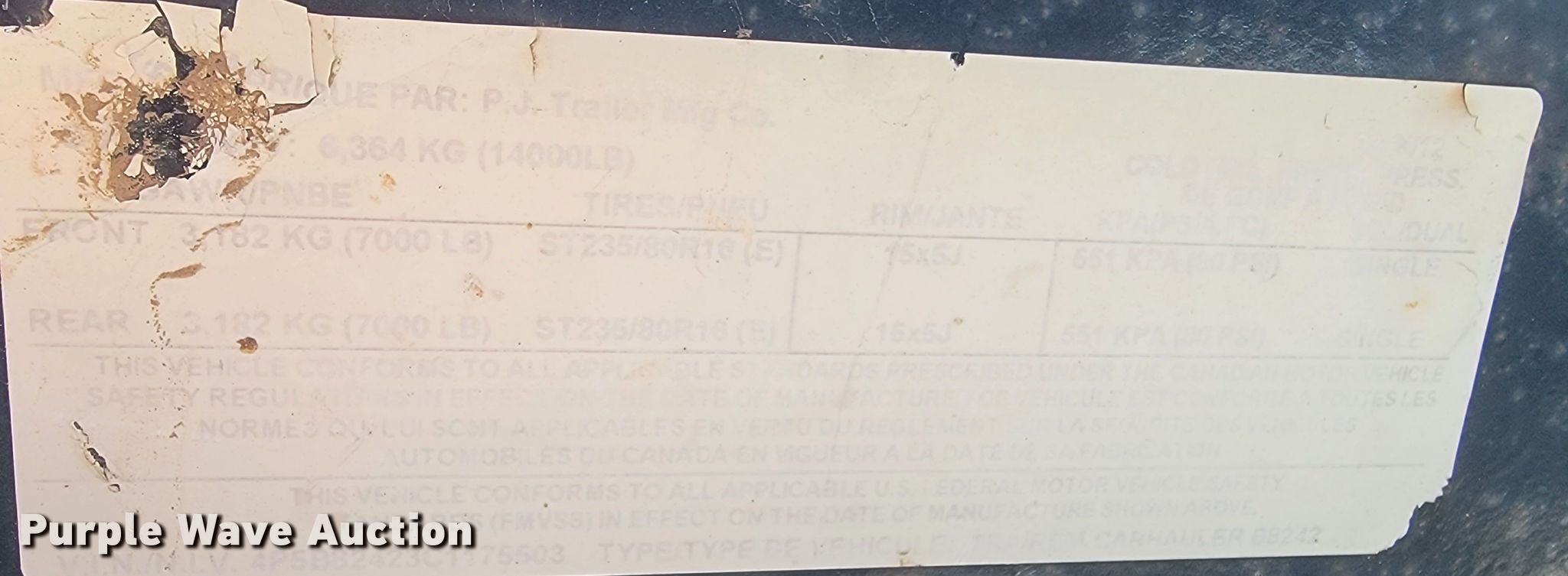 2012 PJ B8242 equipment trailer. VIN: 4P5B82423C1175503. Dimensions Overall: 29' L x 102" W, Deck: 24' L x 102" W, Ramps: Manual Length: 4' 10". Features Deck type: Wood. Chassis Ball hitch: 2 5/16", Landing gear: Single, Suspension: Spring, Brakes: Electric, Axles: Tandem, GVWR: 14,000 lbs, GAWR: 7,000 lbs. Tires Steel wheels, Size: ST235/80R16. South Dakota title. Title distribution may be delayed up to 14 days from verification of funds. BT Construction LLC. 1149 South Foster Street. Mitchell, SD 57301