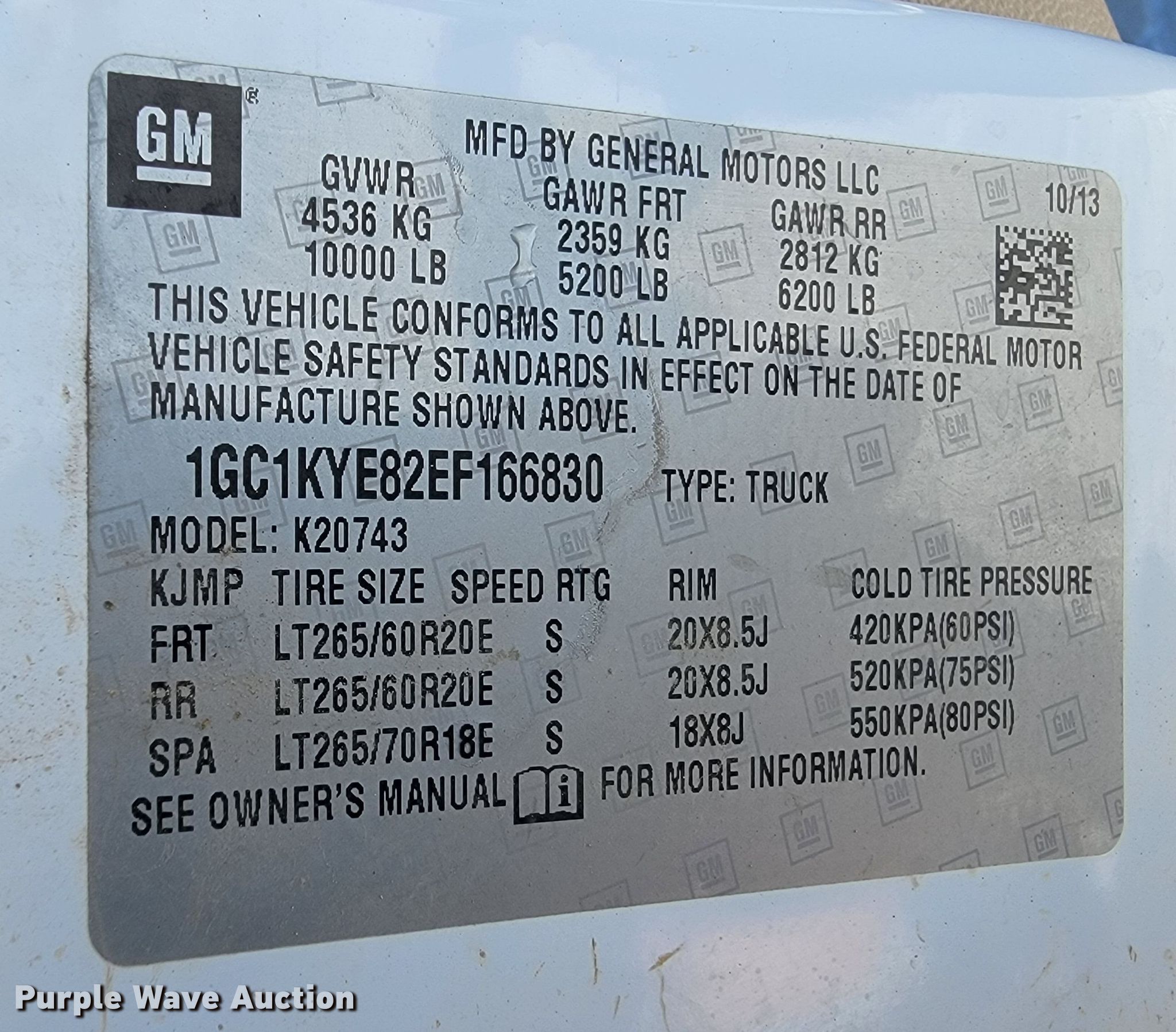 2014 Chevrolet 2500HD LTZ Crew Cab pickup truck. Miles: 225,894 on odometer, VIN: 1GC1KYE82EF166830. Engine Displacement: 6.6L V8 OHV, Cylinders: 8, Fuel type: Diesel. Transmission Automatic, Four wheel drive. Interior AC, Heat, Seat: Power driver, Power passenger, Power windows, Power locks, Cruise control, Backup camera, Powered sunroof. Features Hitch: Gooseneck. Tires Size: LT275/65R20. Notes Windshield chipped or cracked. South Dakota title. Title distribution may be delayed up to 14 days from verification of funds. Efraimson Electric Inc. 19295 438th Avenue. Bryant, SD 57221