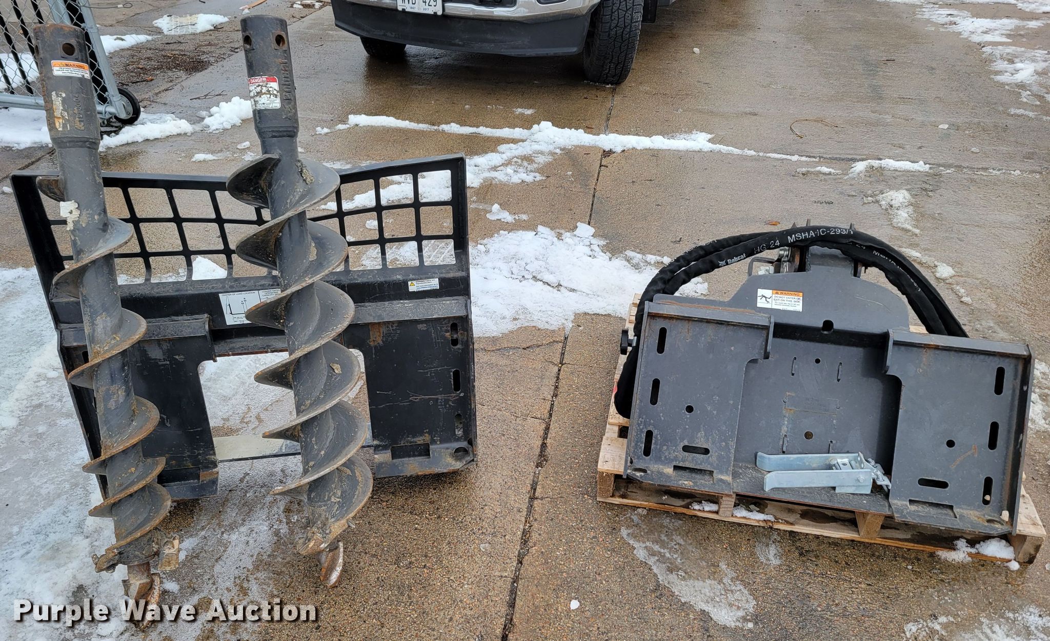 2021 Bobcat MT100 compact utility loader. Hours: 187 on meter, Serial: B52P12752. Engine Kubota D902-EF01, Displacement:.898L, Cylinders: 3, Fuel type: Diesel, kW: 18.2. Transmission Hydrostatic. Operators station Bucket control: Hand. Features Auxiliary hydraulics, Quick coupler: Manual, Bucket Bobcat, Width: 36", Cutting edge: Weld-on, Teeth: Bolt-on, Forks Bobcat, Length: 36". Tracks Width: 7". 2020 Bobcat 10 skid steer auger Serial: 879912794, (2) auger bits 50" L x 6"D, 50" L x 9"D. Aksarben Fence and Gate. 4542 South 40th Street. Omaha, NE 68107