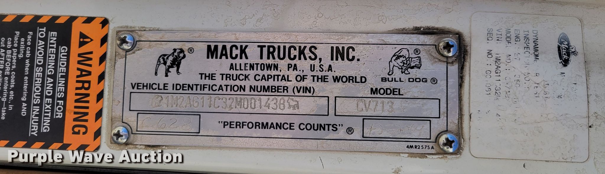 Take a look at this used 2002 Mack CV713 Granite dump truck being sold on March 2nd, 2023 in the SOLD! March 02 Construction Equipment Auction made by Mack. Take a look at all of the item information below or take a look at similar auctions for Construction Trucks.